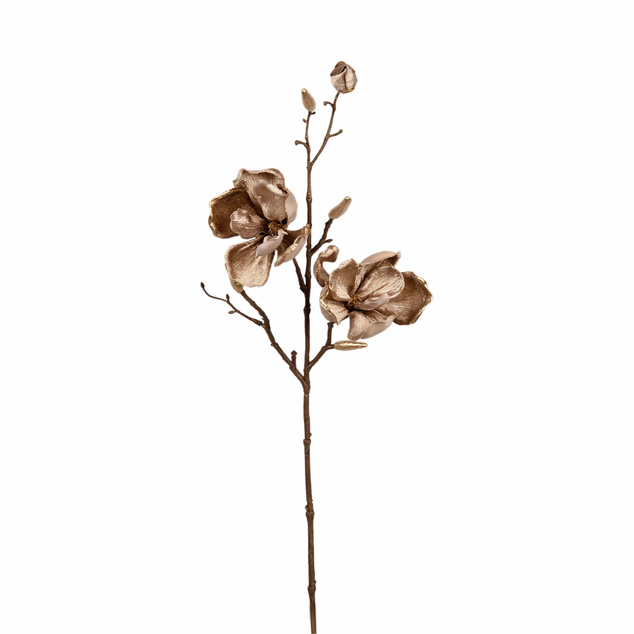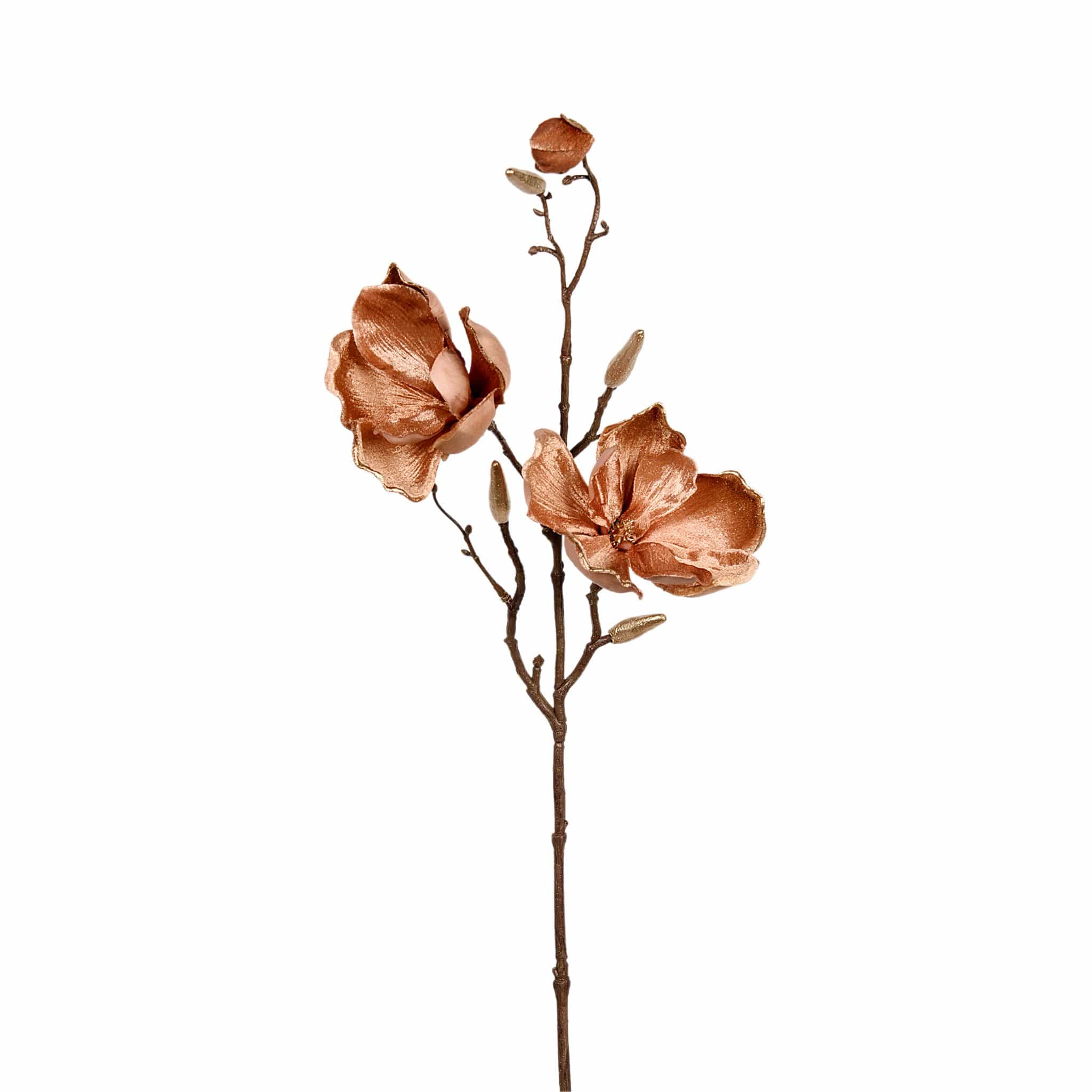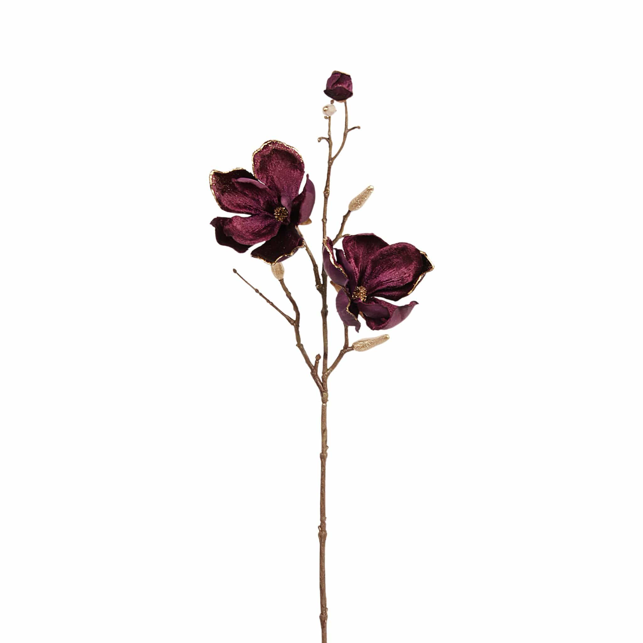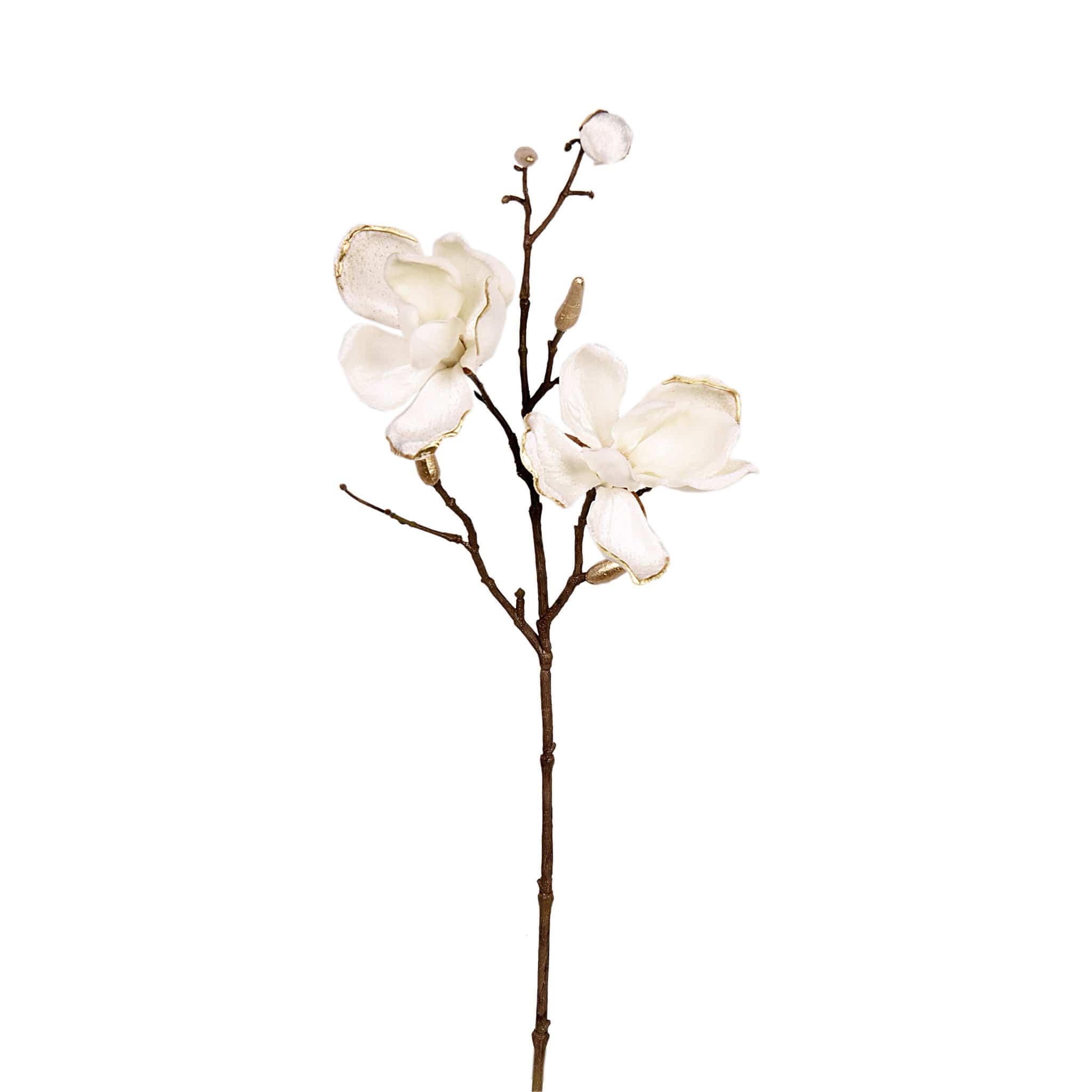 فرع زهر ماغنوليا بتشطيب مخملي يعطي مظهراً ناعماً وأنيقاً، مثالي لإضفاء لمسة رقيقة على ديكور المنزل أو المكتب. تصميمه يناسب العرض منفرداً في مزهرية أو كمكوّن في تنسيقات زهرية مختلفة.