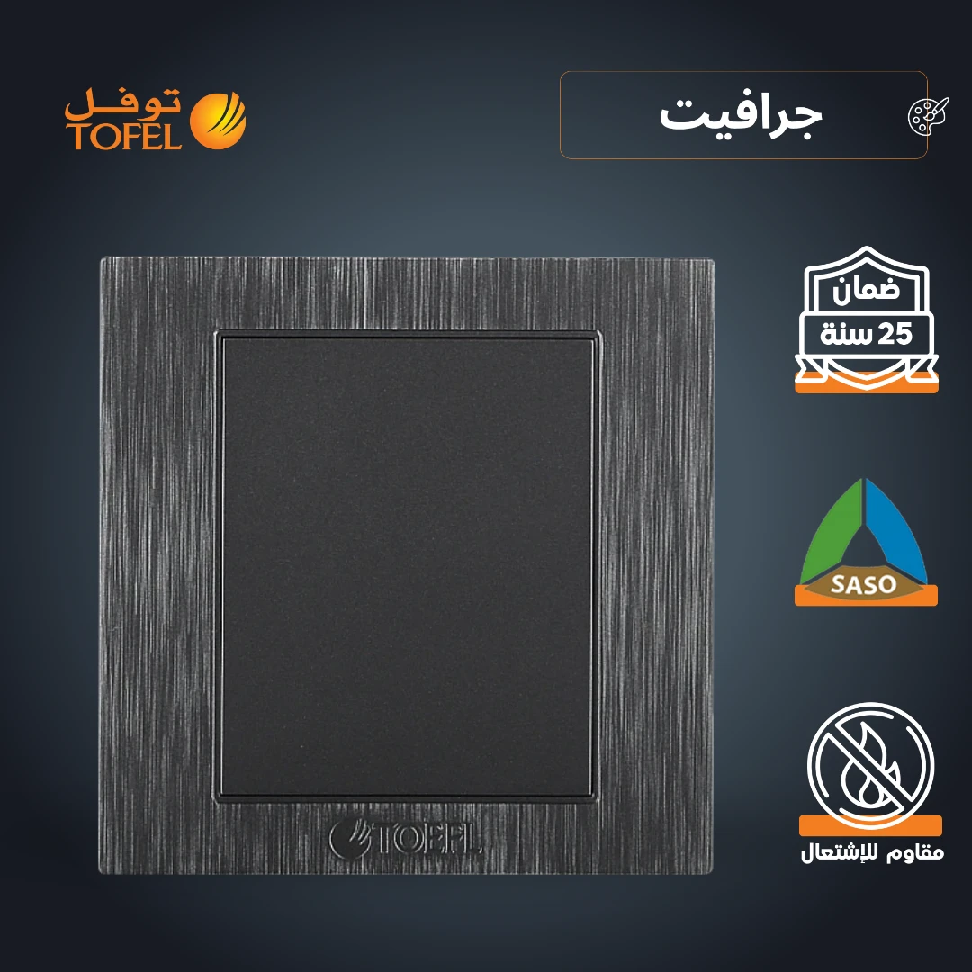 غطاء عملي وأنيق لمخارج الكهرباء غير المستخدمة، بلون جرافيت داكن من طراز توفل. يمنح مظهراً مرتباً وآمناً للجدران ويعزز من تناسق الديكور الداخلي.
