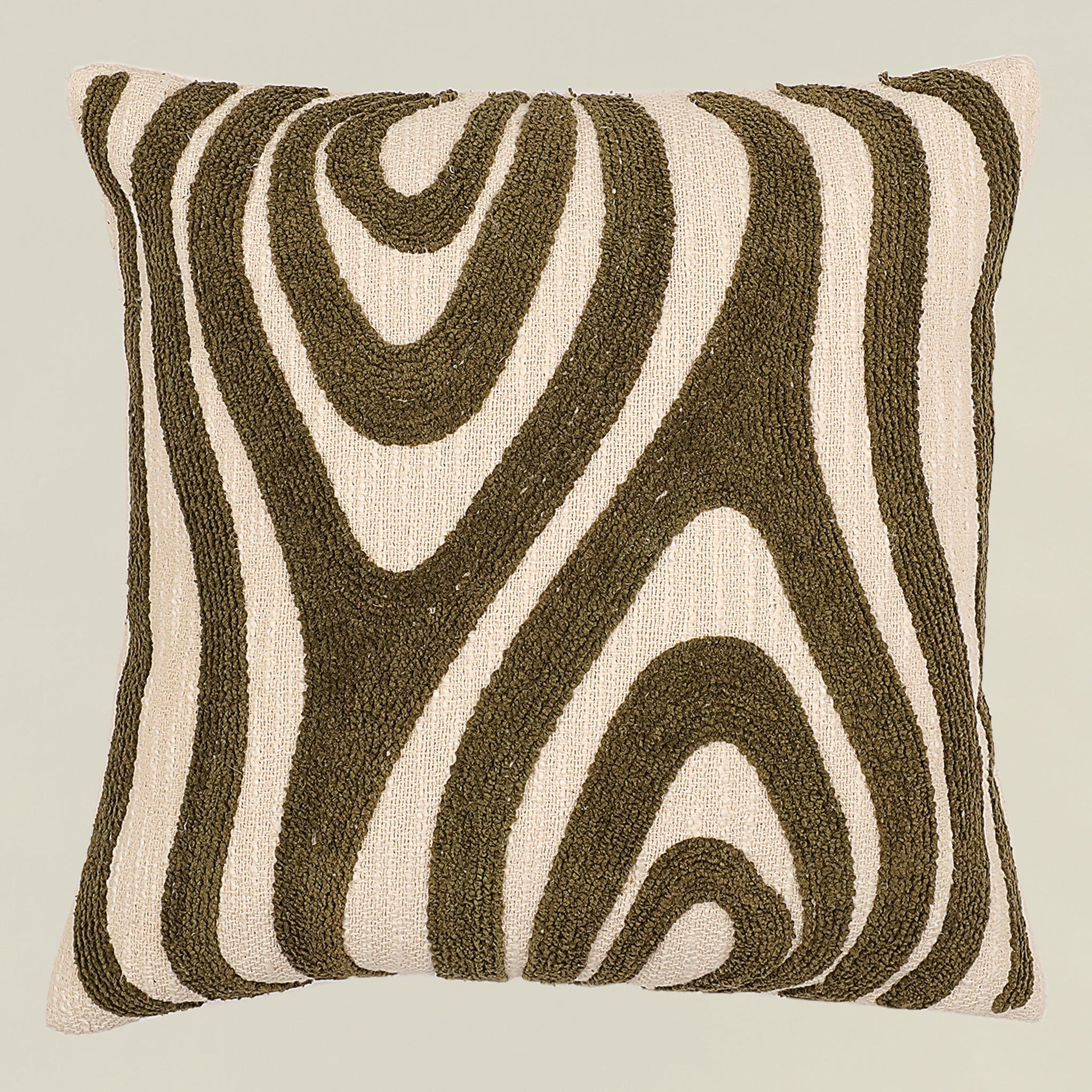 غطاء وسادة أنيق بلونين (عاجي وأخضر زيتوني)، مصنوع من قماش قطني ناعم ومزخرف بتطريز حبل الشنيل ليمنح القطعة مظهراً فاخراً وملمساً مريحاً.