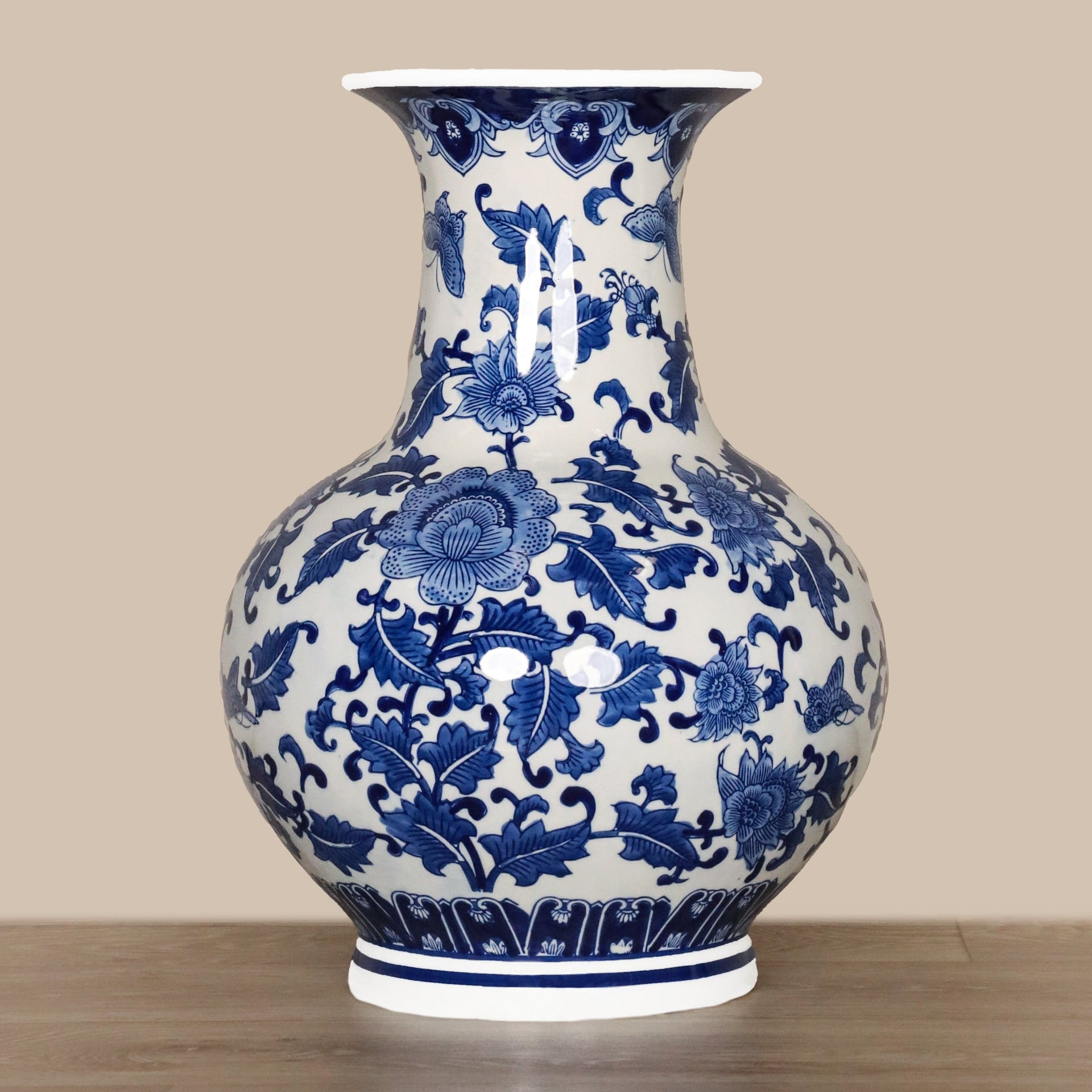 مزهرية خزفية أنيقة باللونين الأبيض والأزرق، تصميم يناسب ديكور المنزل أو المكتب ويعرض الزهور بشكل جذاب.