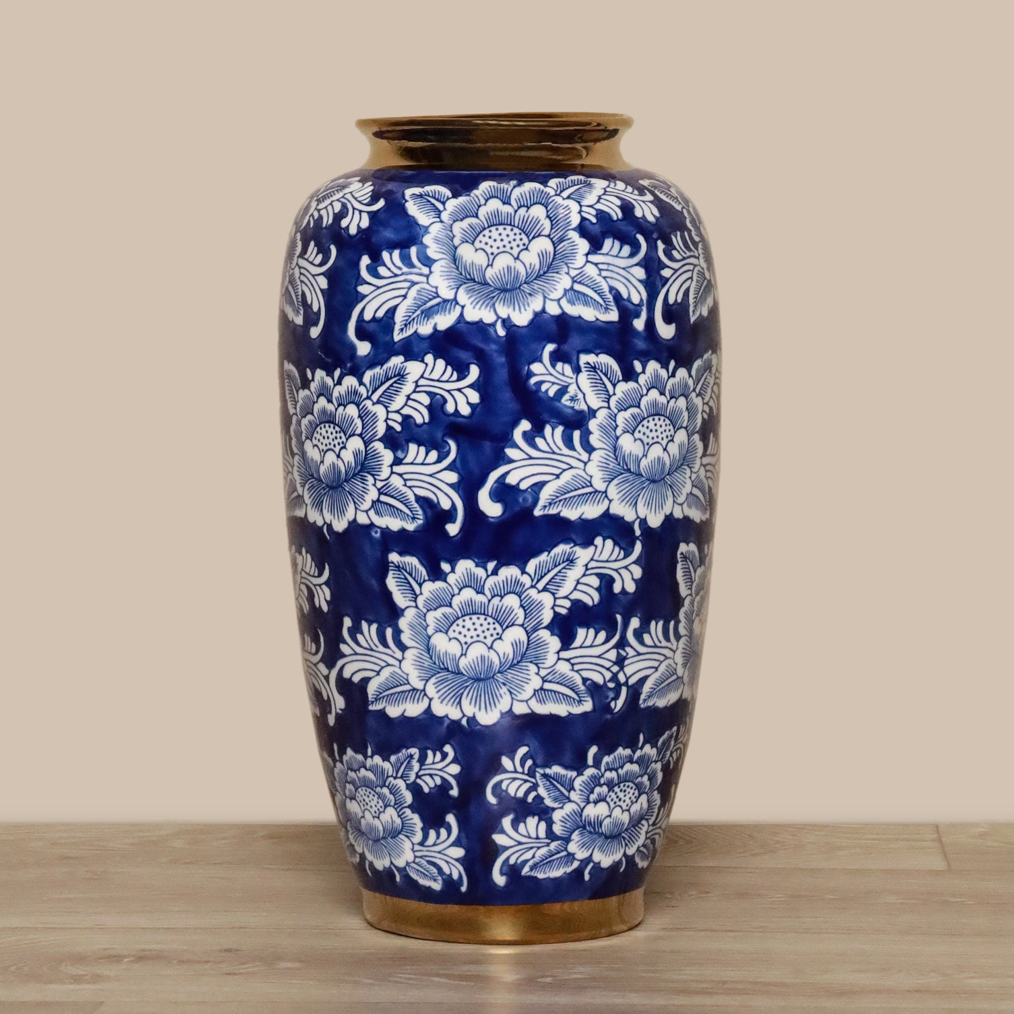 وصف:مزهرية خزفية أنيقة باللونين الأبيض والأزرق، تصميم كلاسيكي يناسب ديكور المنزل والمكتب ويعرض الأزهار الطازجة أو الصناعية بشكل جميل.
