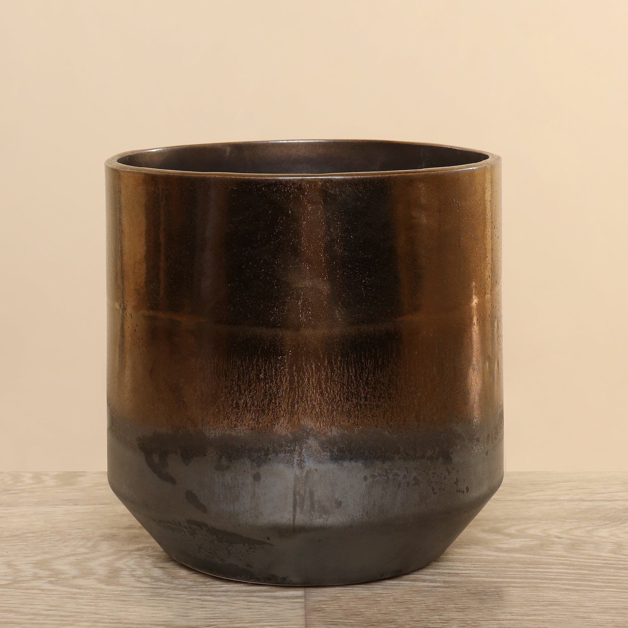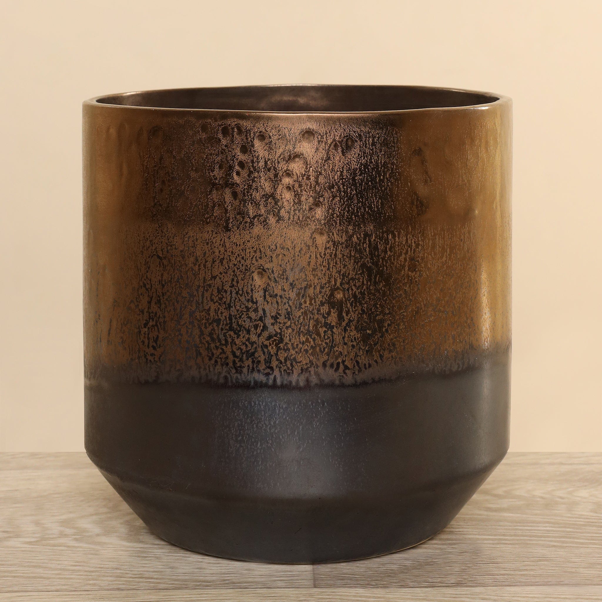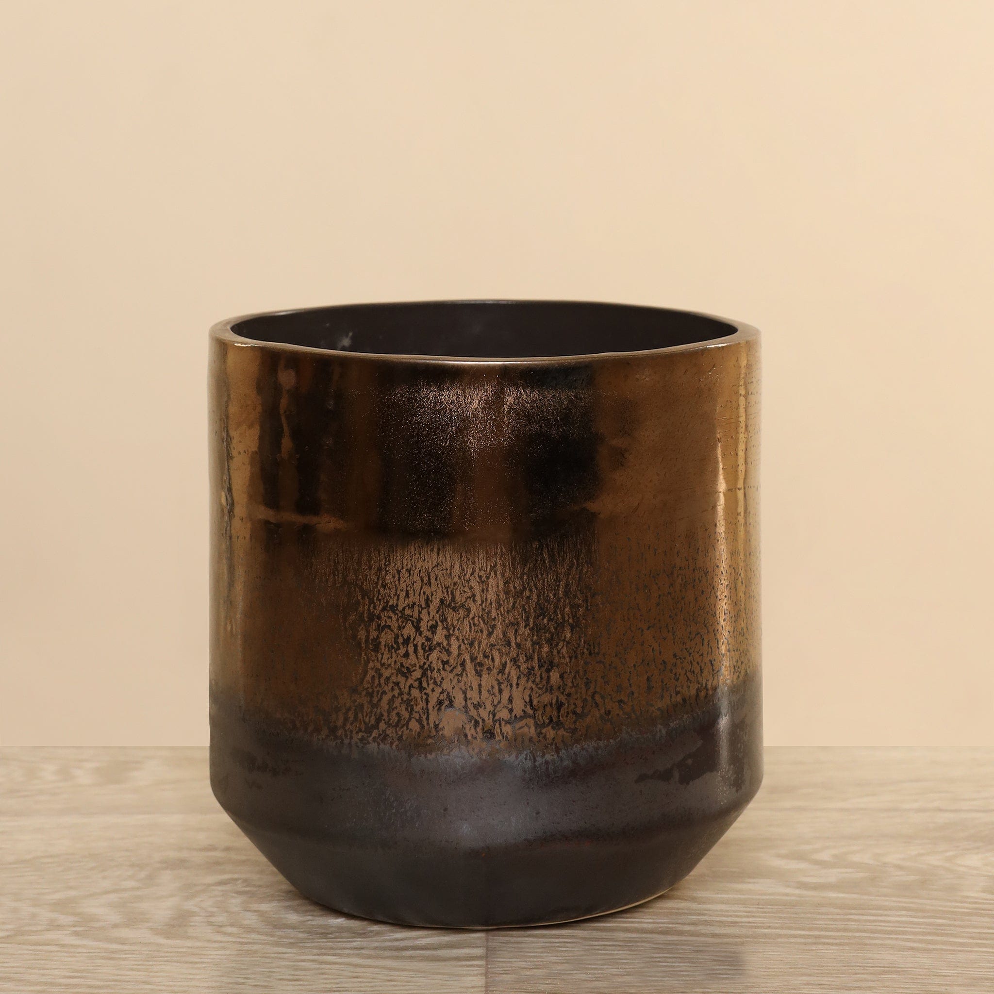 مزهرية خزفية أنيقة بلمسة برونزية دافئة تضيف طابعاً مميزاً لأي مساحة داخلية. تصميم متوازن يجمع بين البساطة والرقي، مثالية لتنسيق الزهور الطبيعية أو الصناعية كعنصر ديكور مركز.