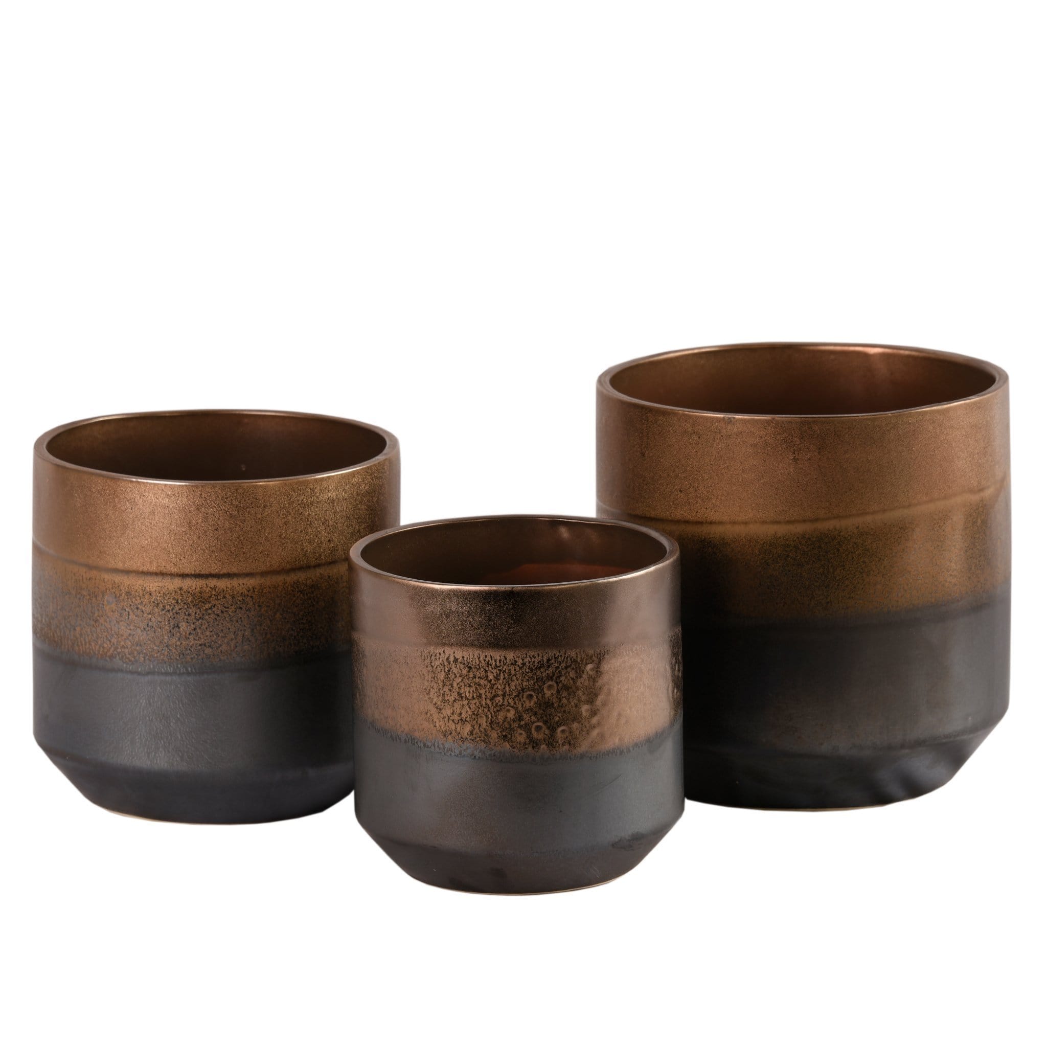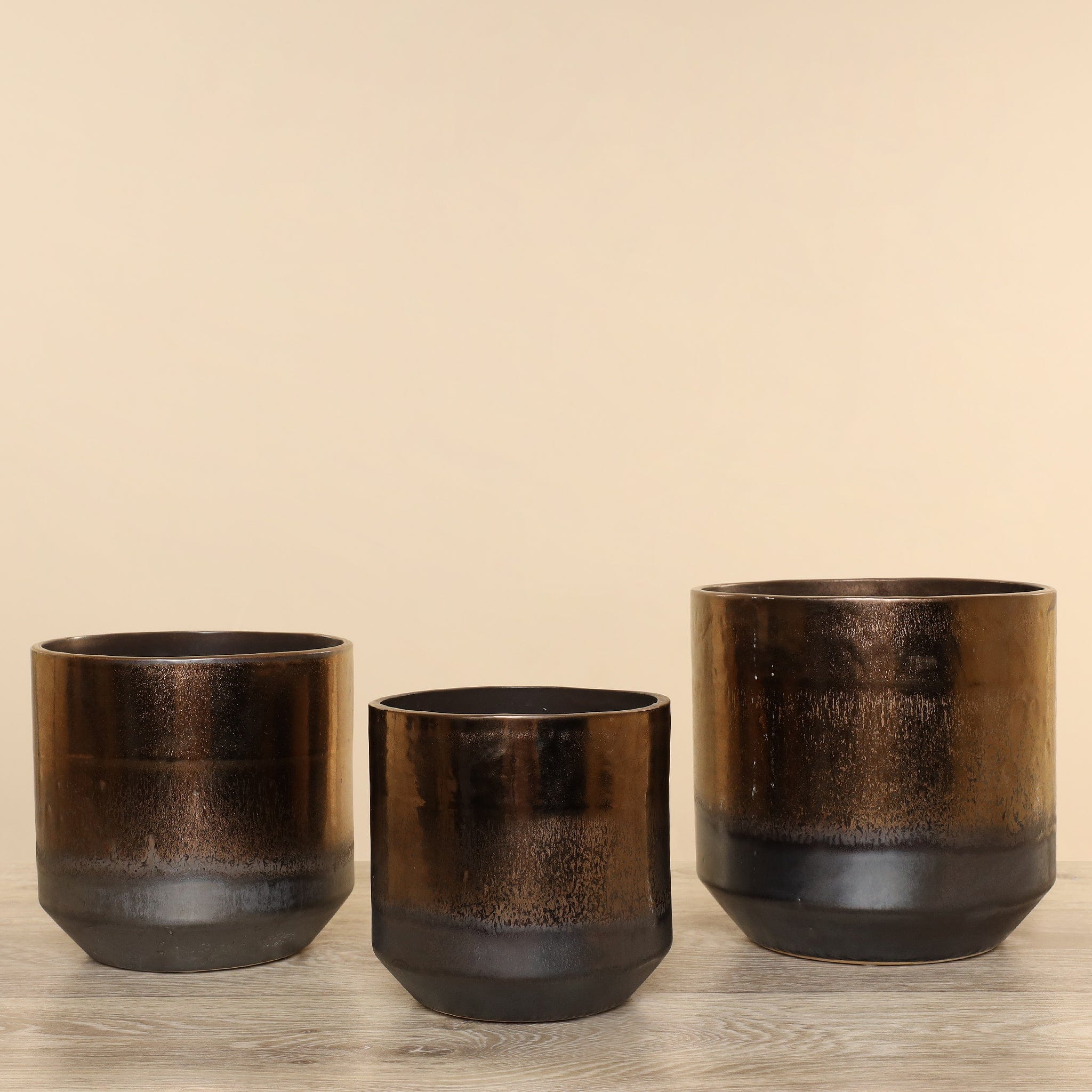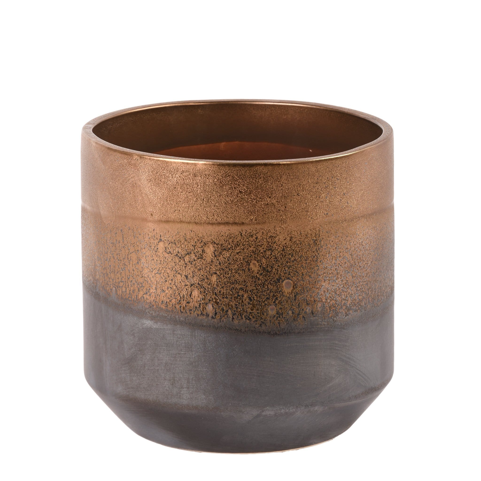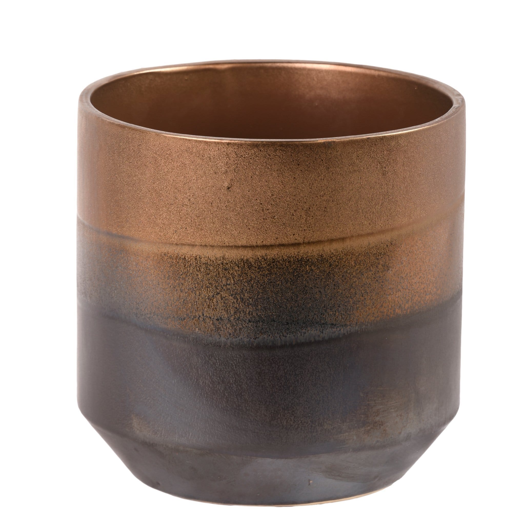 مزهرية خزفية أنيقة بلمسة برونزية دافئة تضيف طابعاً مميزاً لأي مساحة داخلية. تصميم متوازن يجمع بين البساطة والرقي، مثالية لتنسيق الزهور الطبيعية أو الصناعية كعنصر ديكور مركز.