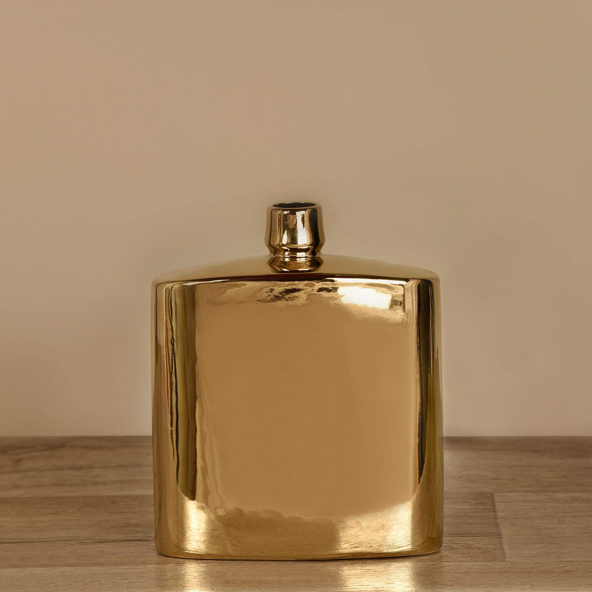 تجمع هذه المزهرية بين البساطة والأناقة لتصبح قطعة ديكور مميزة في أي مكان. سطحها الذهبي — سواءً أكان مصقولاً بلمعانٍ لامع أو ناعماً الملمس — يعكس الضوء بطريقة جذابة، مانحاً محيطه توهّجاً دافئاً ومشرقاً. حضورها الأنيق يلفت الأنظار ويضفي لمسة فنية راقية تكمل تناغم أي تصميم داخلي.