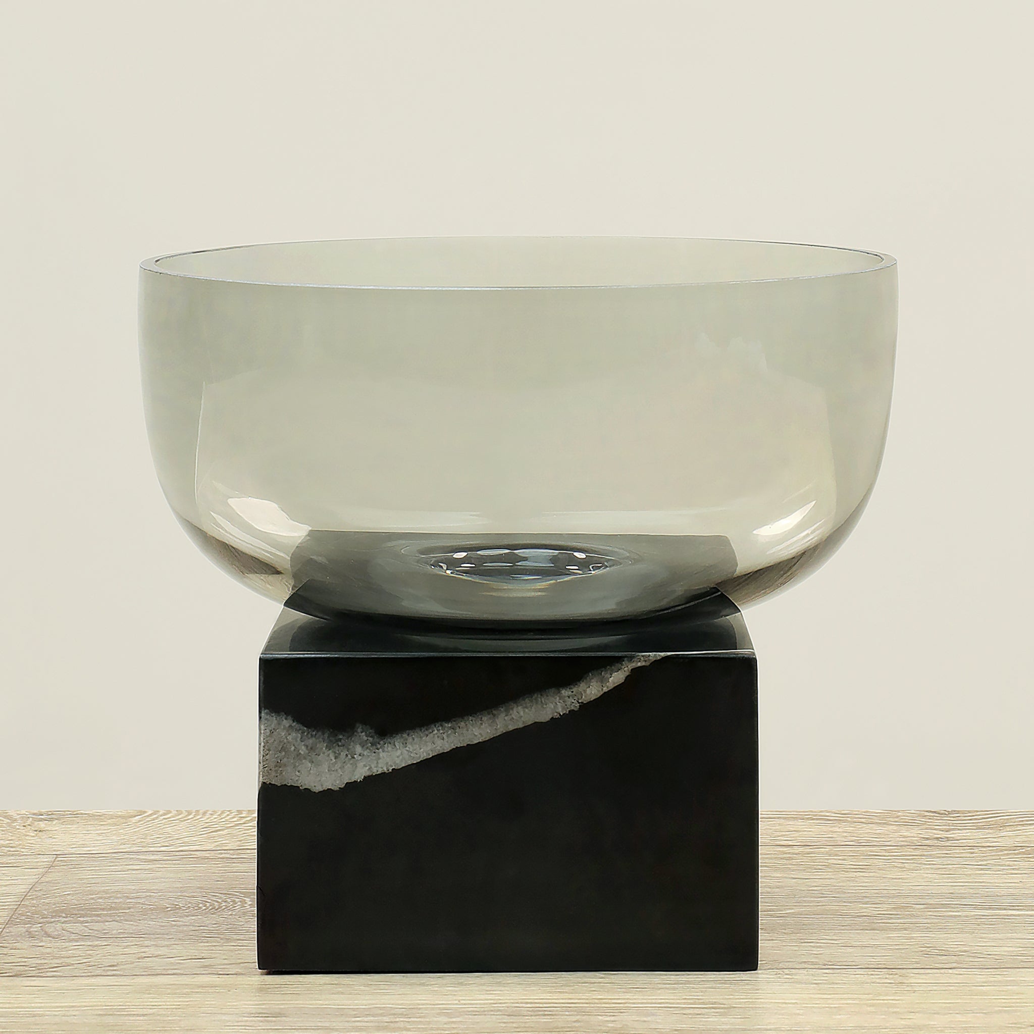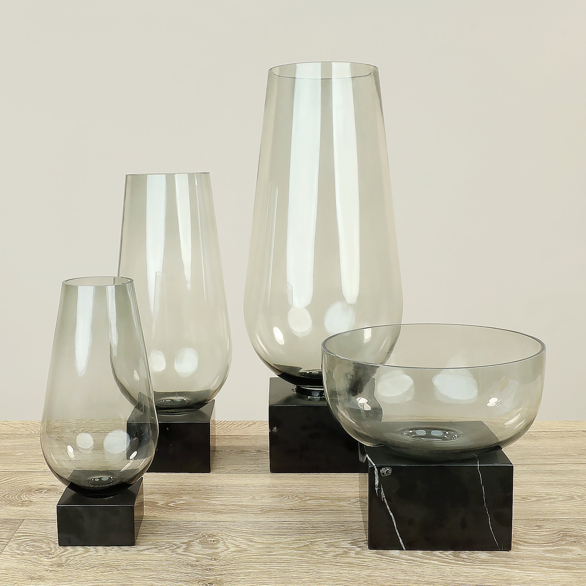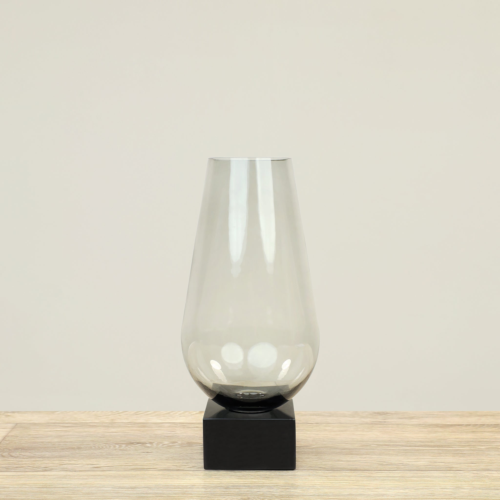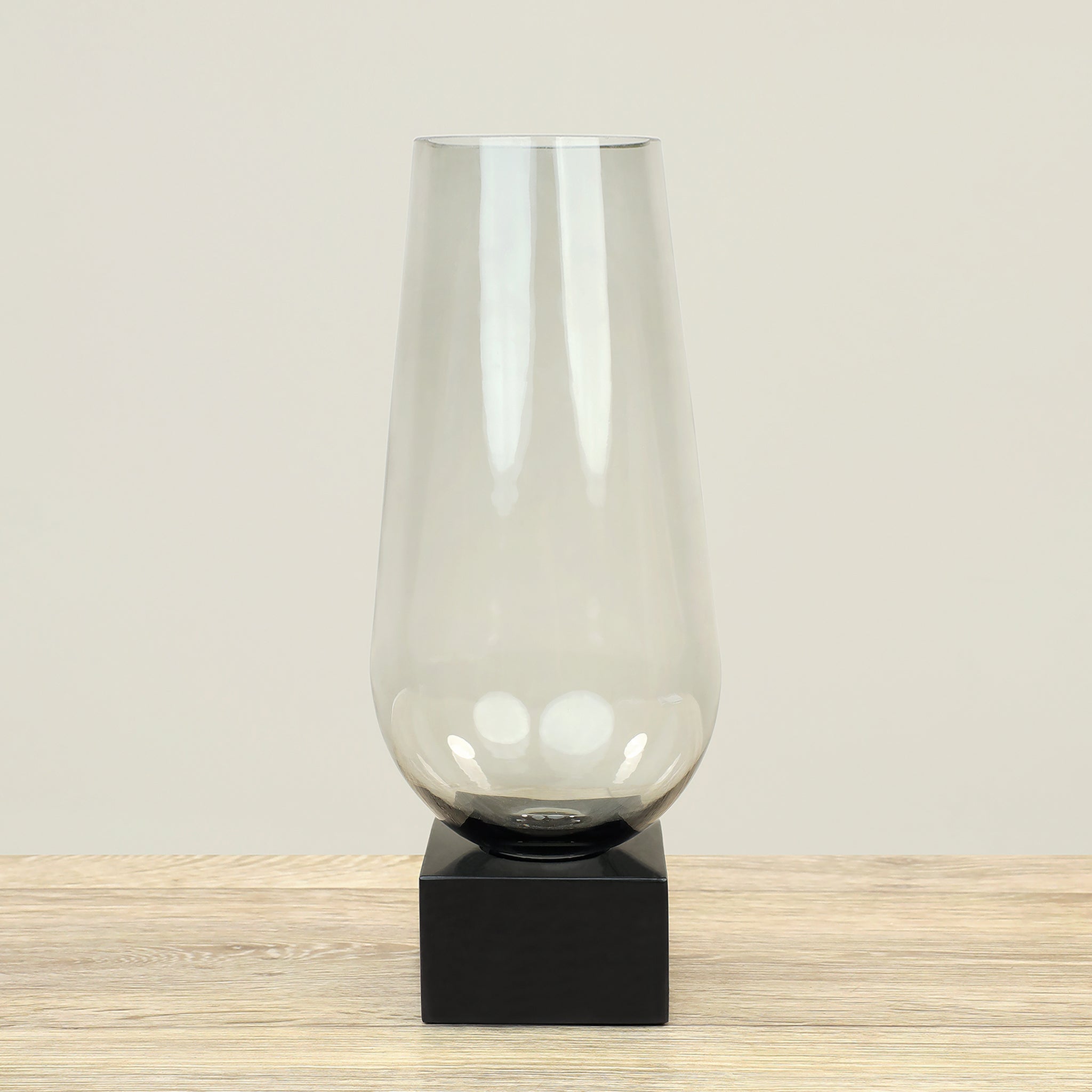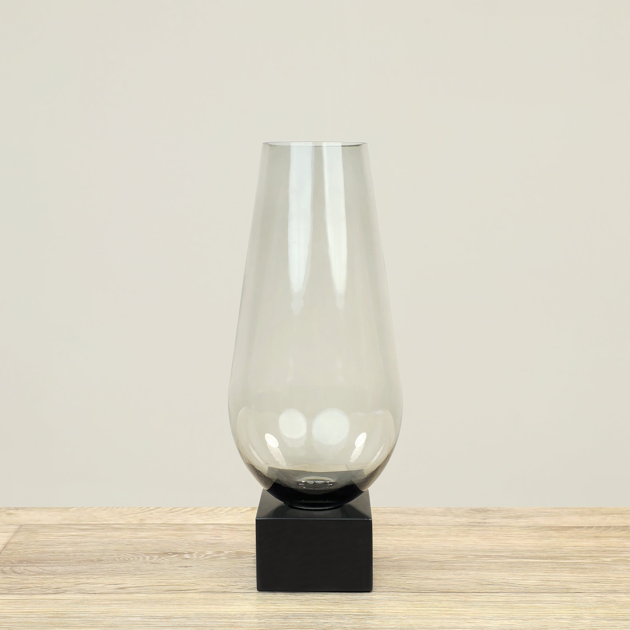 مزهرية أنيقة باللون الأسود تجمع بين قاعدة من الرخام وجسم زجاجي شفاف، تصميم عصري يضفي لمسة فاخرة على أي مساحة داخلية سواء كانت غرفة المعيشة، غرفة النوم أو المكتب.