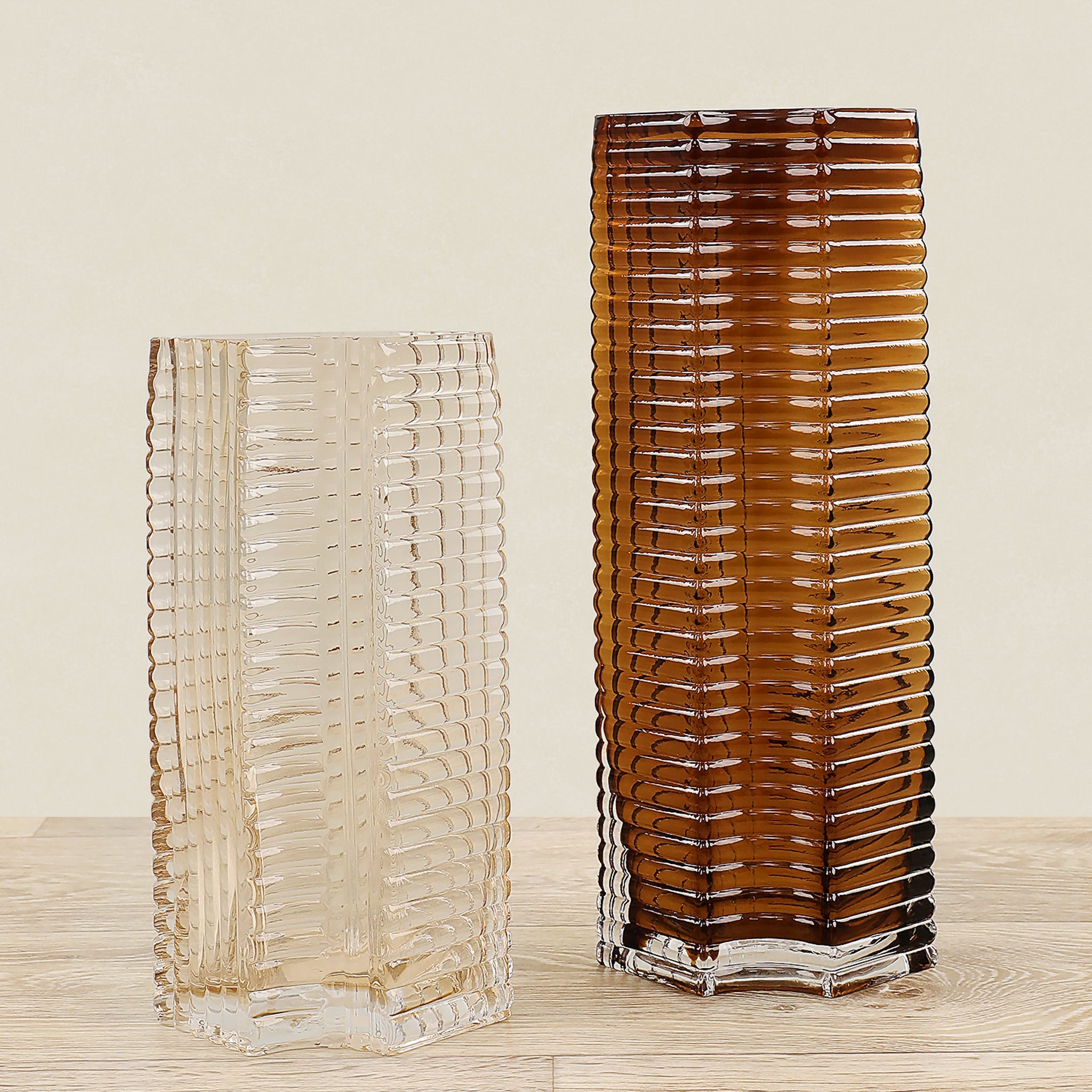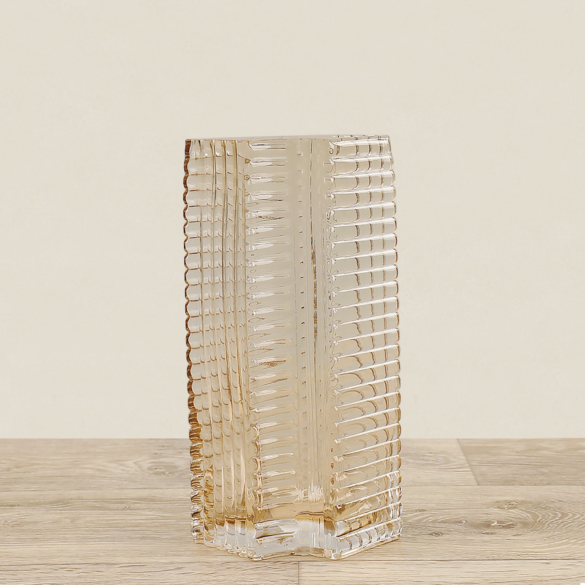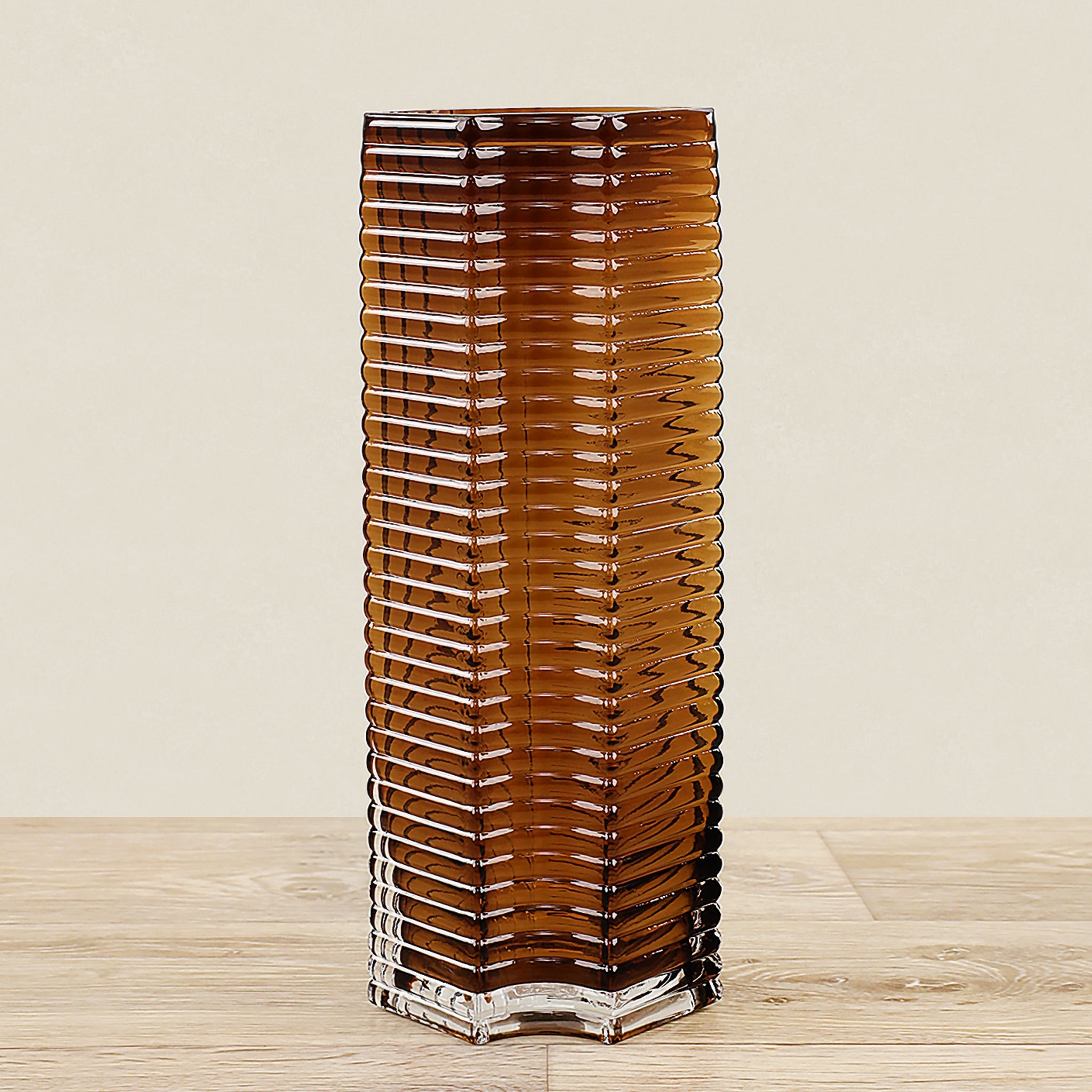 مزهرية أنيقة مصنوعة من الزجاج بألوان سلمون فاتح وأسود، تضيف لمسة جمالية ودافئة إلى أي مساحة داخلية.