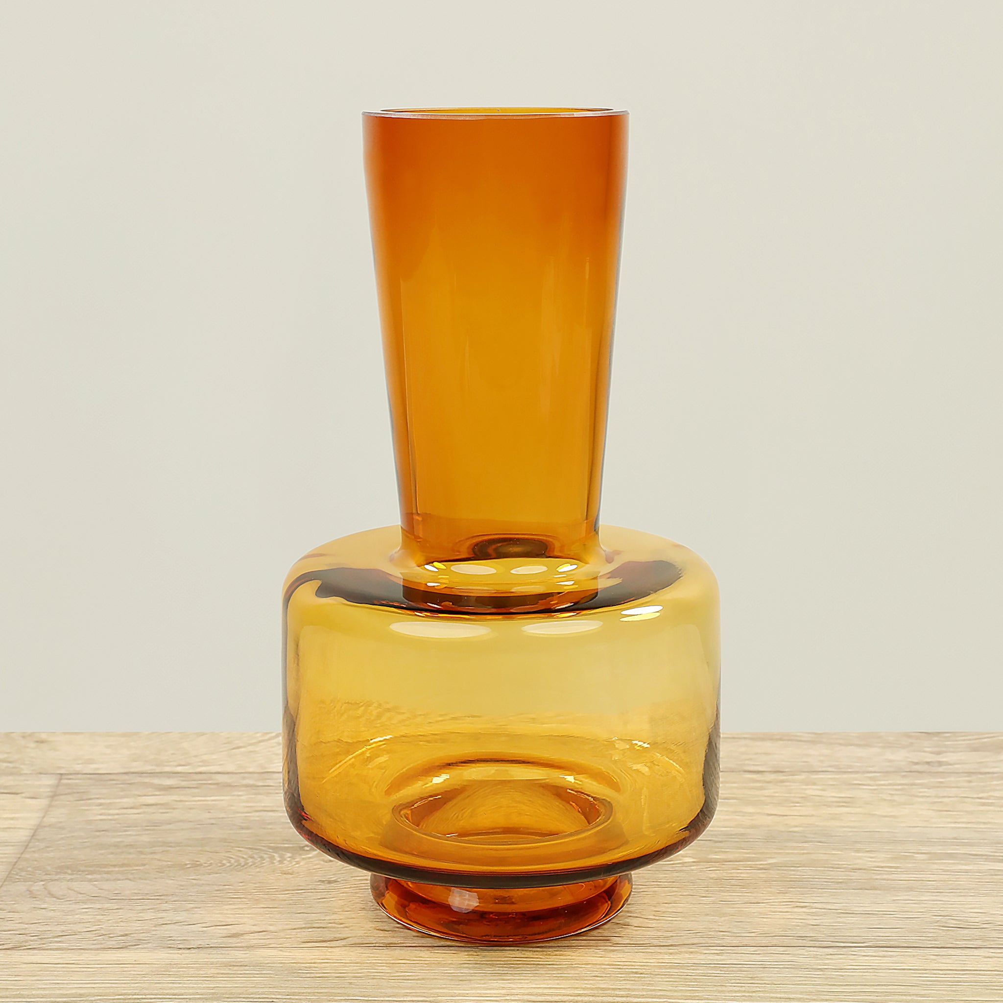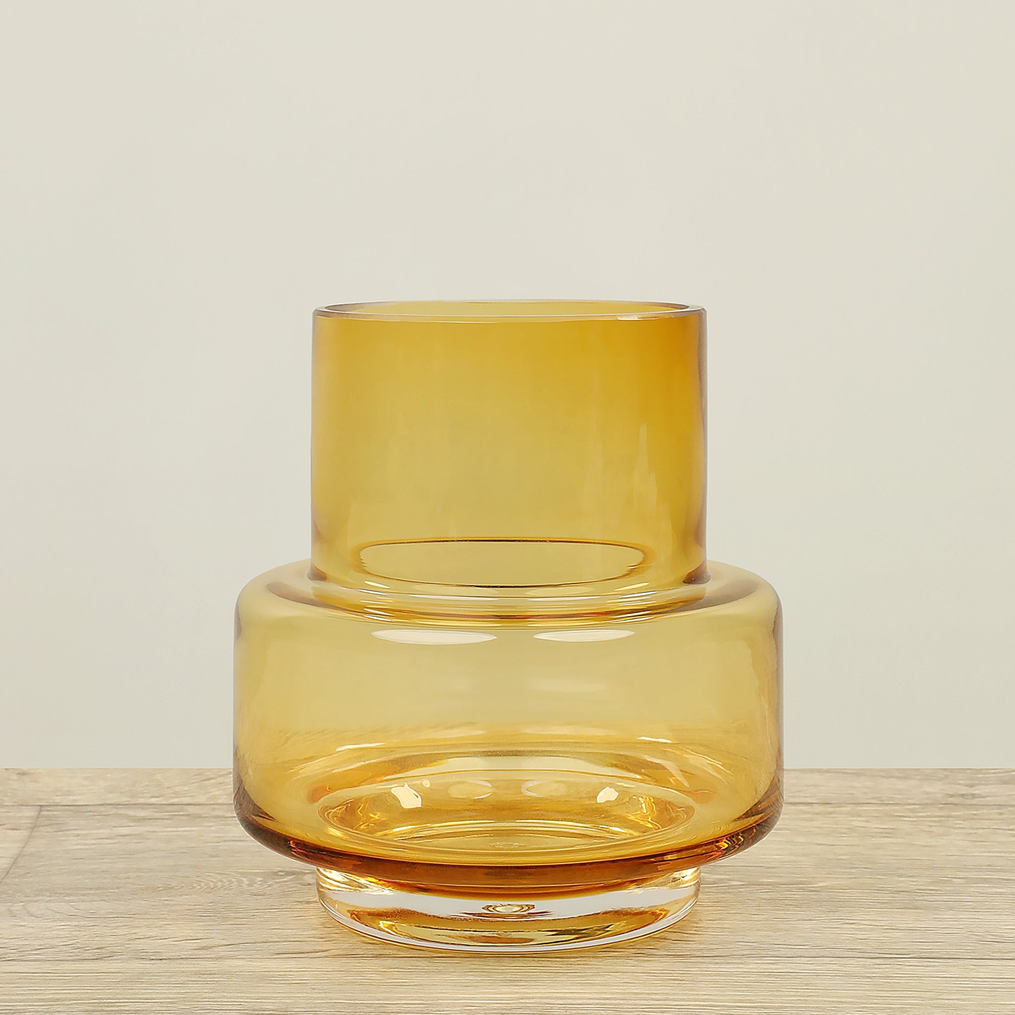 مزهرية مصنوعة من الزجاج بتشطيب أنيق ولون بيج فاتح يمنح المكان مظهراً هادئاً وعصرياً. مثالية لوضع باقات من الأزهار الطبيعية أو الزهور الصناعية كعنصر زخرفي أنيق.
