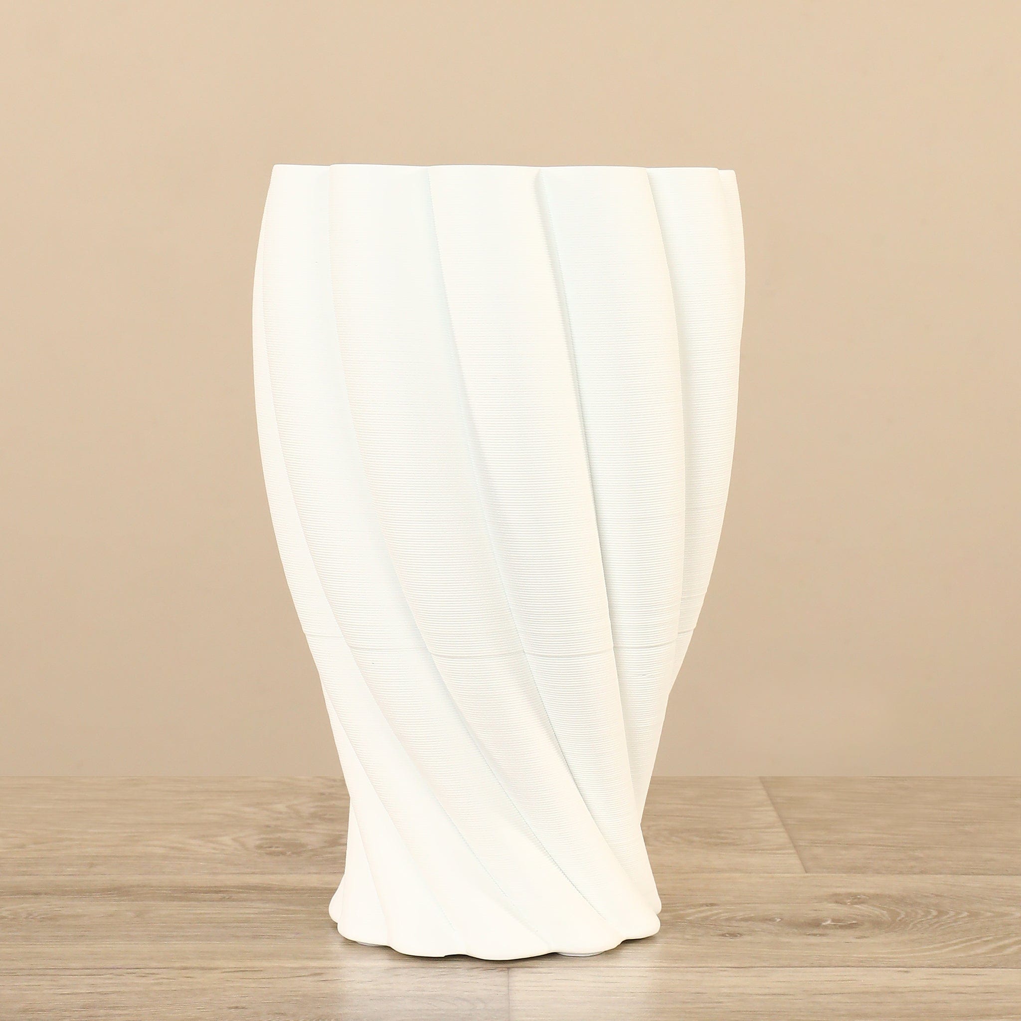 مزهرية سيراميكية تجمع بين البساطة والأناقة العصرية. تصميمها الأسطواني الطويل المطوي يضيف لمسة انسيابية رقيقة تبرز في أي مساحة داخلية، سواء على الرفوف أو على الطاولات.
