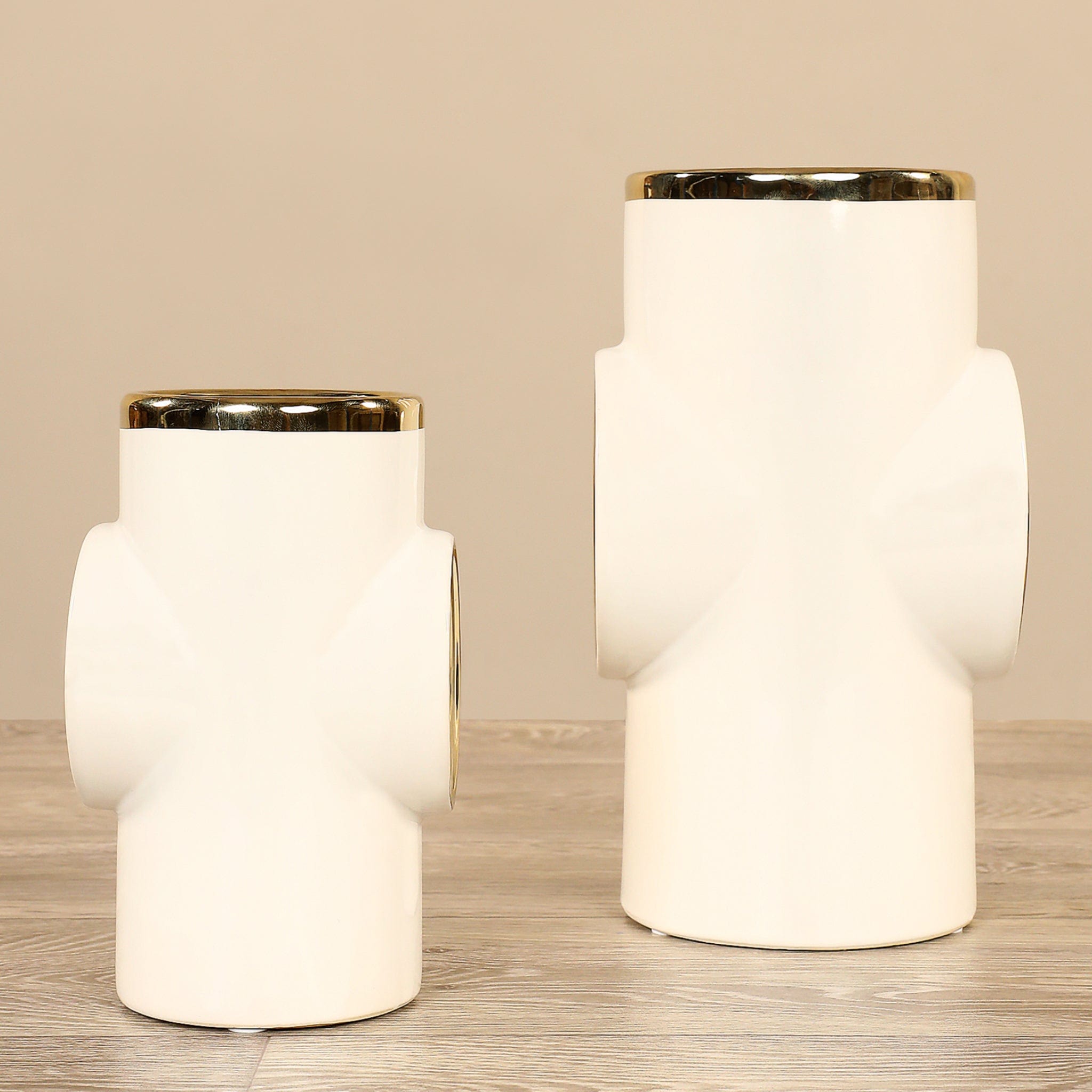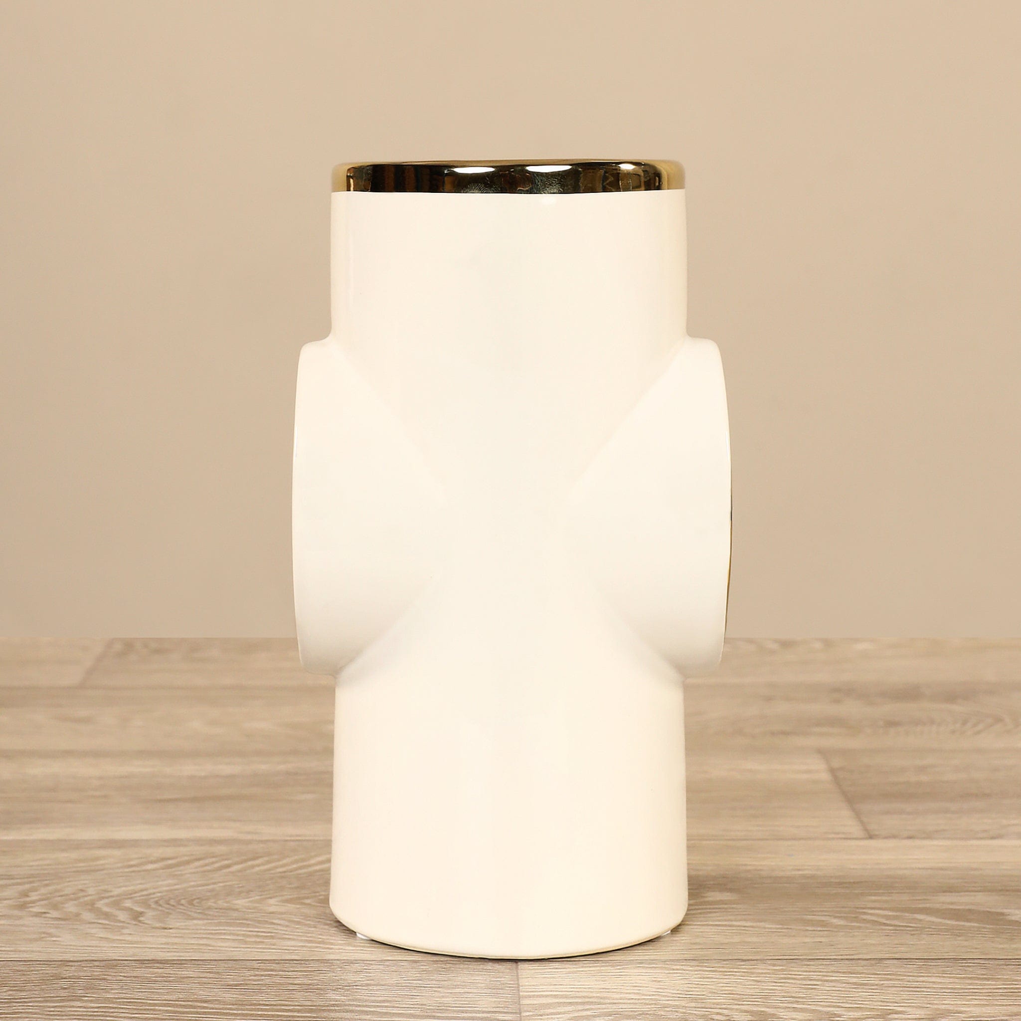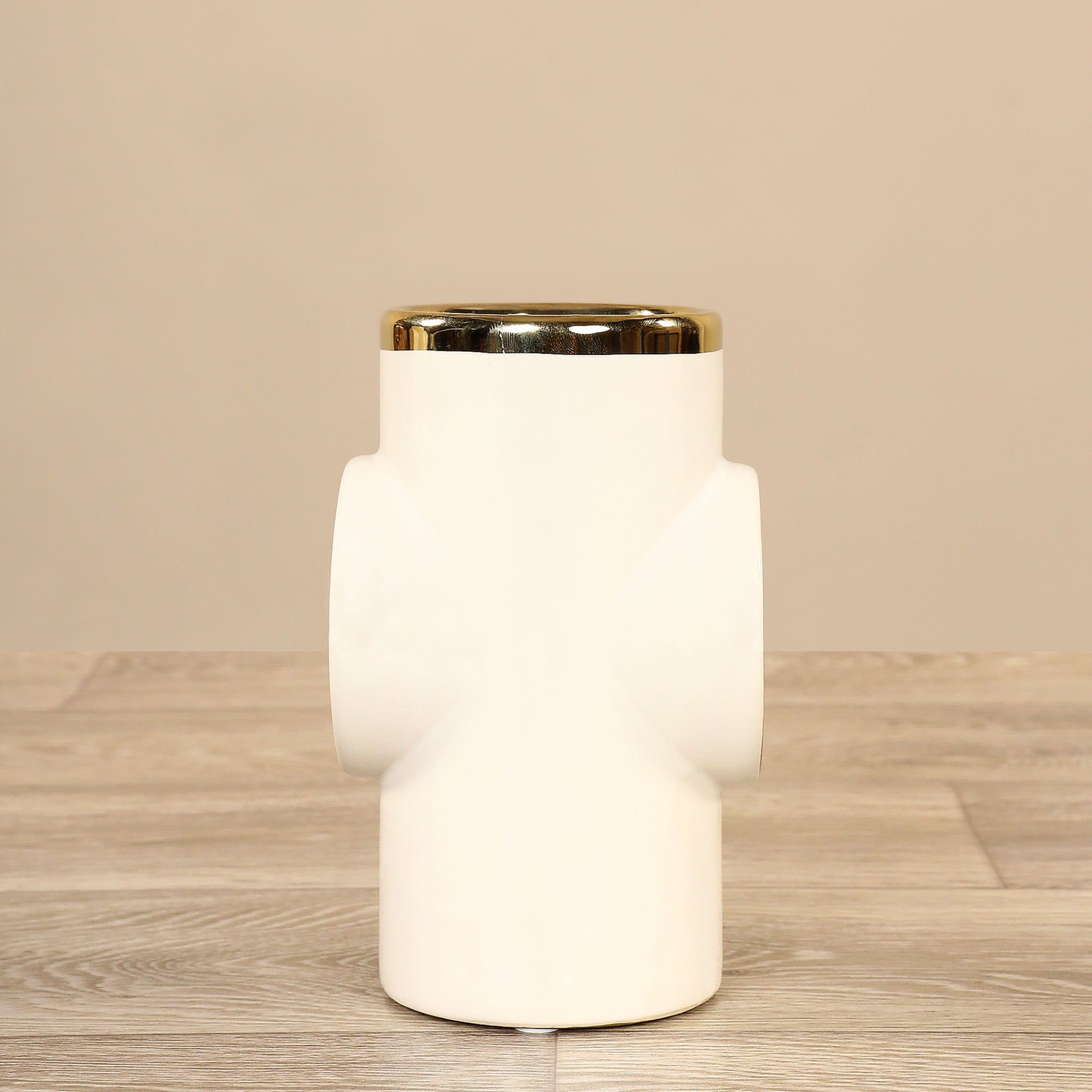 مزهرية أنيقة بتصميم أبيض مع تفاصيل باللون الذهبي، مصنوعة من السيراميك عالي الجودة. قطعة ديكور مثالية لإضفاء لمسة فاخرة على منزلك أو مكتبك.
