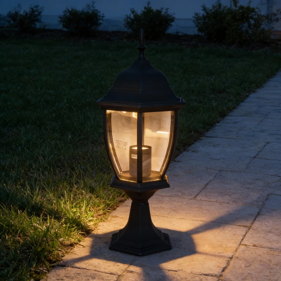 • فانوس جلاسي أسود وسط: فانوس أرضي بعمود إنارة قصير يؤطر حدود الممشى بوضوح.