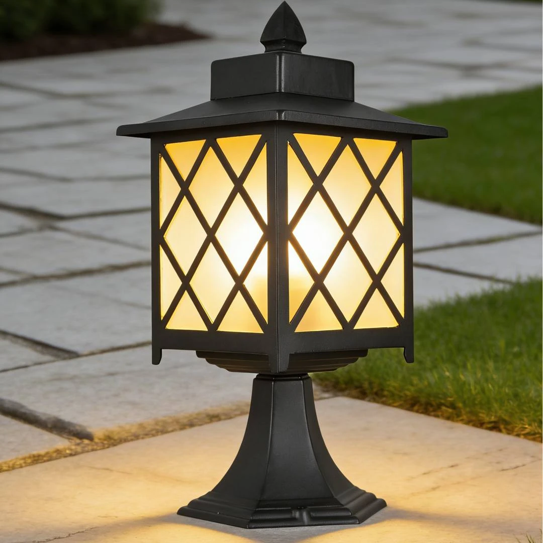 عمود إنارة أرضي قصير يعكس فخامة بسيطة تناسب الواجهات الحديثة. فانوس جلاسي بتصميم أنيق وغطاء أسود يمنح محيط منزلك لمسة جمالية ودافئة في المساء.