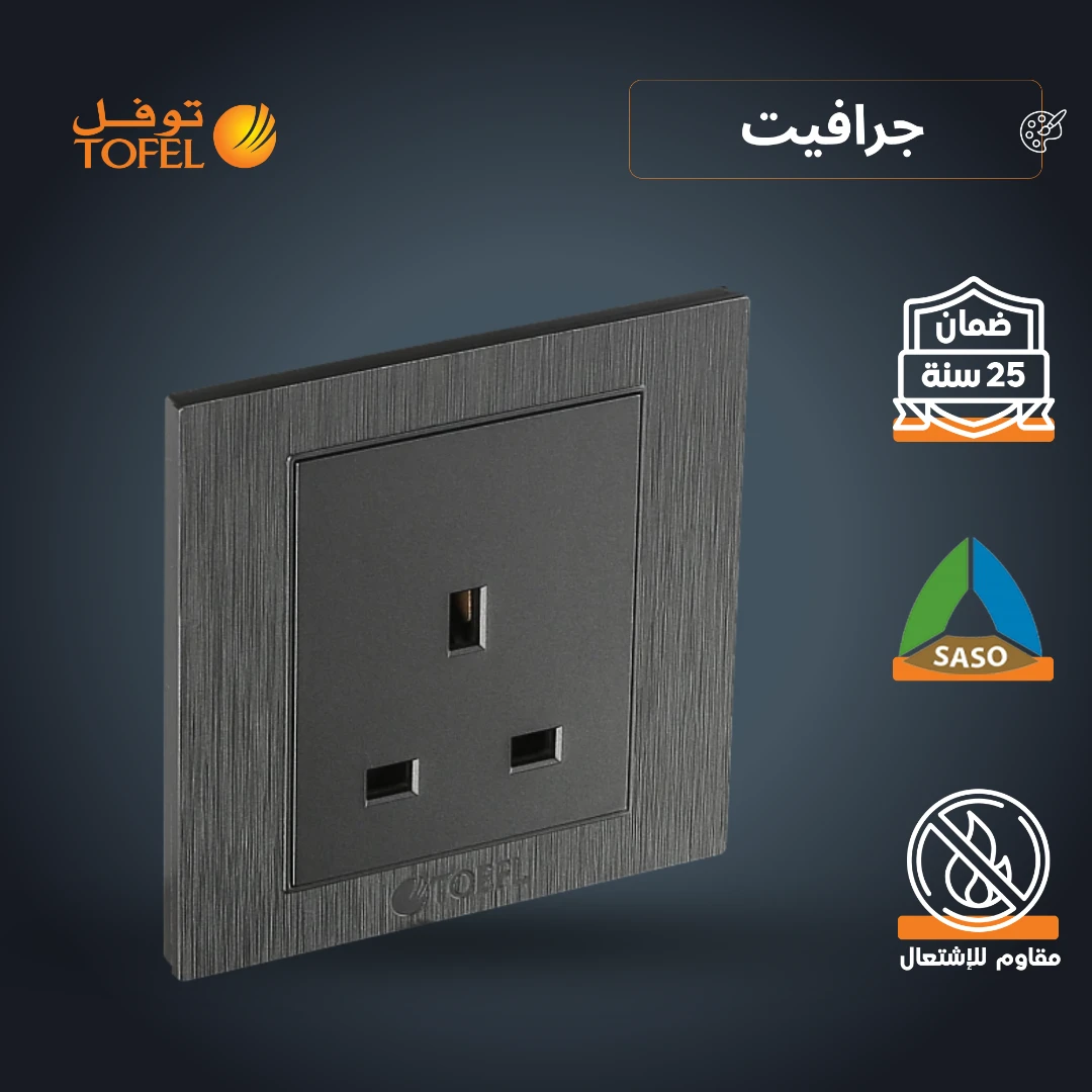 فيش جداري ثلاثي بتصميم عصري بلون جرافيت من شركة توفل. يجمع بين المظهر الجمالي والمتانة، ويُستخدم لتوصيل الأجهزة الكهربائية بالمأخذ بسهولة وأمان في المنازل والمكاتب.