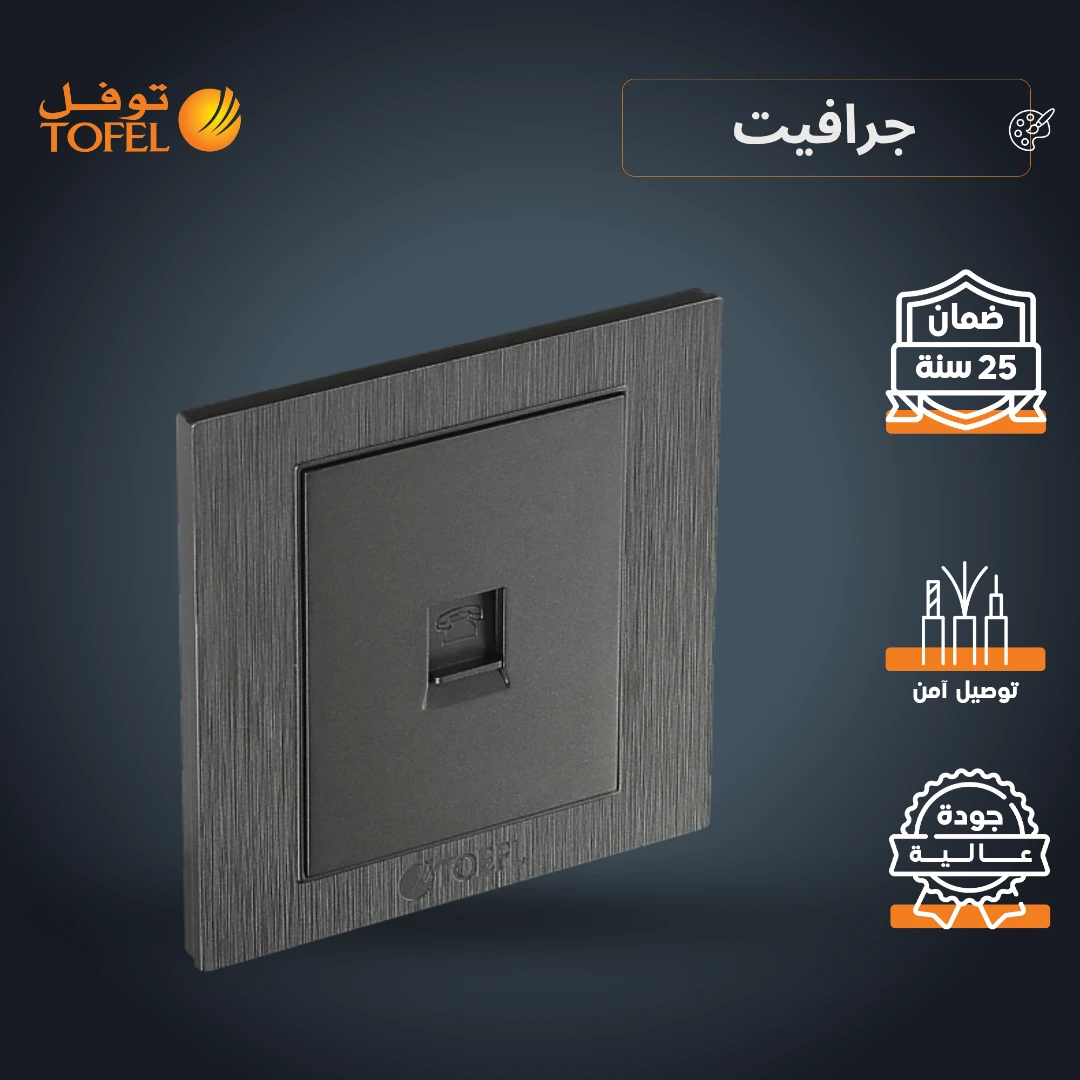 فيش منفذ هاتف مفرد بلون جرافيت توفل، مصمم لتوفير اتصال سريع وآمن بين أجهزة التحكم المركزية ومنافذ الهاتف. مناسب للاستخدام المنزلي والمكتبي، ويتميّز بمظهر عملي وأنيق يناسب الديكورات الحديثة.