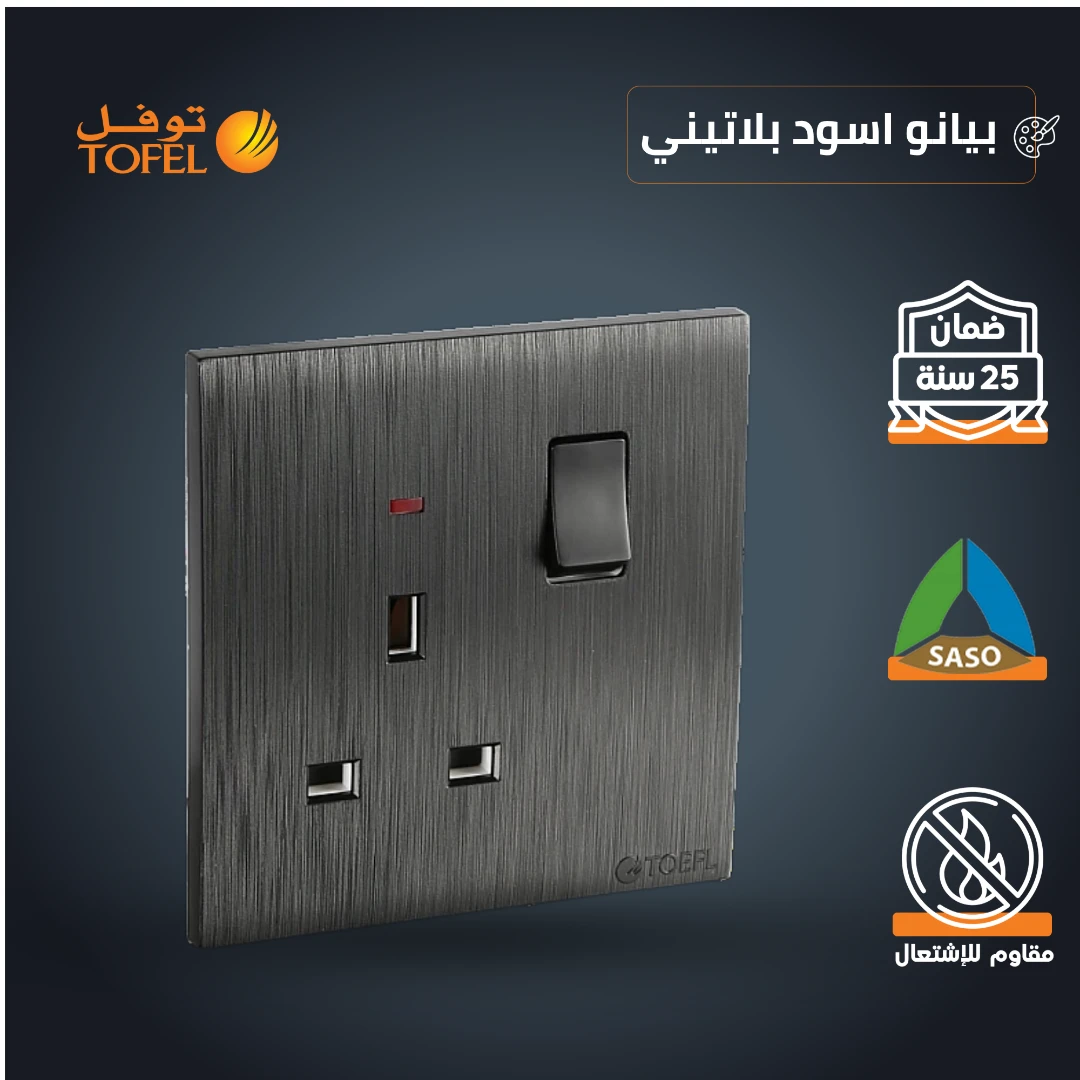 فيش ثلاثي مع مفتاح 13 أمبير — لون أسود بيانو بلاتيني