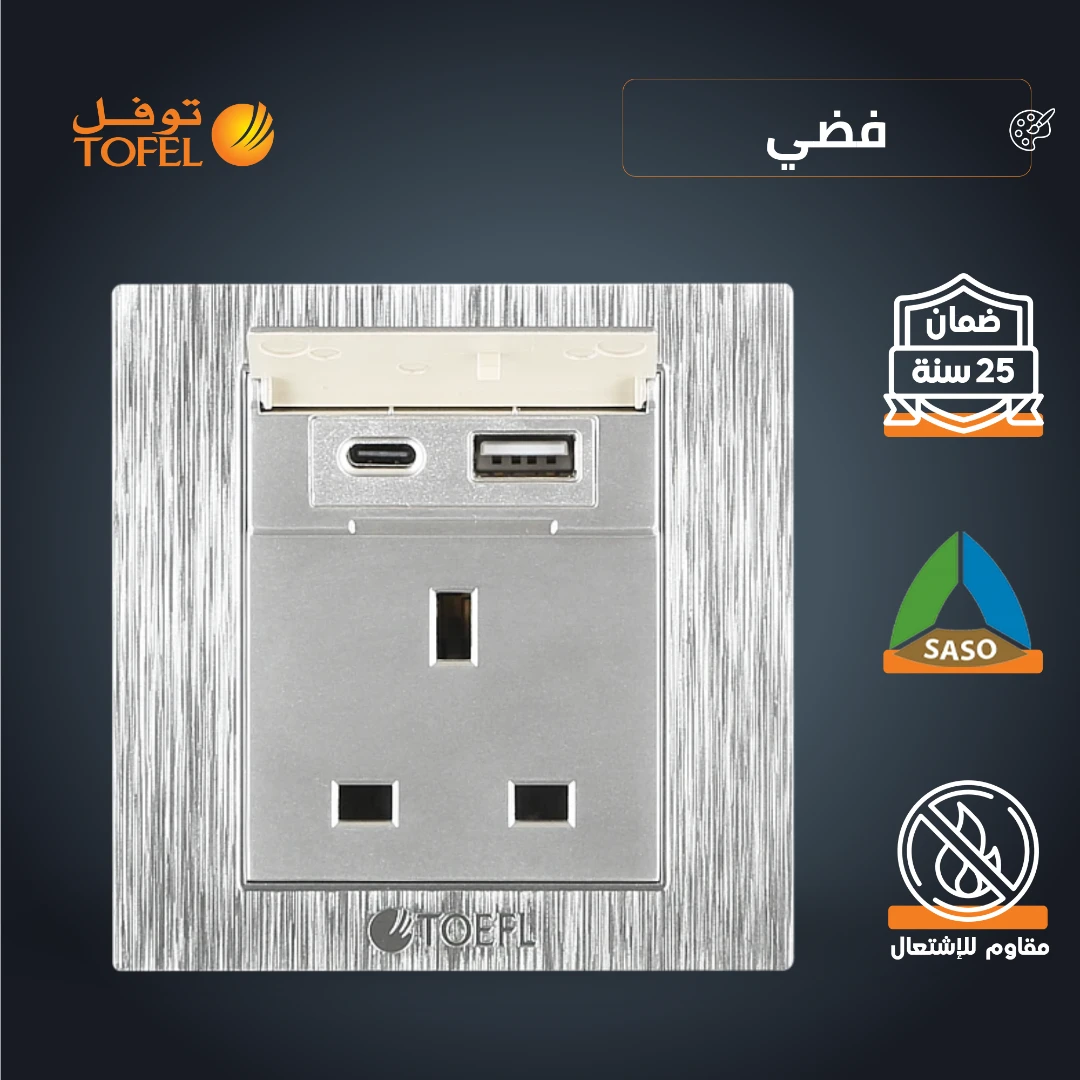 فيش ثلاثي مع منفذ يو اس بي USB ومنفذ تايب‑سي TYPE‑C — لون فضي توفل