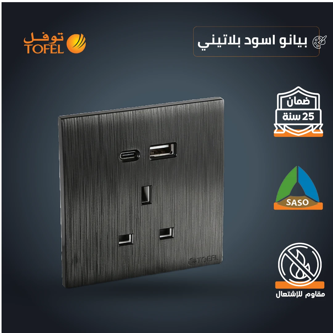 فيش ثلاثي مع منفذ USB ومنفذ Type-C — لون أسود بيانو بلاتيني