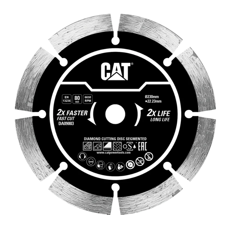 قرص القطع الماسي CAT DA09003 مقاس 9 بوصة مصمم للأعمال الشاقة ويقدّم أداءً موثوقًا عند التعامل مع الخرسانة والحجر ومواد البناء الصلبة. يعتمد الأداء العالي لهذا القرص على شرائح ألماسية متينة وموزعة بشكل يضمن سرعة قطع وديمومة أطول.
