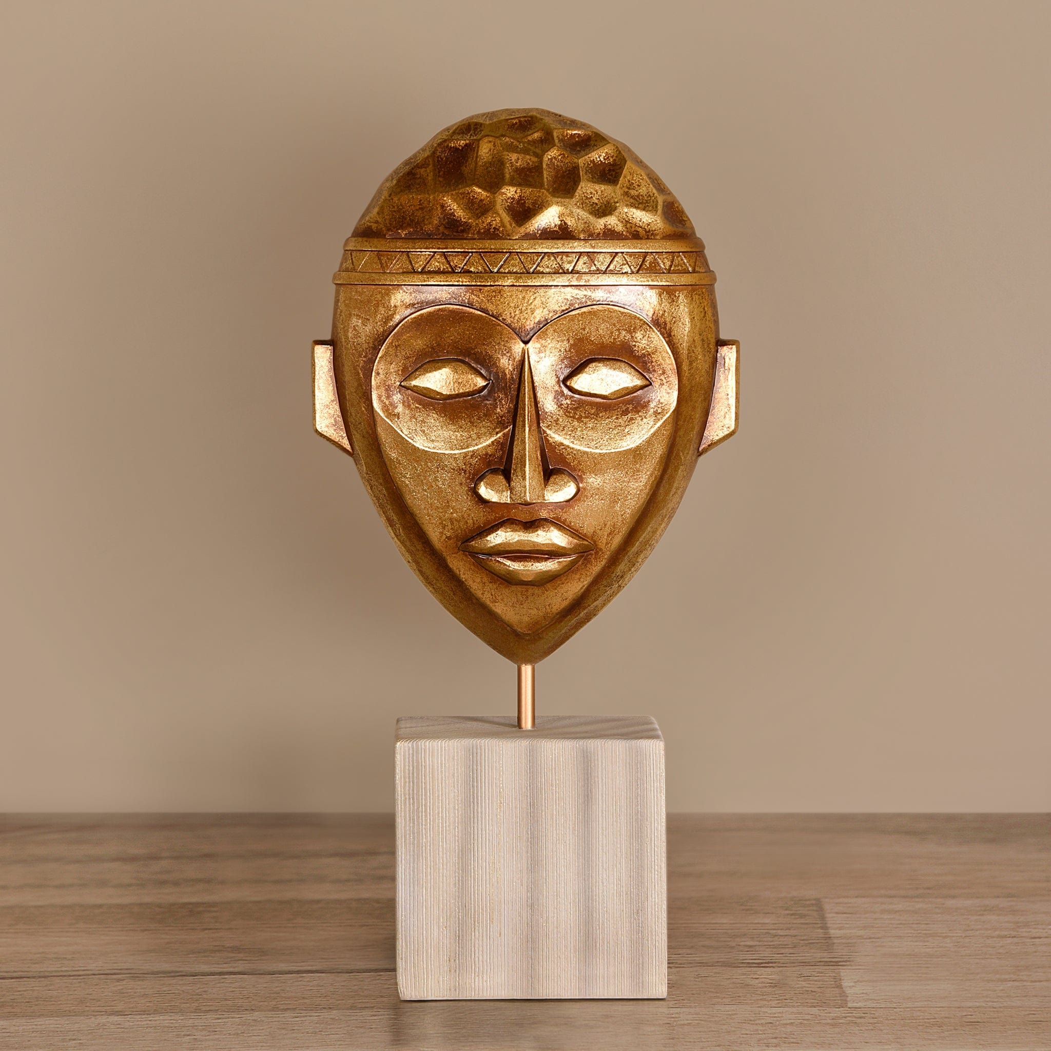 قناع زخرفي أنيق يجمع بين اللون الرمادي واللمسات الذهبية، مثبت على حامل معدني متين لعرض مميز في أي مساحة داخلية. تصميمه يضفي طابعاً فنياً ورفيع الذوق على غرف المعيشة، الممرات، المكاتب أو الأماكن التجارية.
