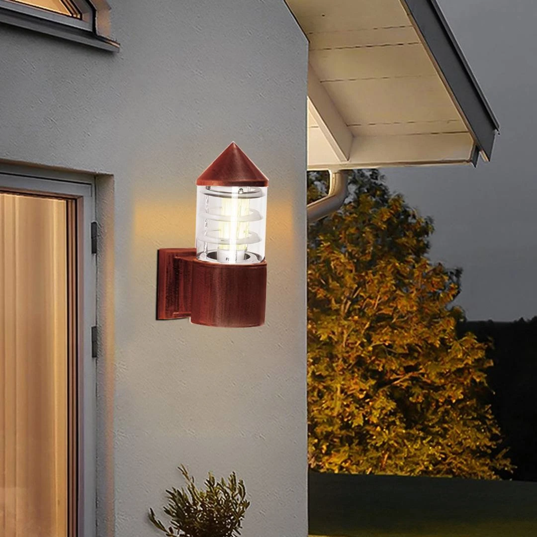 كشاف جدار خارجي بتصميم عصري على شكل صاروخ، يجمع بين مظهر نحاسي أنيق وخفة مادة الصنع المصنوعة من بلاستيك معالج. مثالي لإضاءة الممرات، البوابة، الشرفات والمساحات الخارجية الصغيرة مع لمسة ديكورية ملفتة.