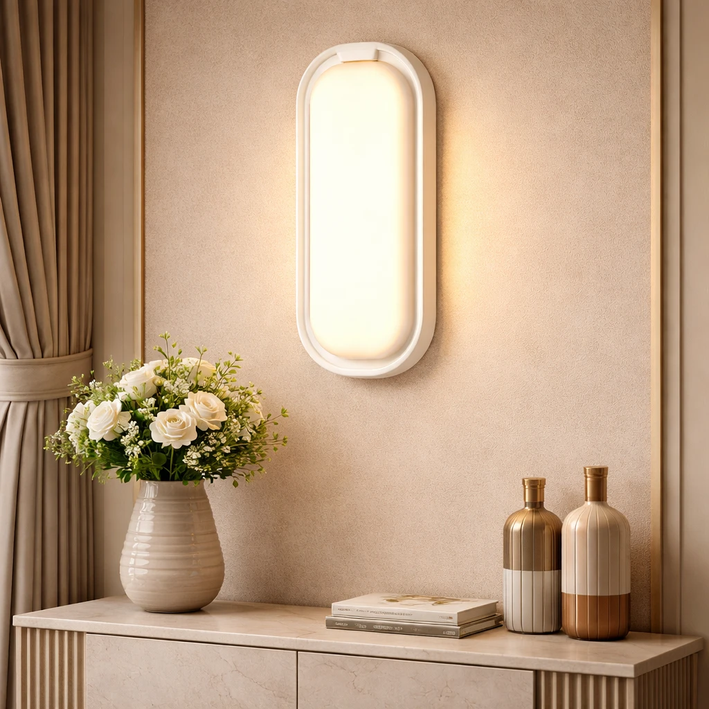 كشاف جدارية خارجي بتصميم بيضاوي بلون أبيض يوفر نبرة ضوء دافئة (أصفر)، بقدرة 20 واط — مناسب لإضاءة الممرات، المداخل، والشرفات لإضفاء جو مريح وترحيبي.