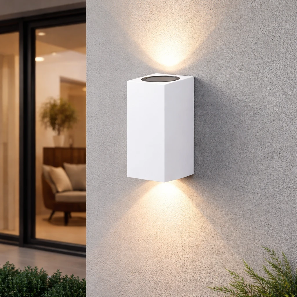 كشاف جداري بلون أبيض أنيق يقدم إضاءة مزدوجة موجهة لأعلى ولأسفل، مثالي لتسليط الضوء على واجهات المنازل، الممرات، البوابات، والشرفات. يستخدم قاعدة لمبة من نوع GU10 مما يجعله متوافقًا بسهولة مع لمبات LED اقتصادية وعملية.