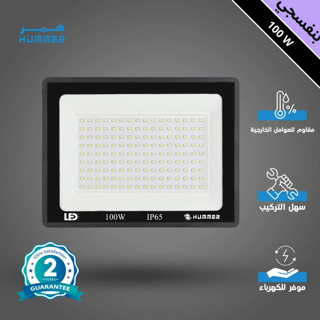 كشاف خارجي بقوة 100 واط يوفر إضاءة بنفسجية واضحة ومناسبة للاستخدام الخارجي. تصميم عملي يهدف إلى إضاءة مناطق محددة بلمسة لونية مميزة.