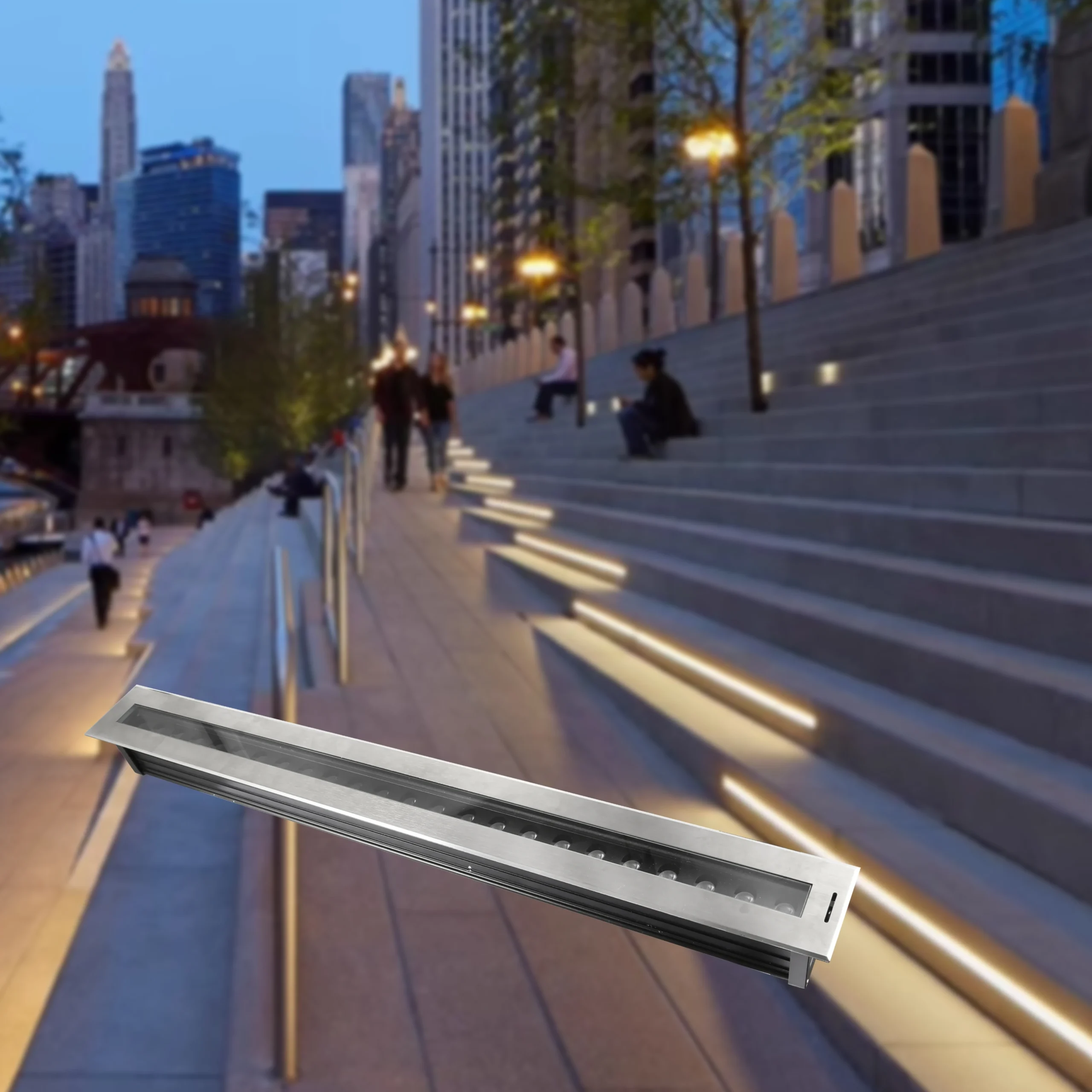 كشاف أرضي خطي غاطس بقدرة 50 واط وبطول 1020 ملم، مصمم للإضاءة المعمارية الخارجية مثل جدران المباني، الواجهات، والساحات. يوفر إضاءة قوية ومتجانسة بفضل شريحة OSRAM وعدسة PMA مدمجة مقاومة للماء، مع لون إضاءة دافئ (أصفر) بدرجة حرارة 3000K.