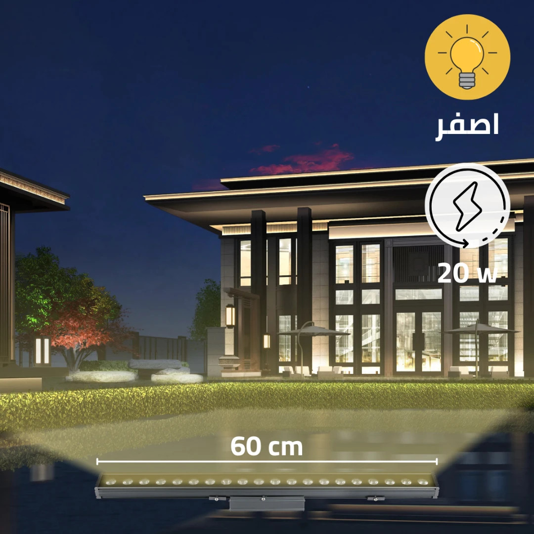 كشاف مسطرة بقياس 60 سم وموديل 20 واط، مناسب للإضاءة ذات درجة حرارة لونية دافئة (3000K). مصمّم من الألومنيوم والزجاج المقسى مع مستوى حماية IP65 للاستخدام الخارجي أو البيئات الرطبة.
