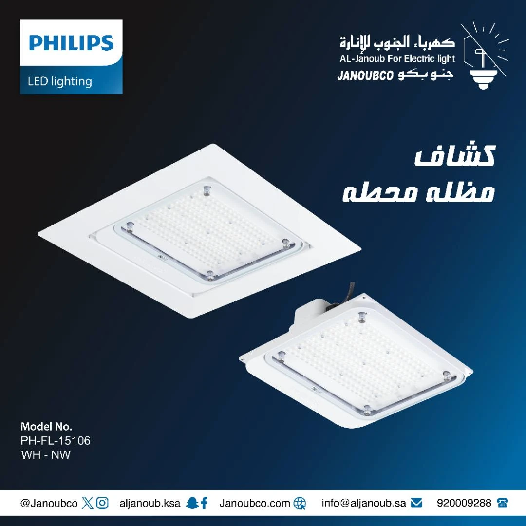 وحدة كشاف مظلة عالية الأداء مخصصة للاستخدام في محطات الوقود والمظلات الخارجية. تصميم مناسب للتركيب تحت المظلات ويوفر إضاءة بيضاء واضحة وموثوقة.