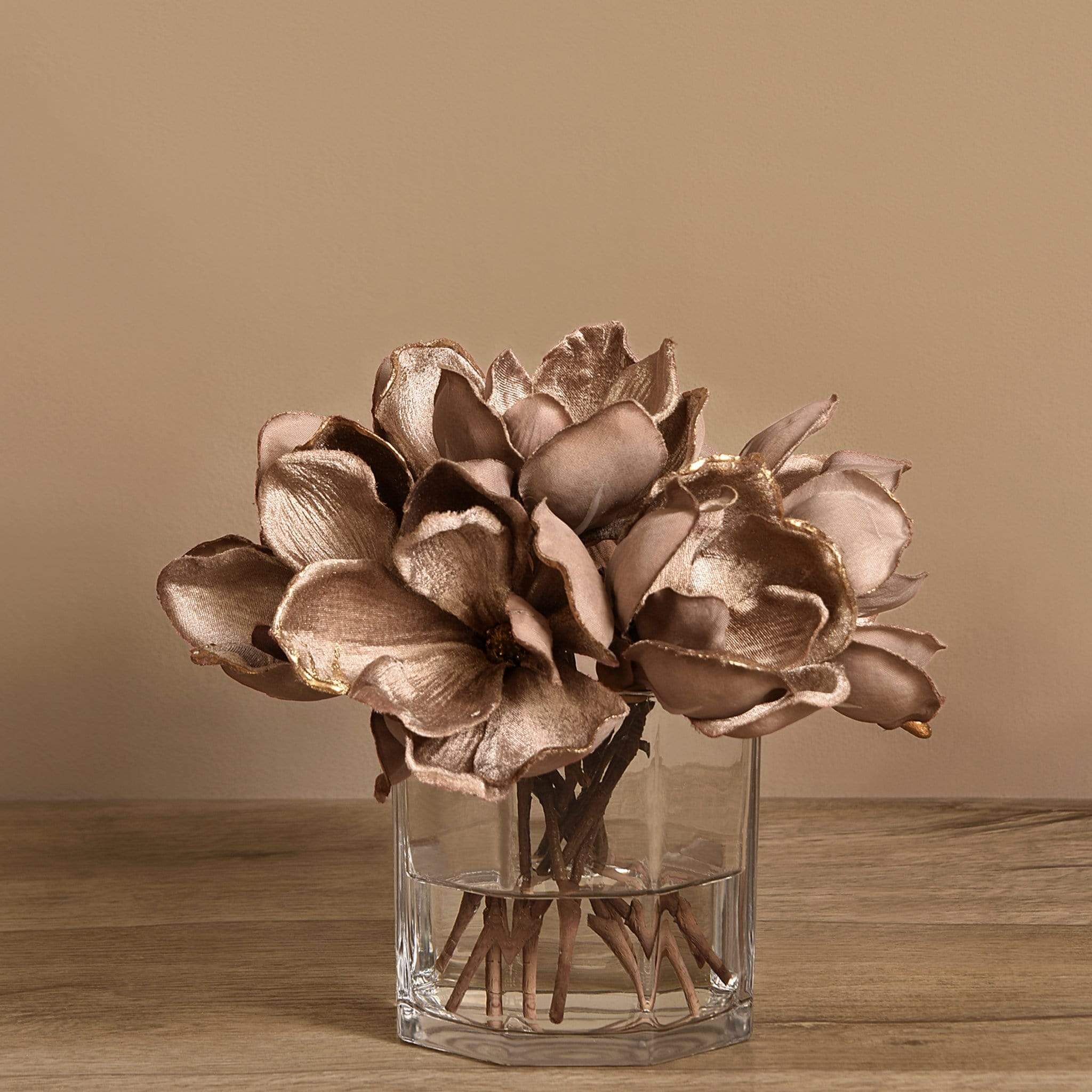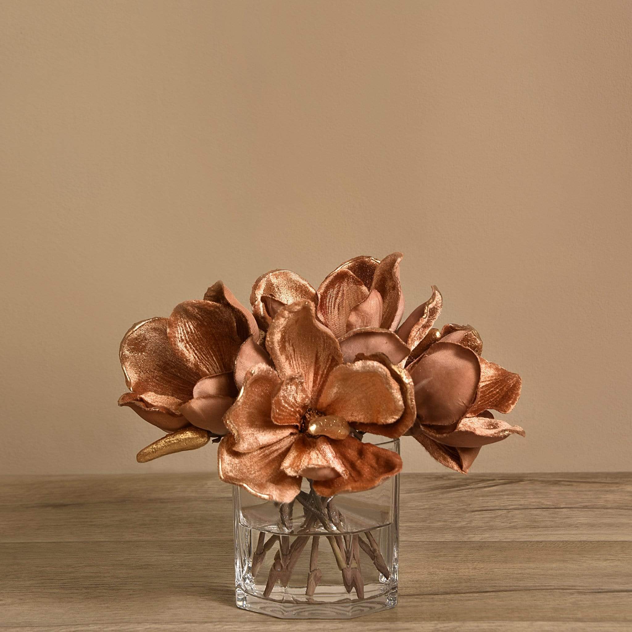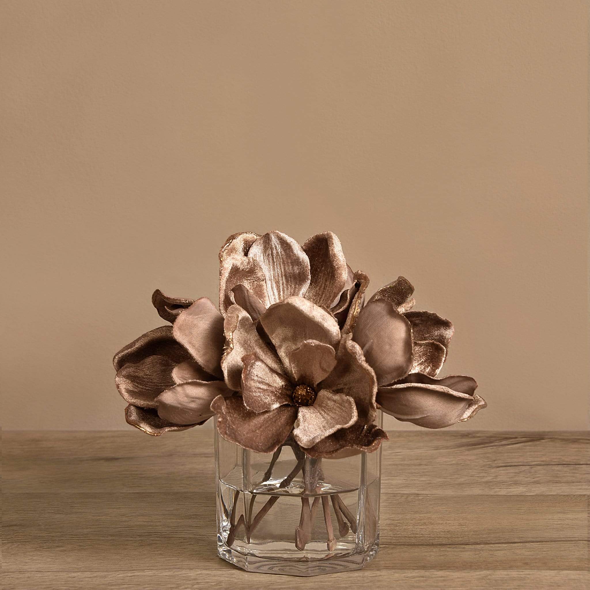 مزهرية ماغنوليا المخملية هذه تشكّل لمسة أنيقة وخالدة لأي مكان. أزهار الماغنوليا المصنوعة من قماش مخملي ناعم تمنح القطعة ملمسًا فاخرًا ومظهرًا قريبًا من الطبيعة، إذ تم تفصيل البتلات بعناية لتعكس رقة وسحر الزهرة الأصلي. تم ترتيب الأزهار داخل مزهرية زجاجية أسطوانية شفافة، مع قاعدة بسيطة ومتقنة تبرز جمال التكوين وتسمح له بأن يكون محور الانتباه.