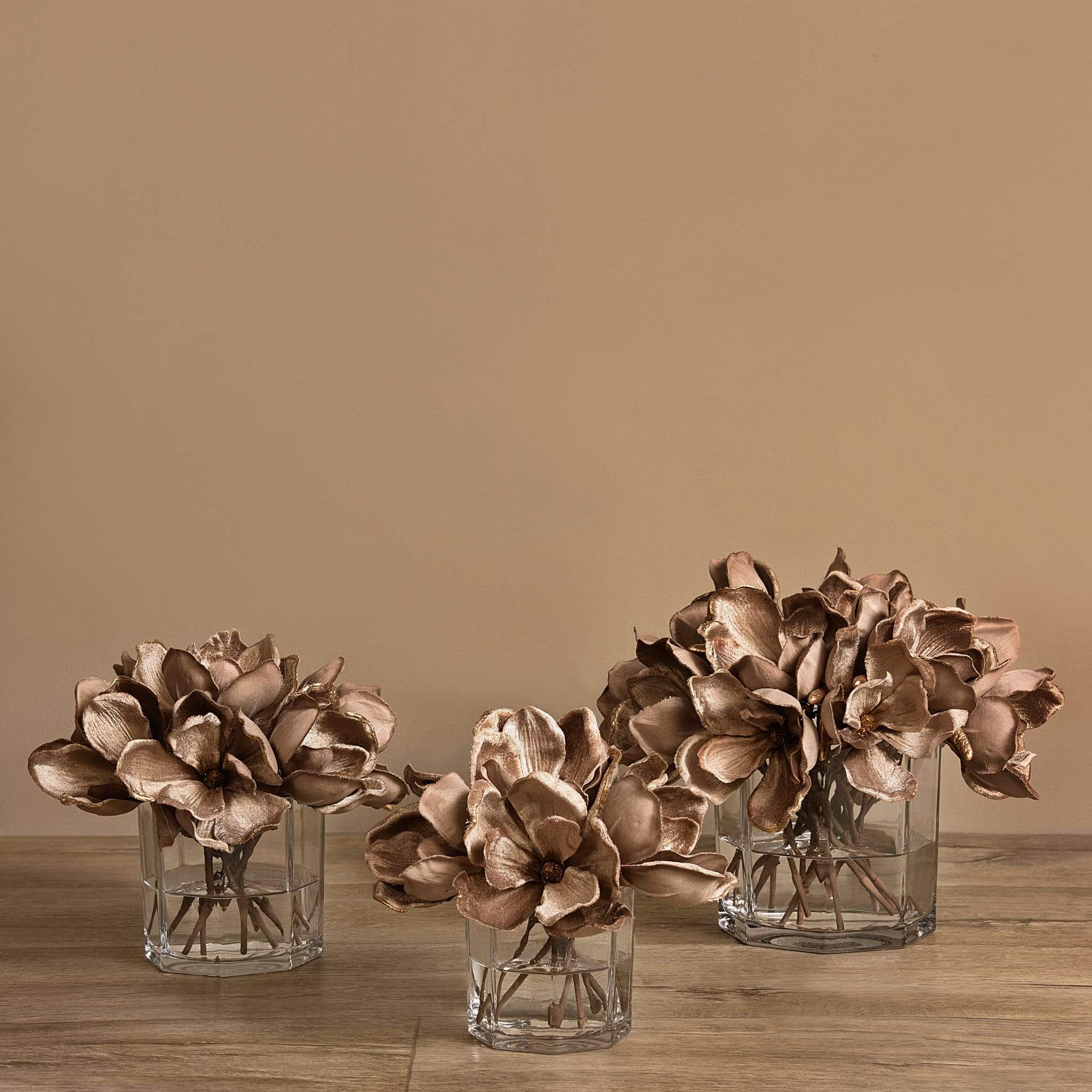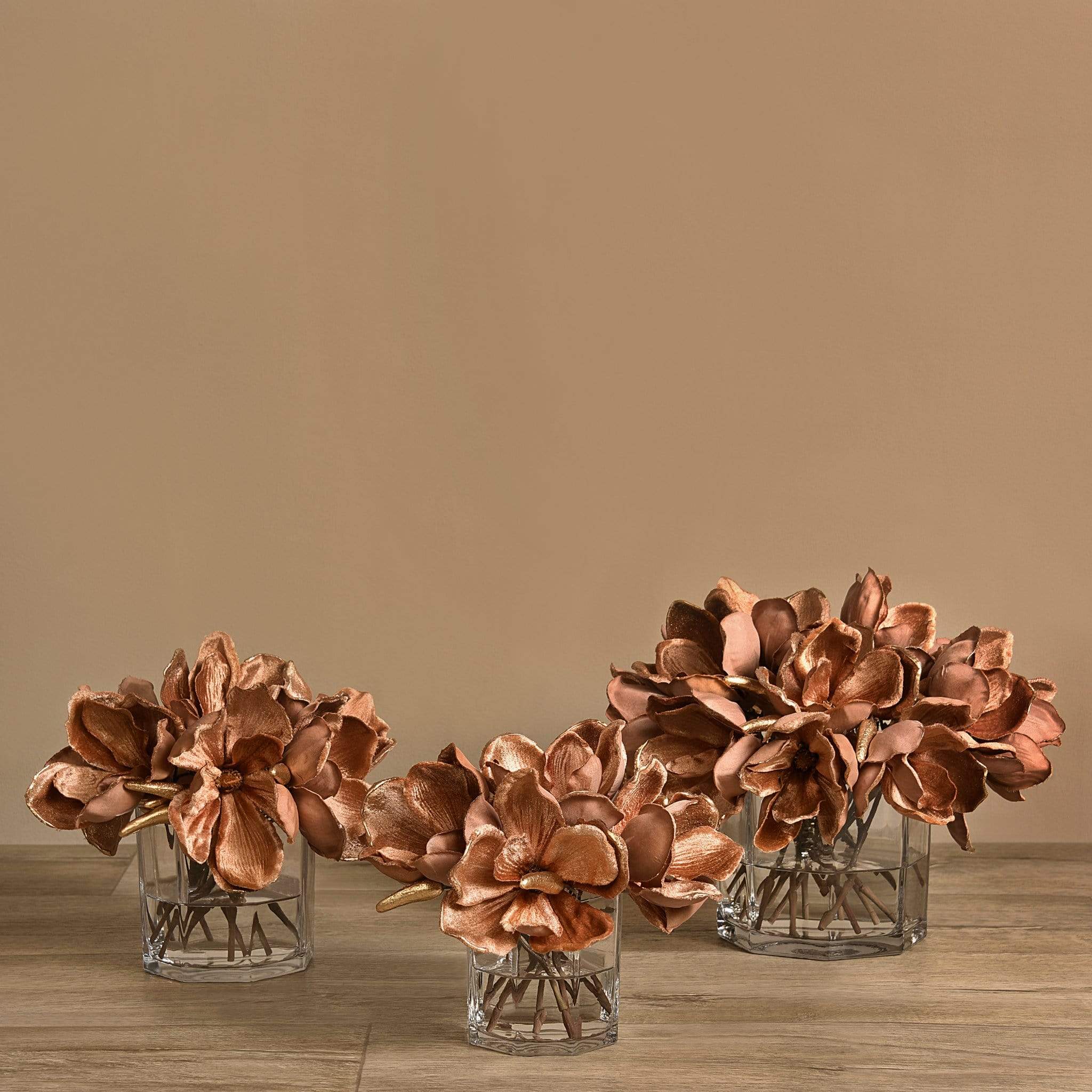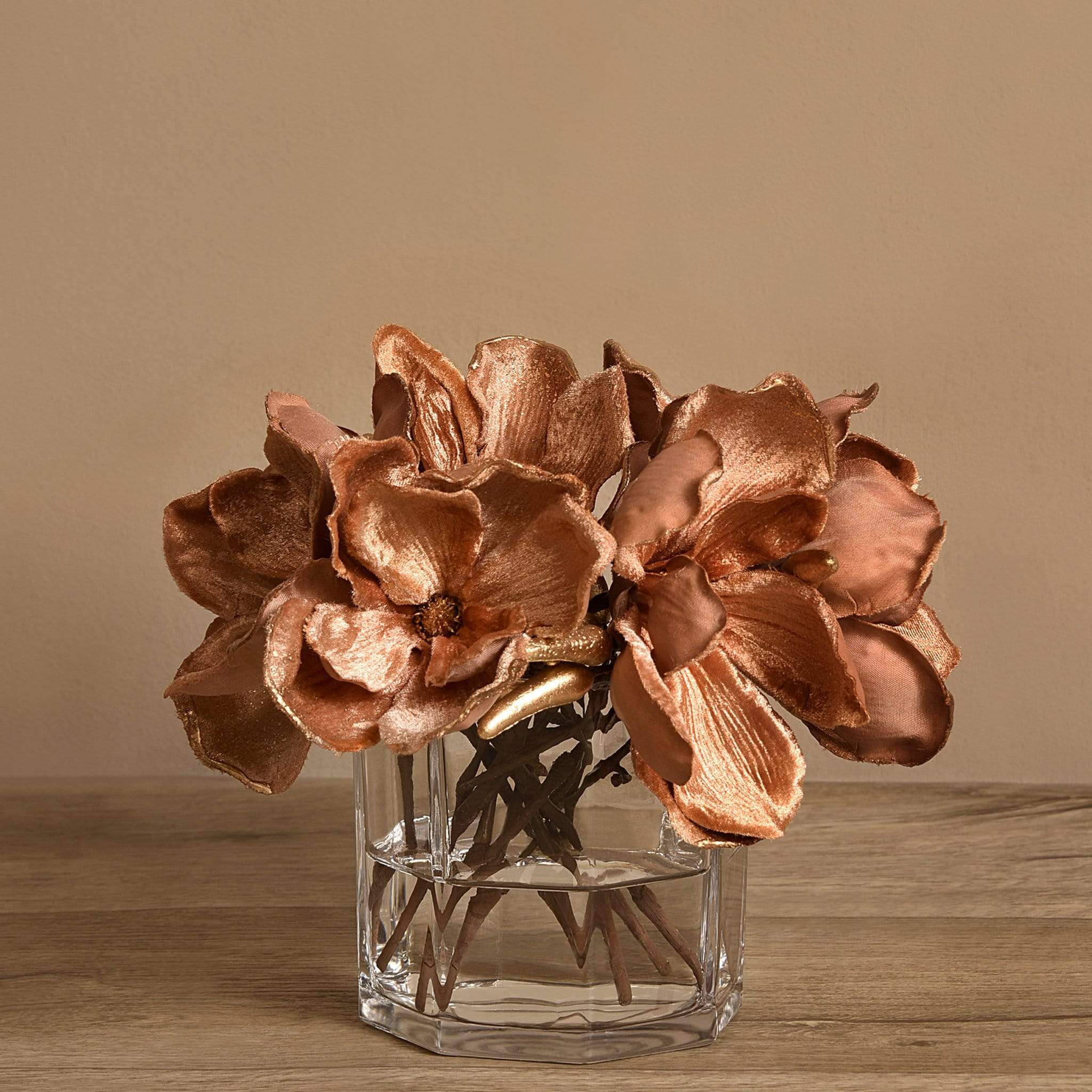 مزهرية ماغنوليا المخملية هذه تشكّل لمسة أنيقة وخالدة لأي مكان. أزهار الماغنوليا المصنوعة من قماش مخملي ناعم تمنح القطعة ملمسًا فاخرًا ومظهرًا قريبًا من الطبيعة، إذ تم تفصيل البتلات بعناية لتعكس رقة وسحر الزهرة الأصلي. تم ترتيب الأزهار داخل مزهرية زجاجية أسطوانية شفافة، مع قاعدة بسيطة ومتقنة تبرز جمال التكوين وتسمح له بأن يكون محور الانتباه.
