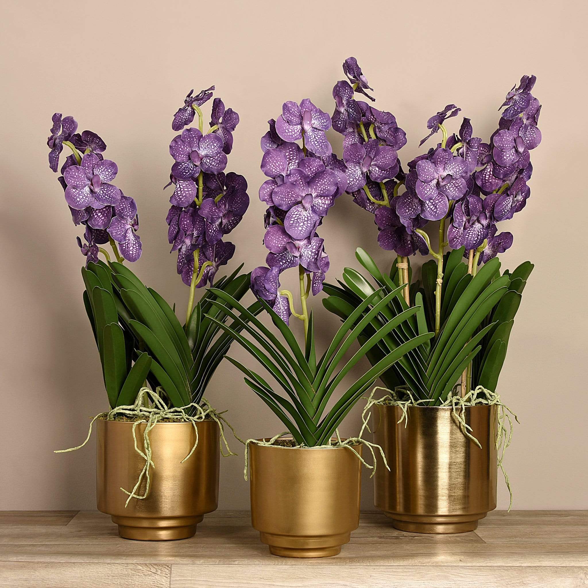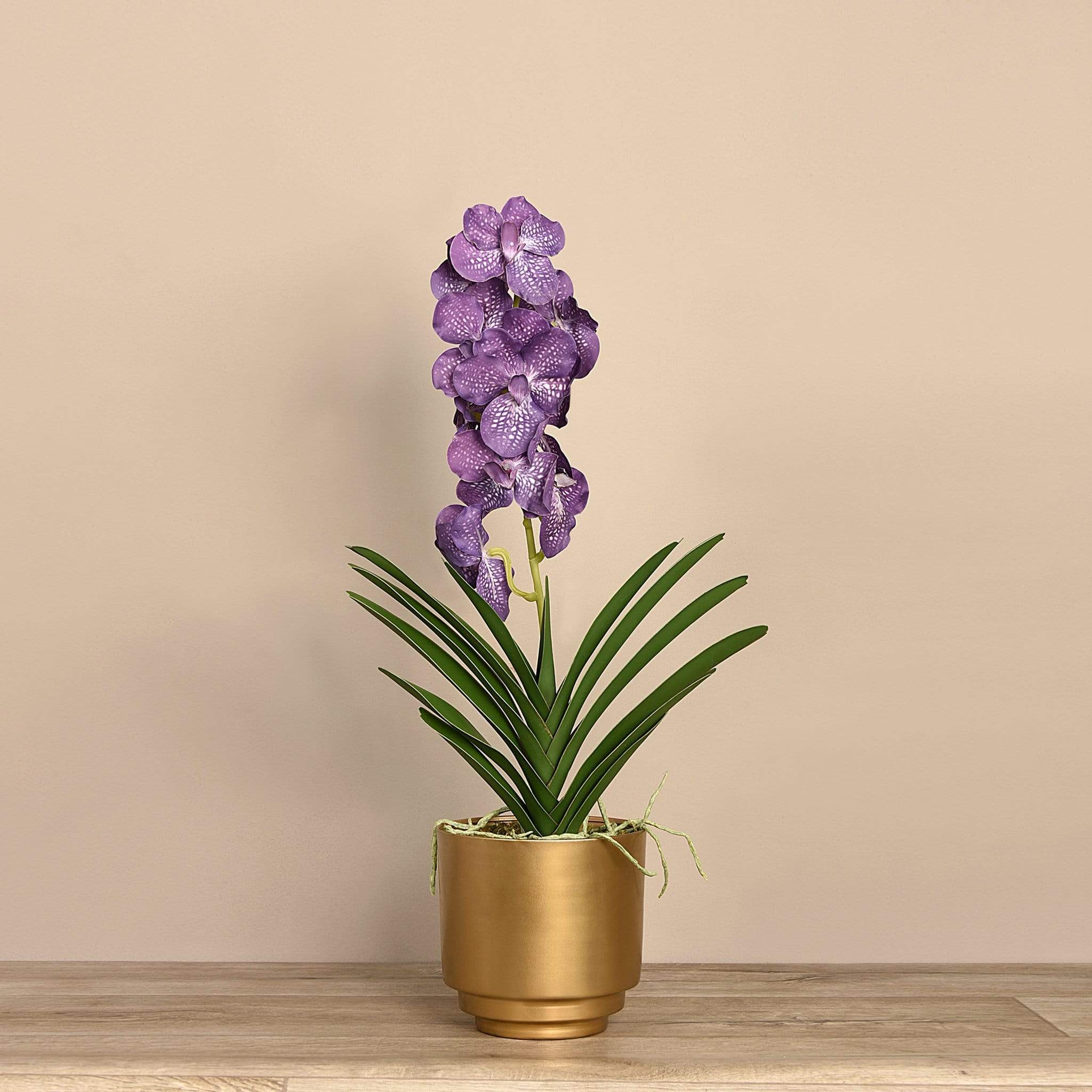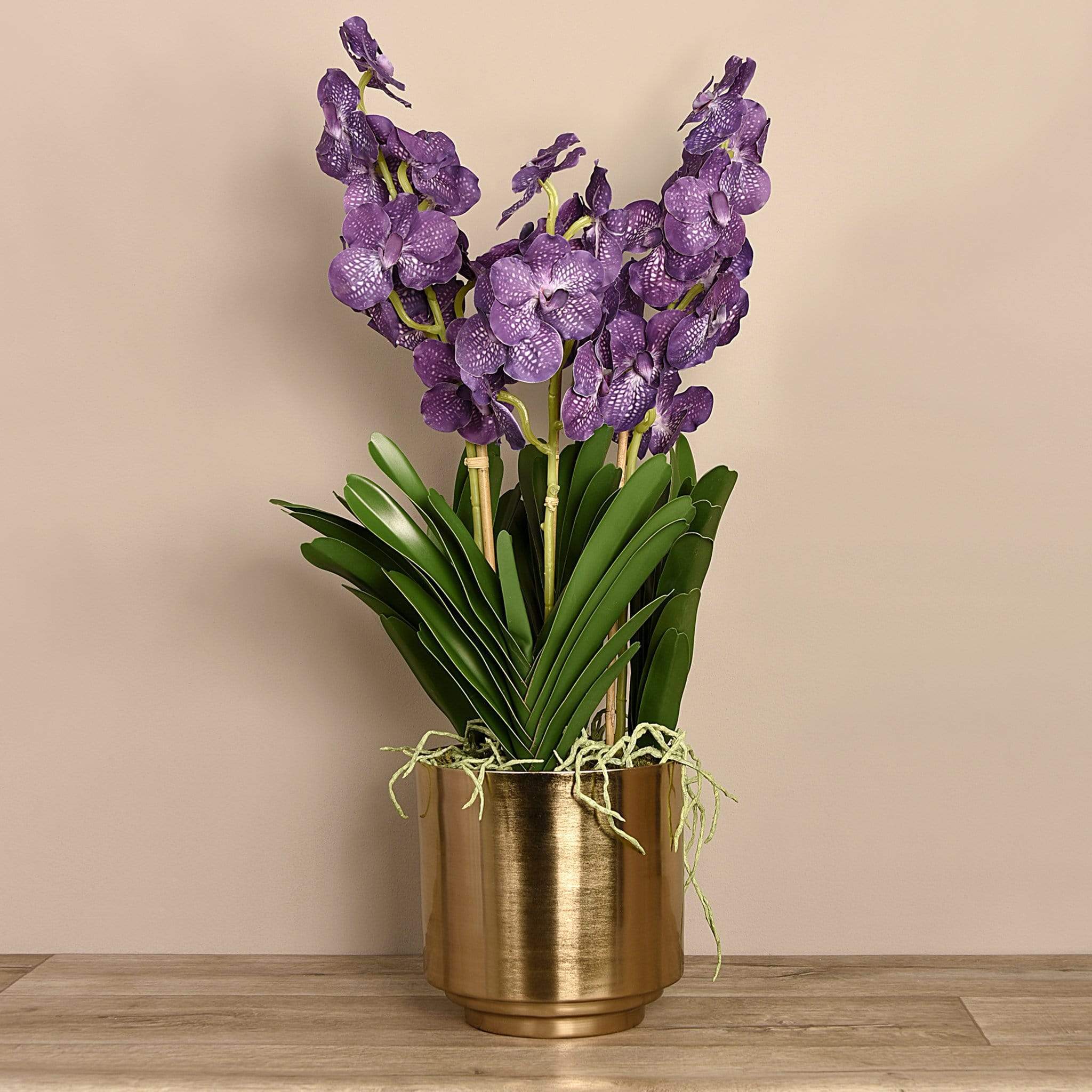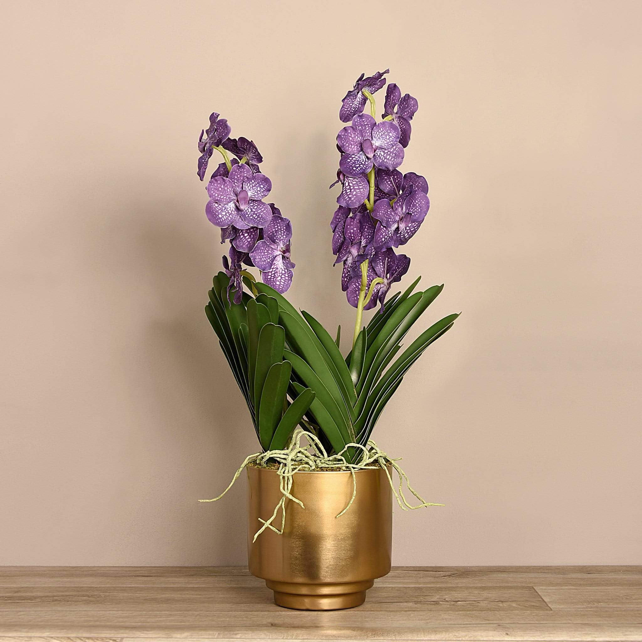 زهور الفاندا رمز للصداقة والإخلاص، وهذه التشكيلة الصناعية تضيف لمسة من الدفء والطمأنينة إلى منزلك أو مكتبك. تأتي القطع مرتبة في أصيص ذهبي أنيق يبرز جمالها، ومصممة ومجهزة بعناية لتمنح مظهرًا وملمسًا شبه طبيعي.
