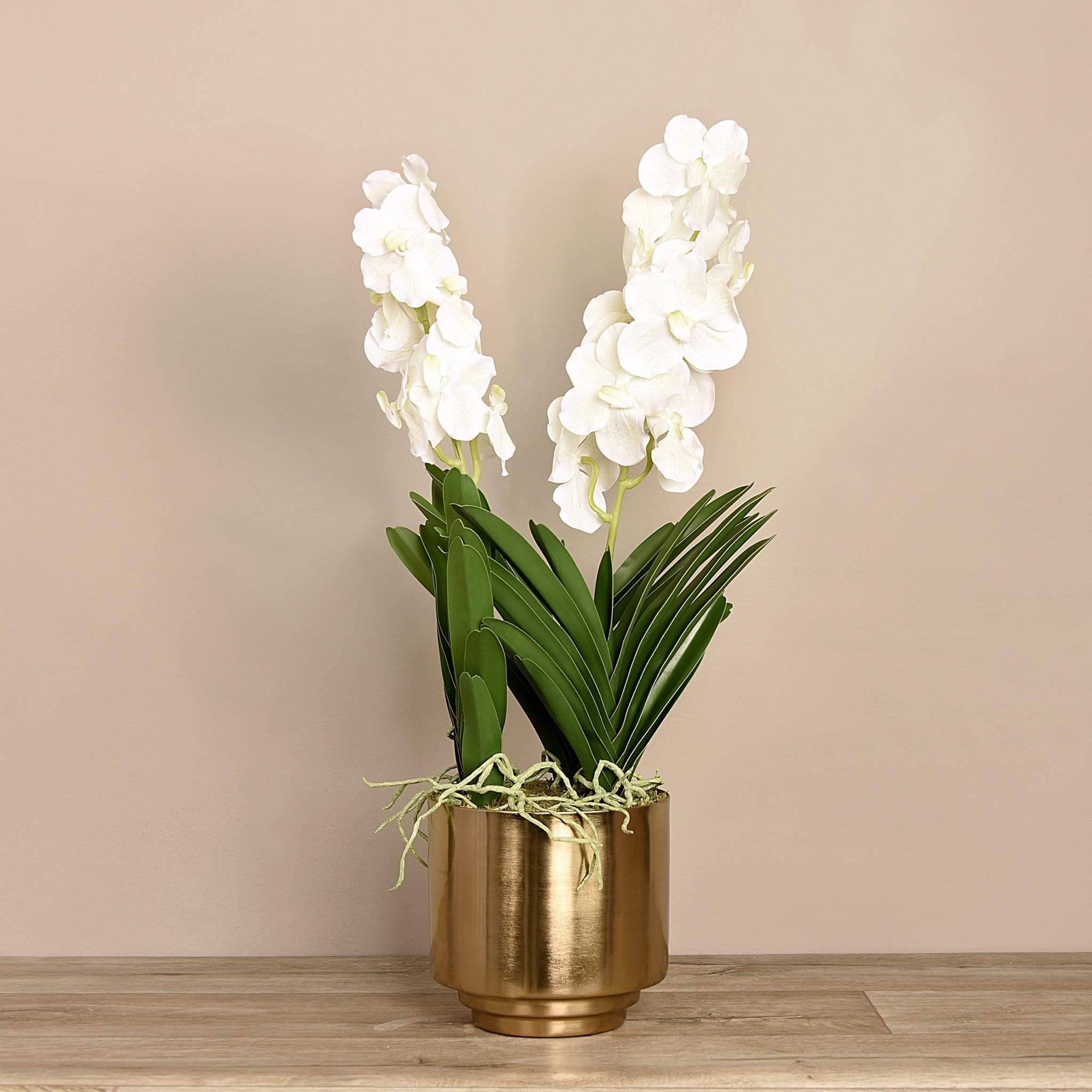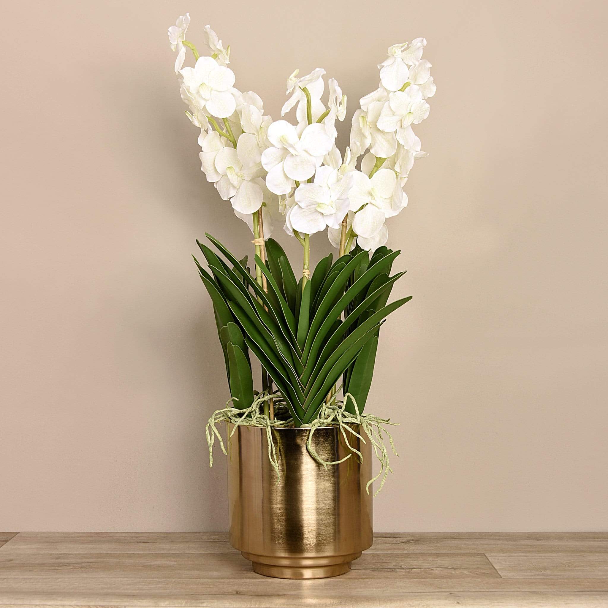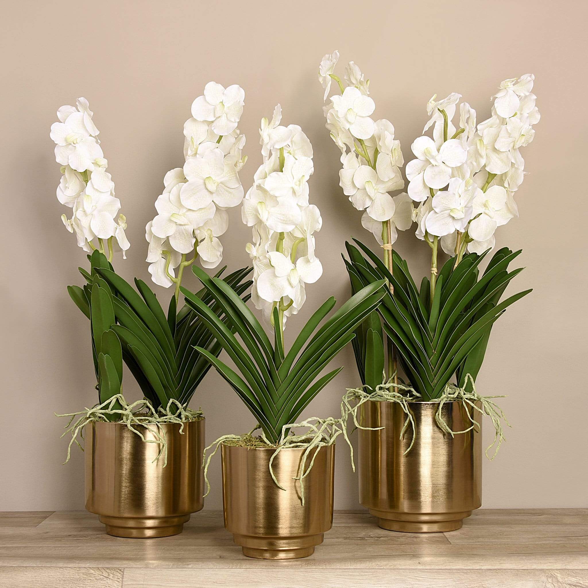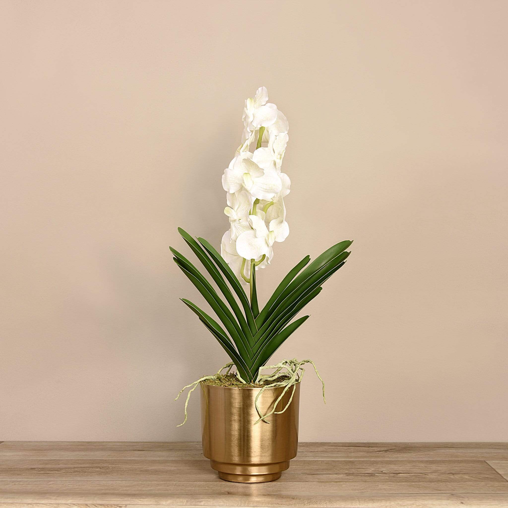زهور الفاندا رمز للصداقة والإخلاص، وهذه التشكيلة الصناعية تضيف لمسة من الدفء والطمأنينة إلى منزلك أو مكتبك. تأتي القطع مرتبة في أصيص ذهبي أنيق يبرز جمالها، ومصممة ومجهزة بعناية لتمنح مظهرًا وملمسًا شبه طبيعي.