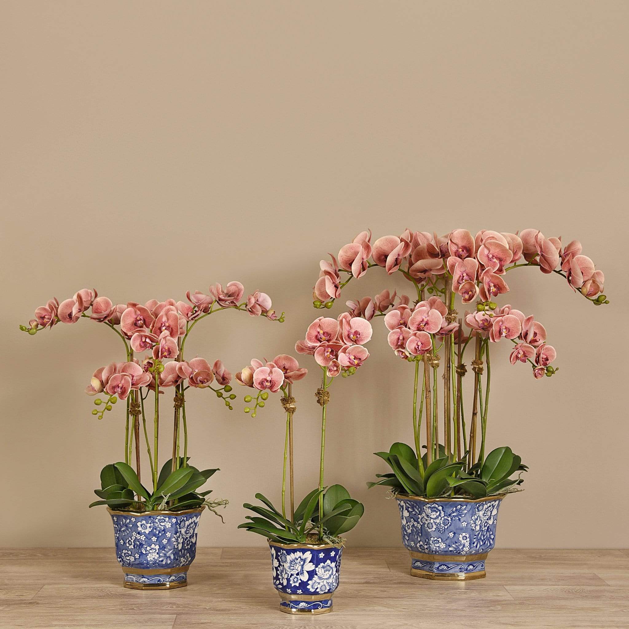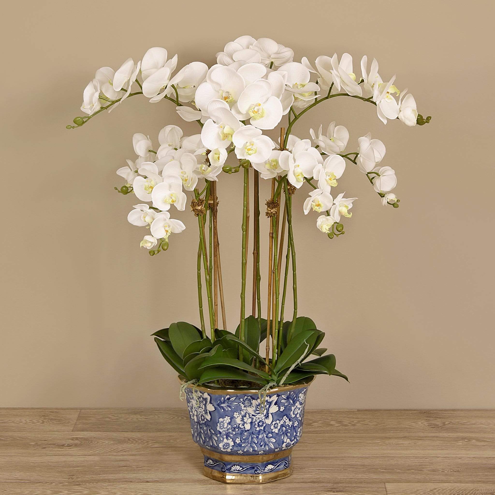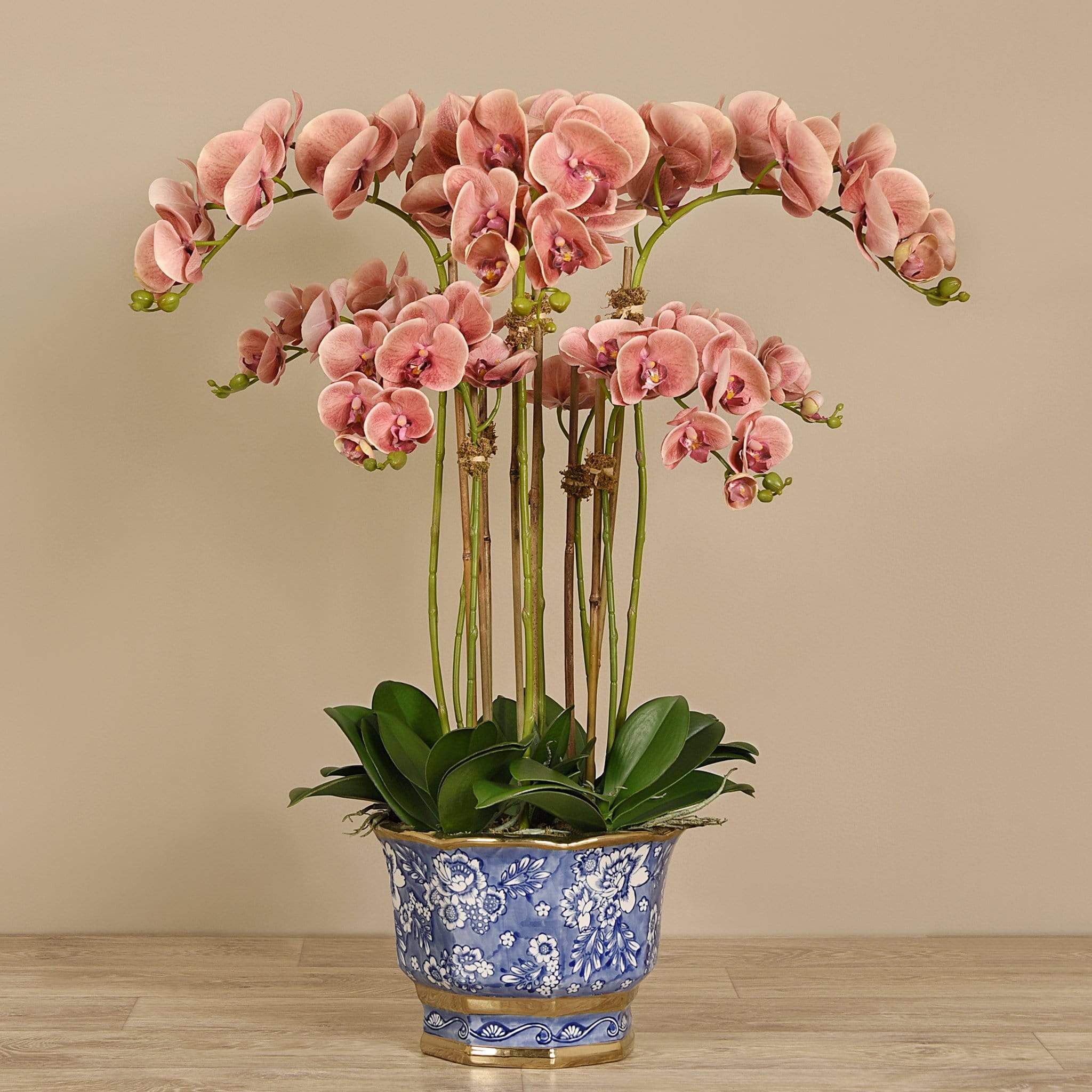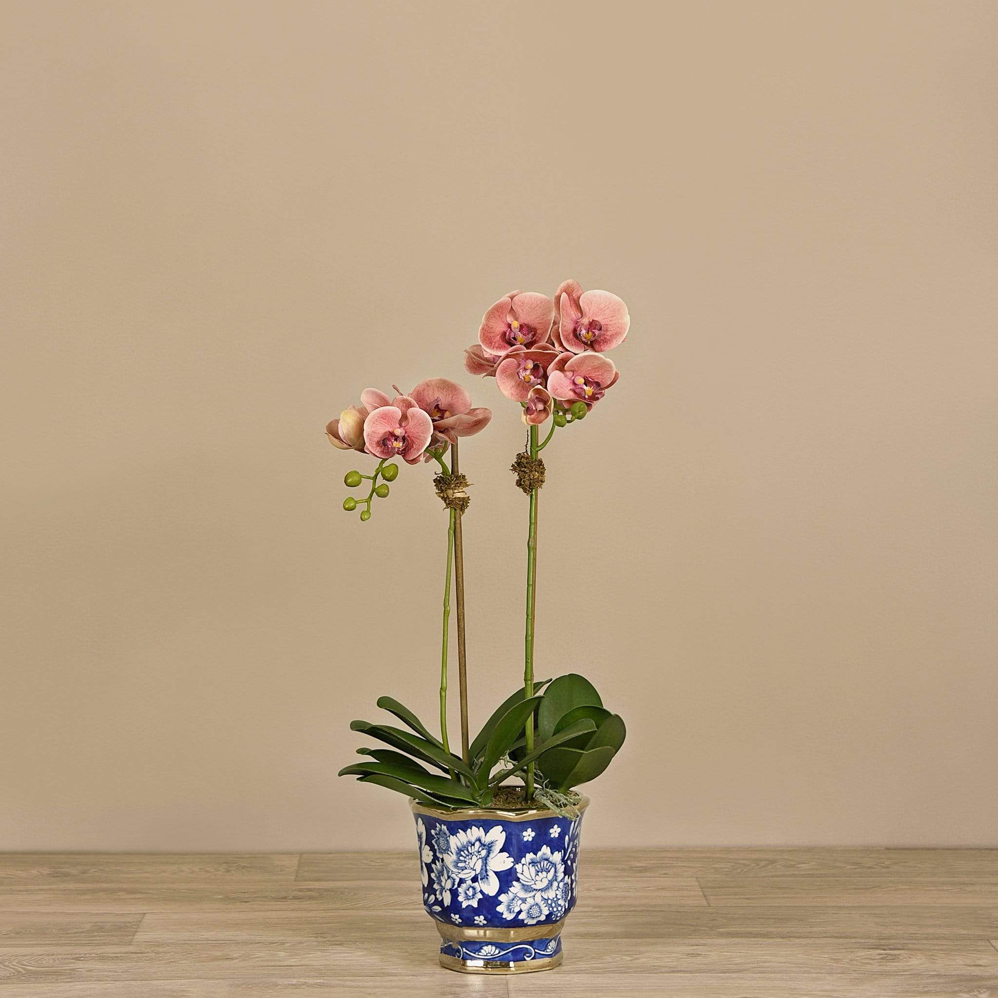 مزيج أنيق من الدفء والغموض مع واقعية تخطف الأنفاس. هذه الأوركيد المصنوعة يدويًا من حرير ناعم تحاكي جمال الطبيعة بدقة: أوراق خضراء سميكة وبتلات ناعمة تبدو كأنها حقيقية، بينما يضفي الأصيص الصيني الأزرق والأبيض لمسة ساحرة من الرقي والتقاليد.