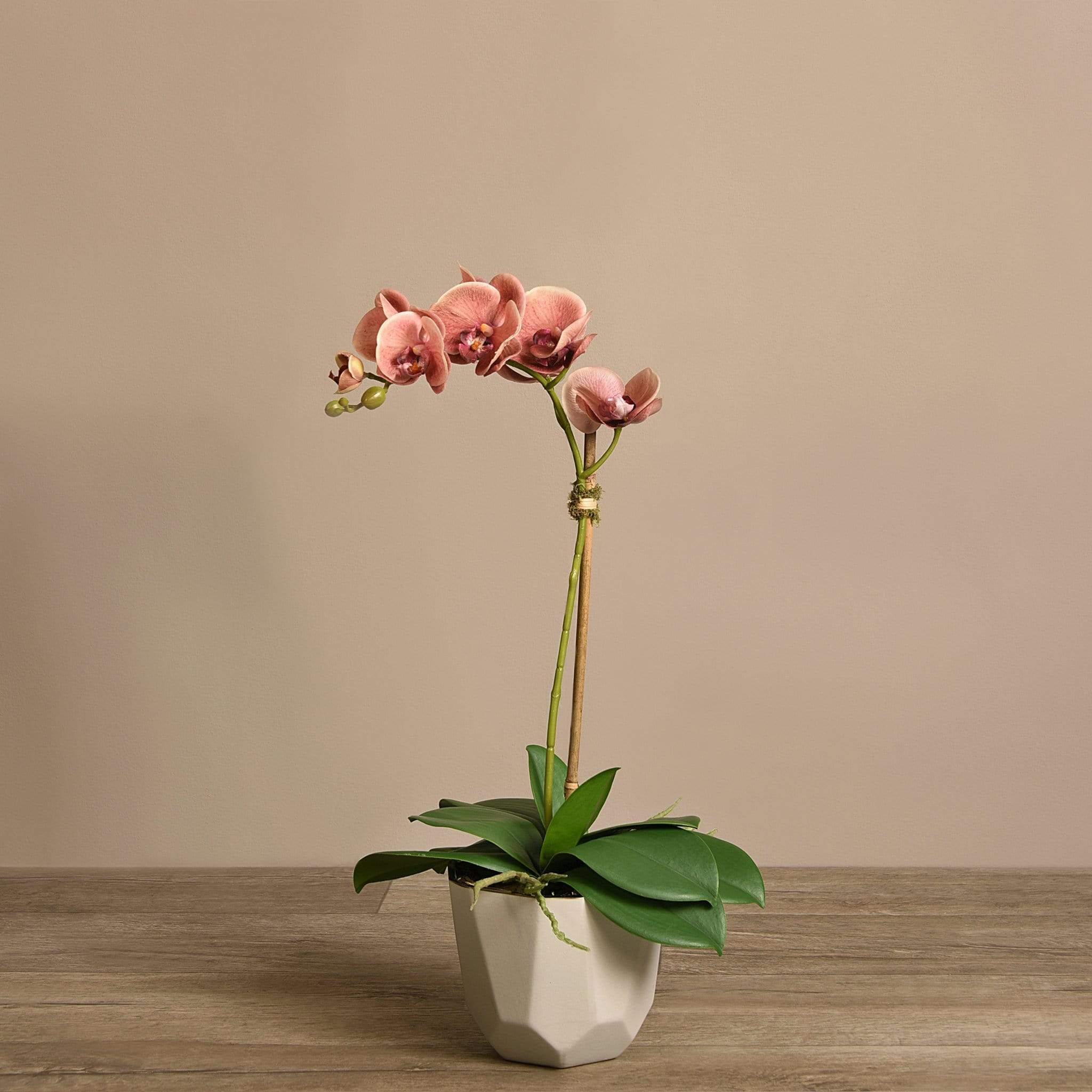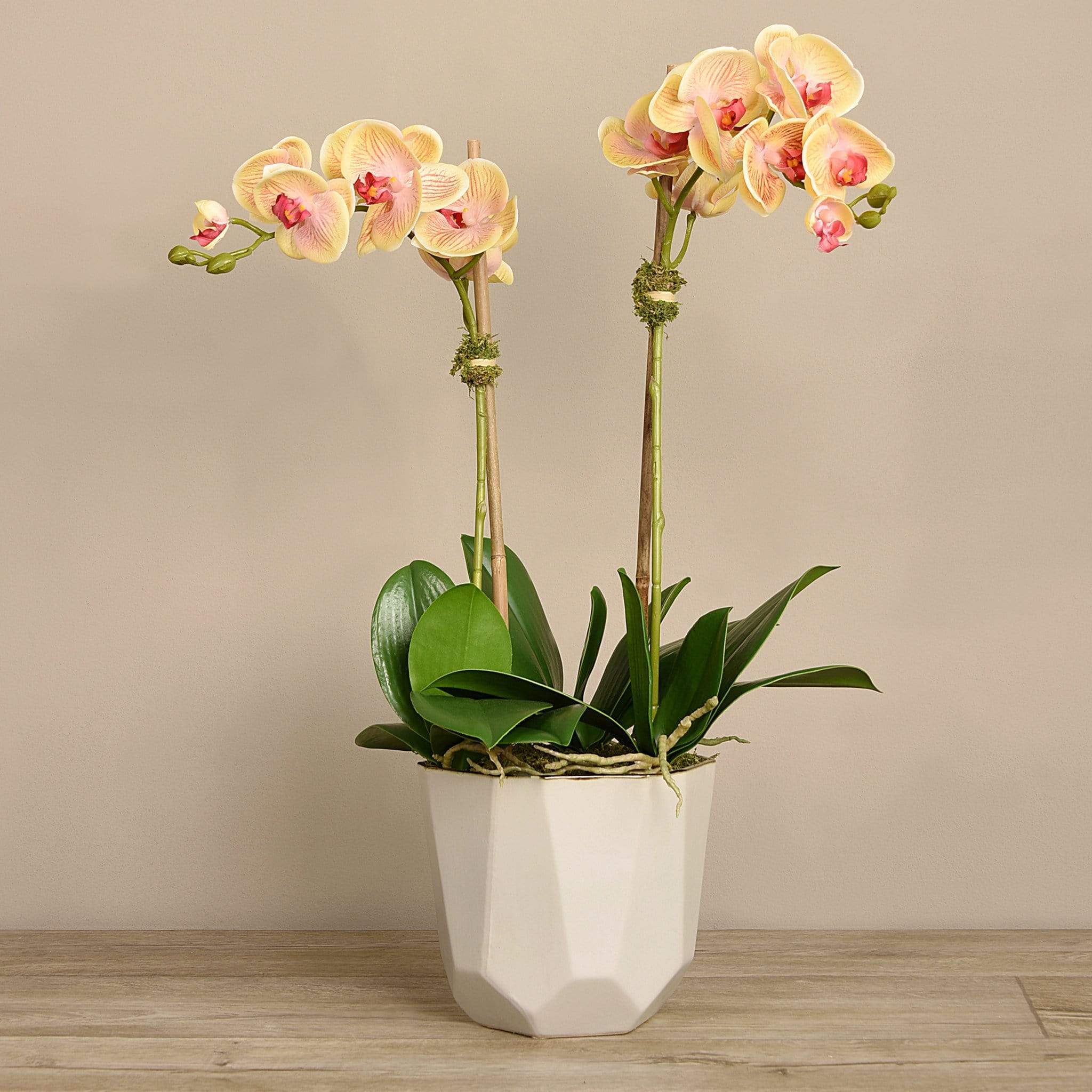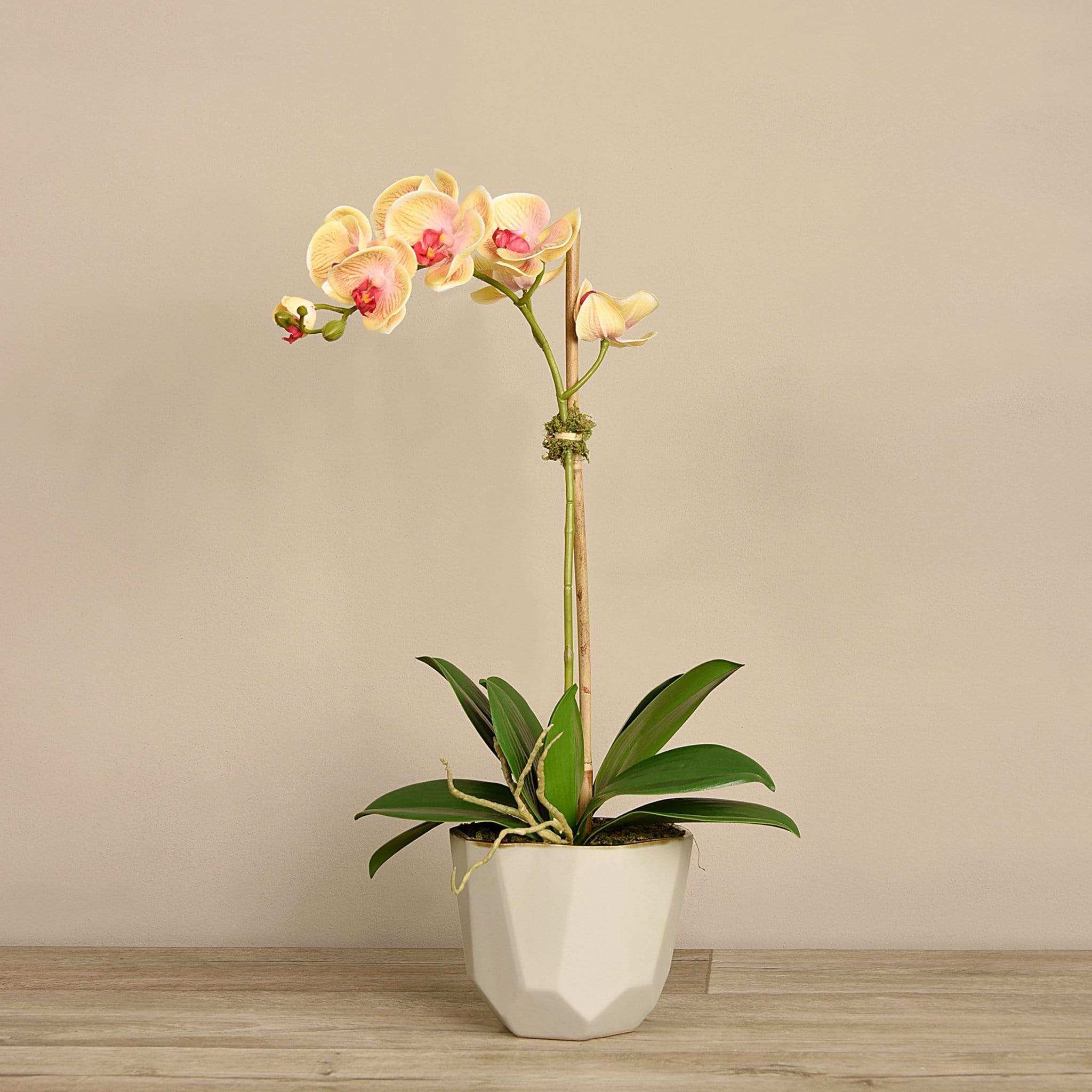 ترتيب أوركيد يعبر عن الأناقة العصرية بوضوح. زهور أوركيد حريرية نابضة بالحياة، مزينة بوعاء بيج بتصميم هندسي أنيق، لتشكل قطعة ديكور ملفتة تضيف طابعاً أنيقاً ومريحاً إلى غرفة المعيشة أو منطقة الانتظار.