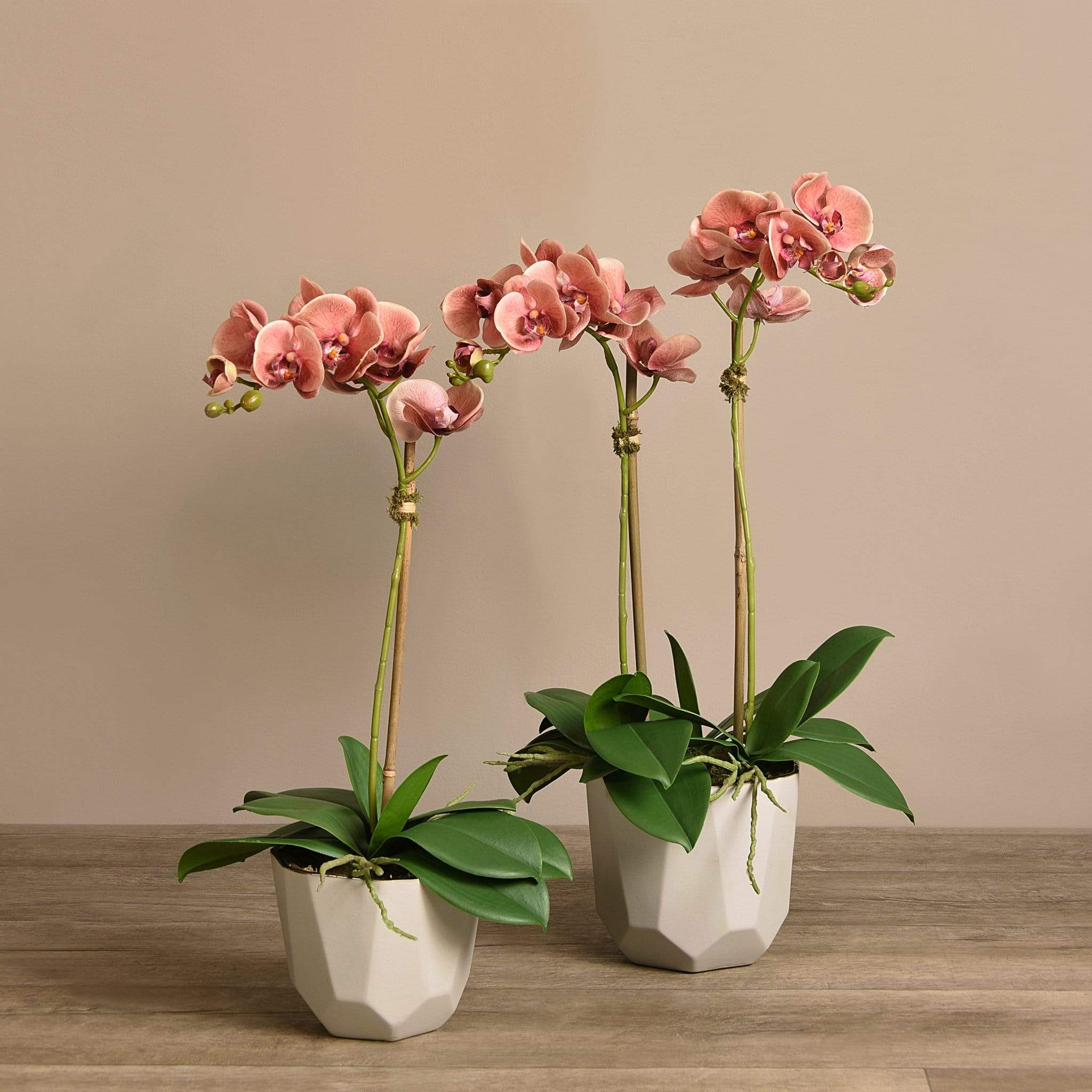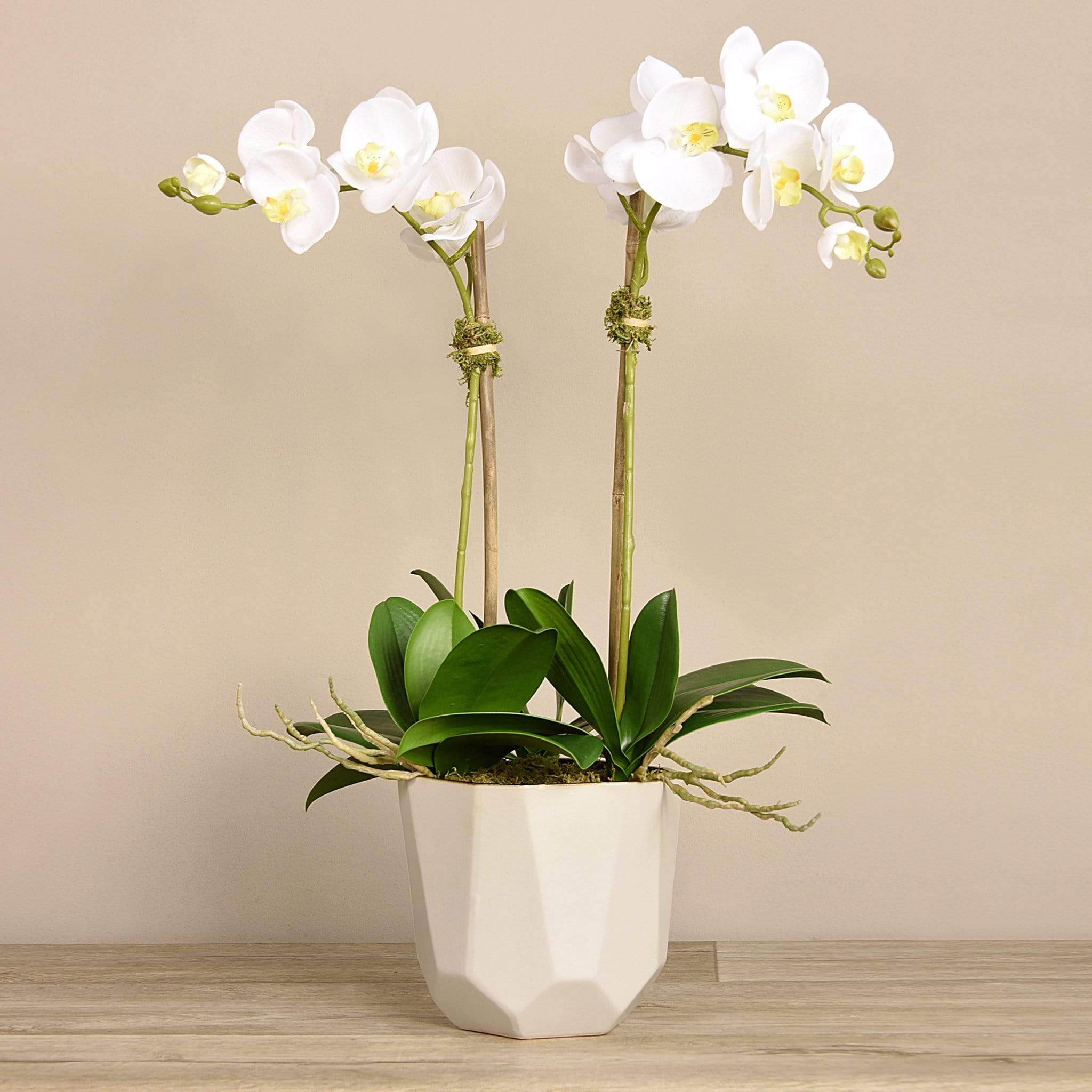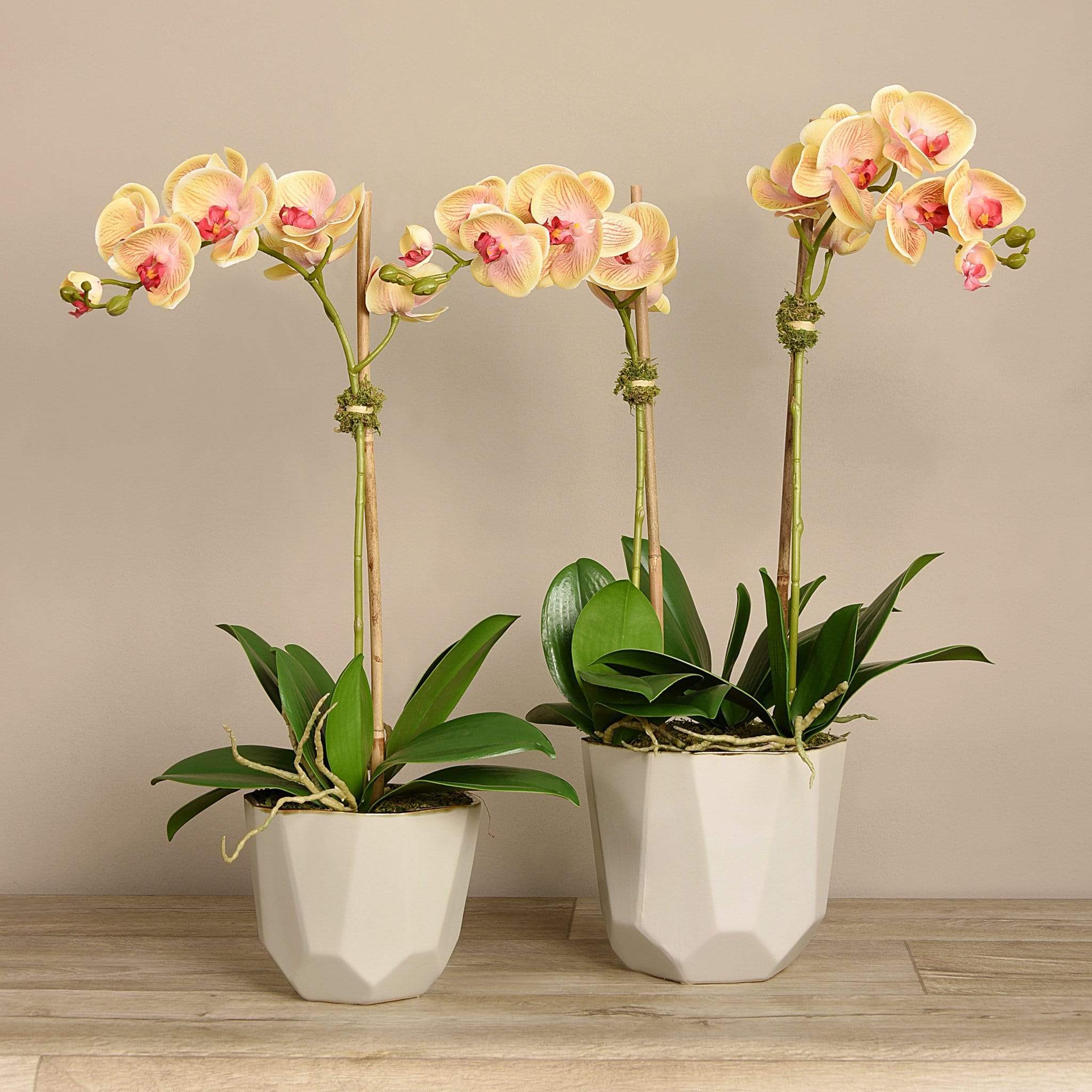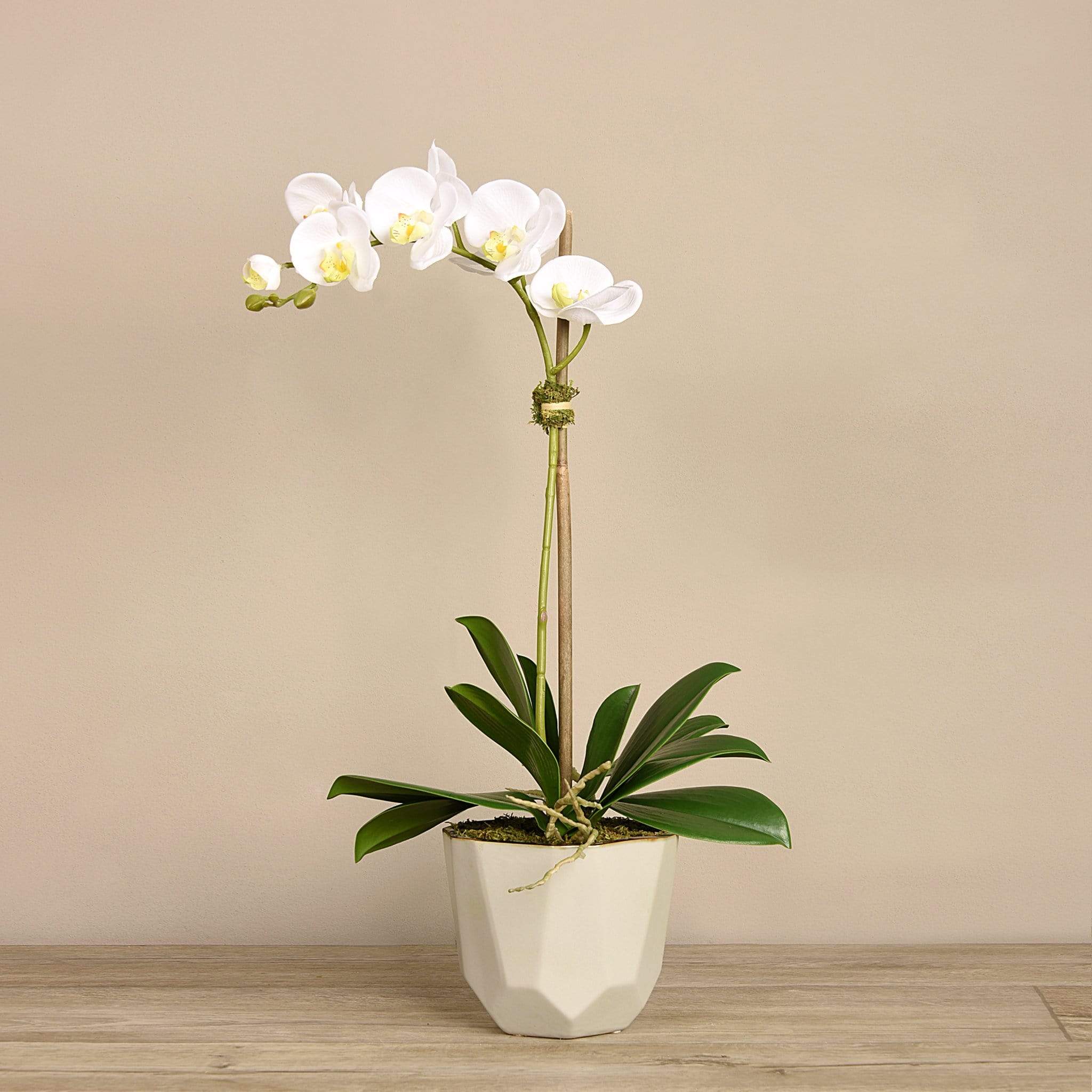 ترتيب أوركيد يعبر عن الأناقة العصرية بوضوح. زهور أوركيد حريرية نابضة بالحياة، مزينة بوعاء بيج بتصميم هندسي أنيق، لتشكل قطعة ديكور ملفتة تضيف طابعاً أنيقاً ومريحاً إلى غرفة المعيشة أو منطقة الانتظار.