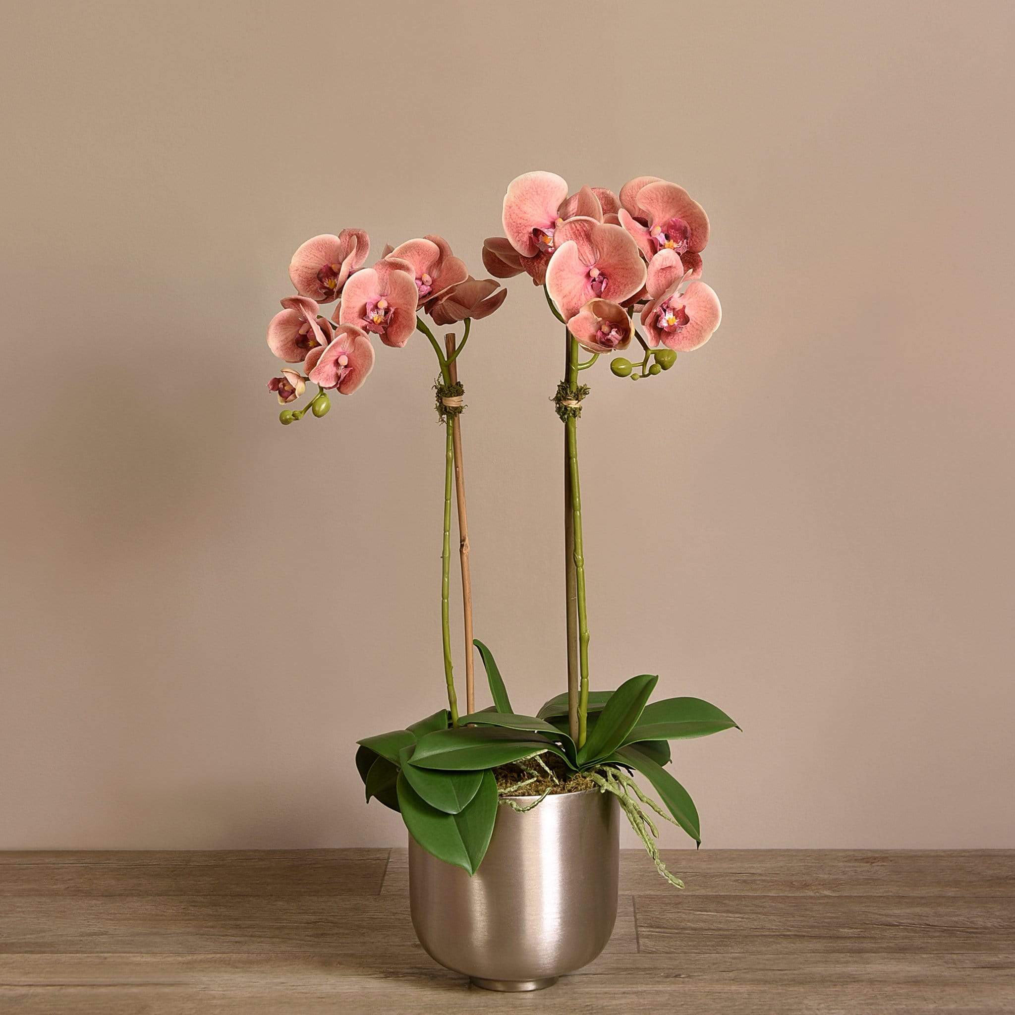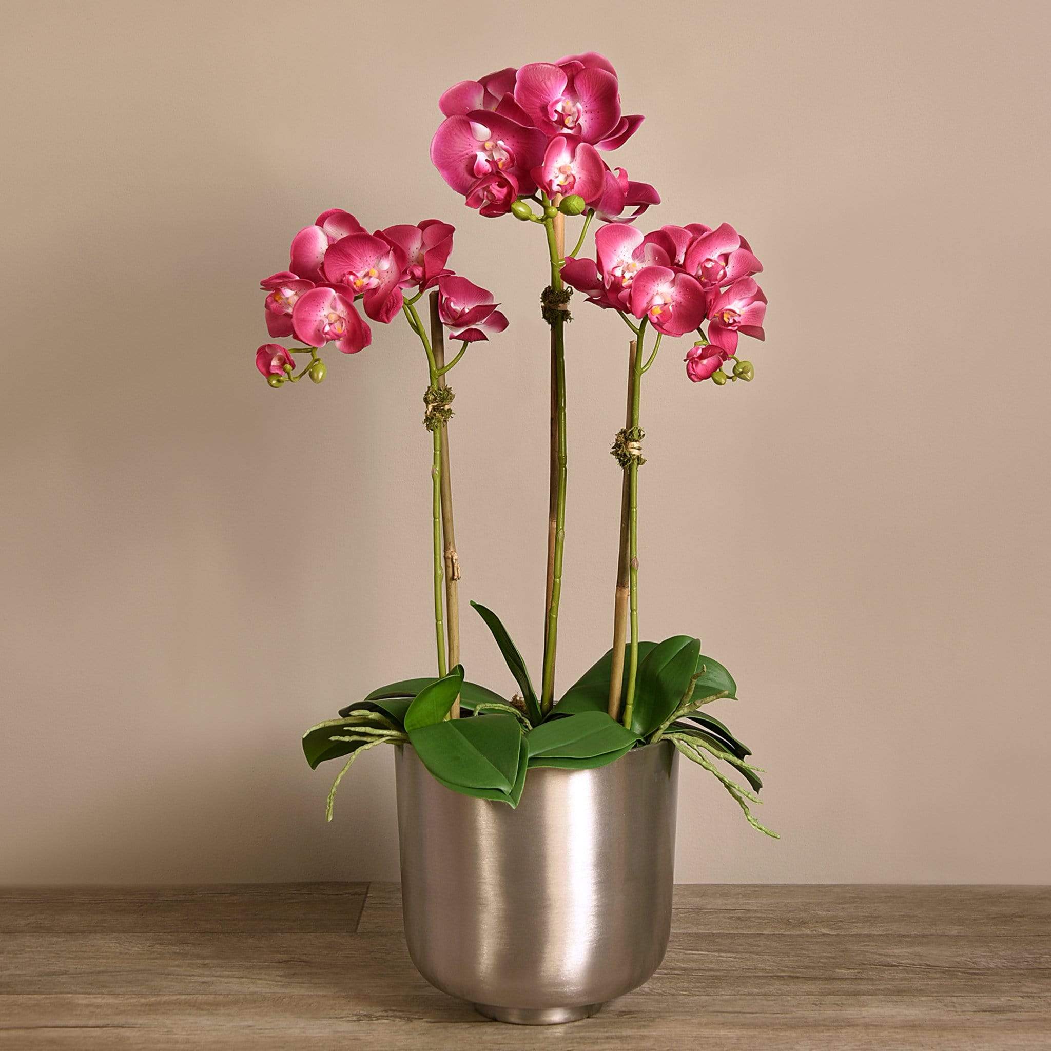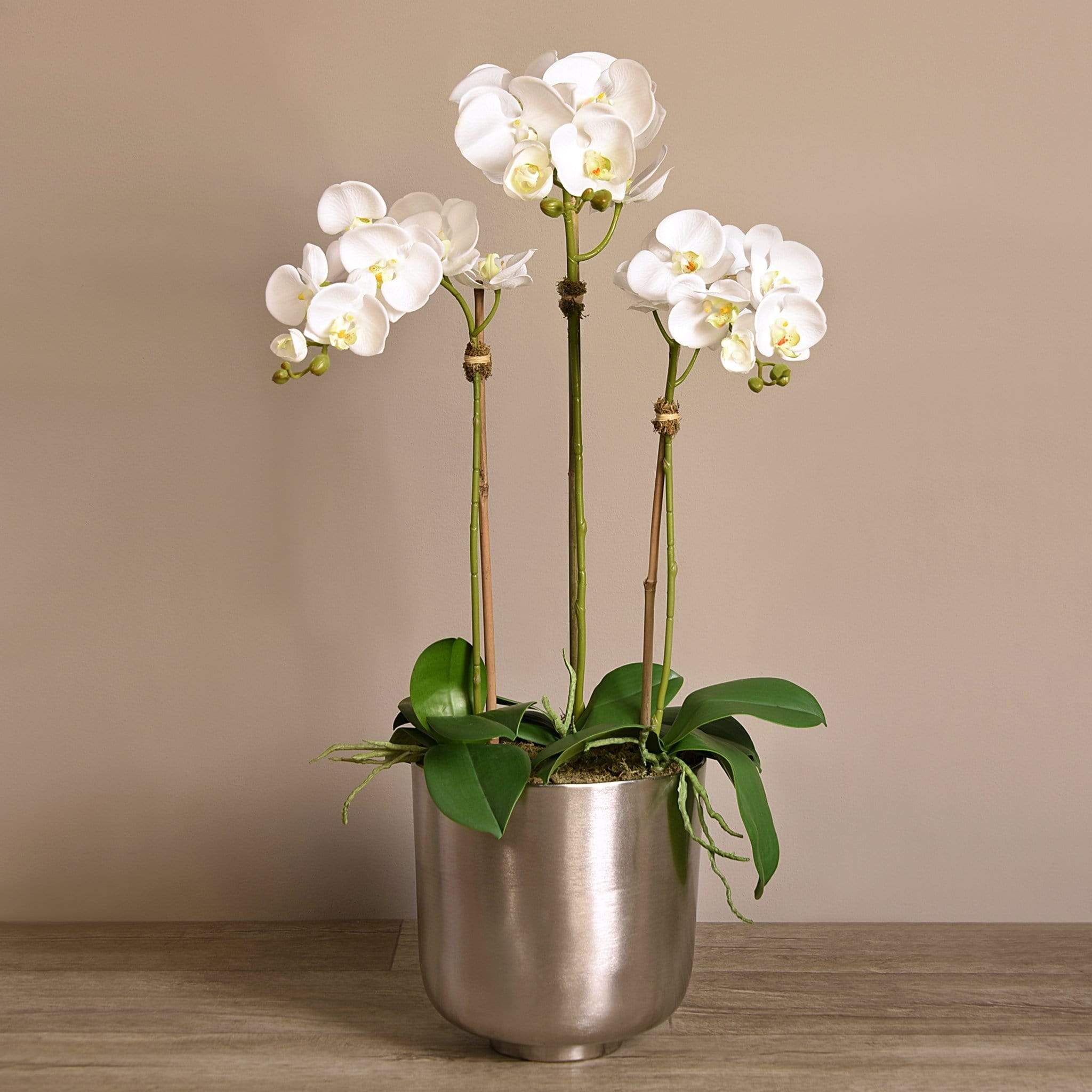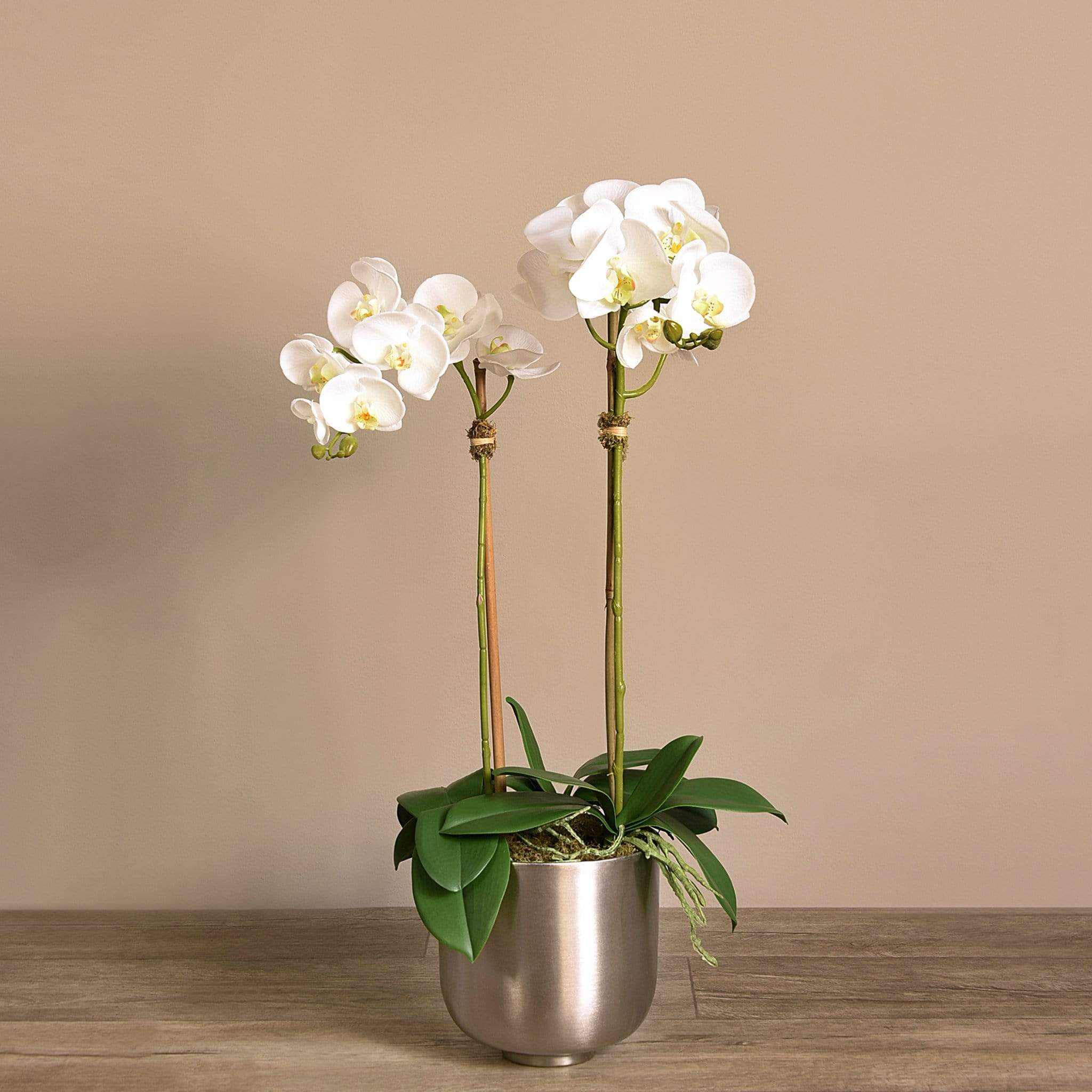 أضف لمسة من الأناقة والفخامة إلى منزلك مع هذا الترتيب الرائع من أوركيد صناعي. كل قطعة مصنوعة يدويًا على يد بائعي زهور مهرة باستخدام أقمشة حريرية عالية الجودة لتظهر بمظهر طبيعي ومقارب للواقعي. الإناء المعدني الفضي يضفي لمسة براقة تناسب الديكور العصري والكلاسيكي على حدّ سواء.