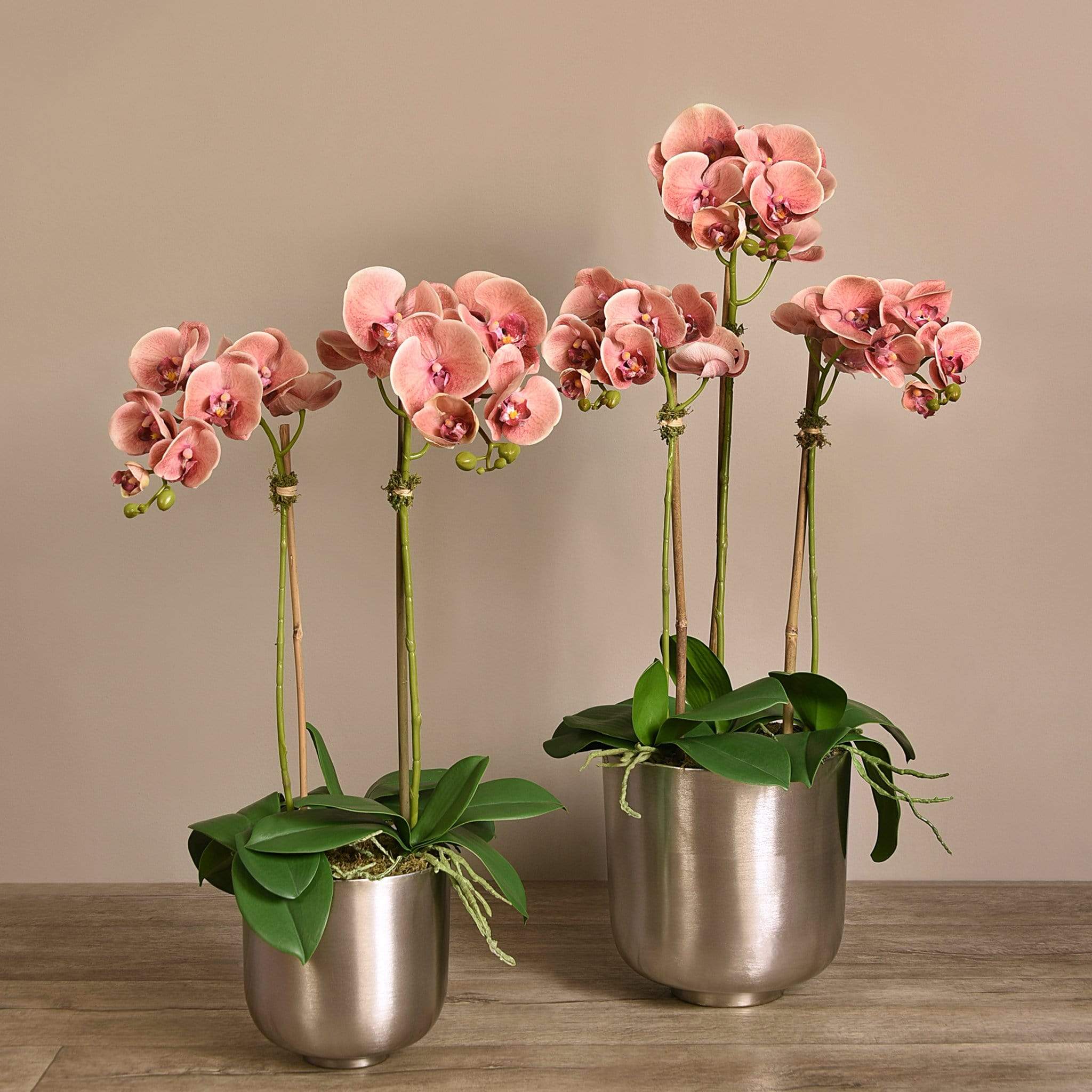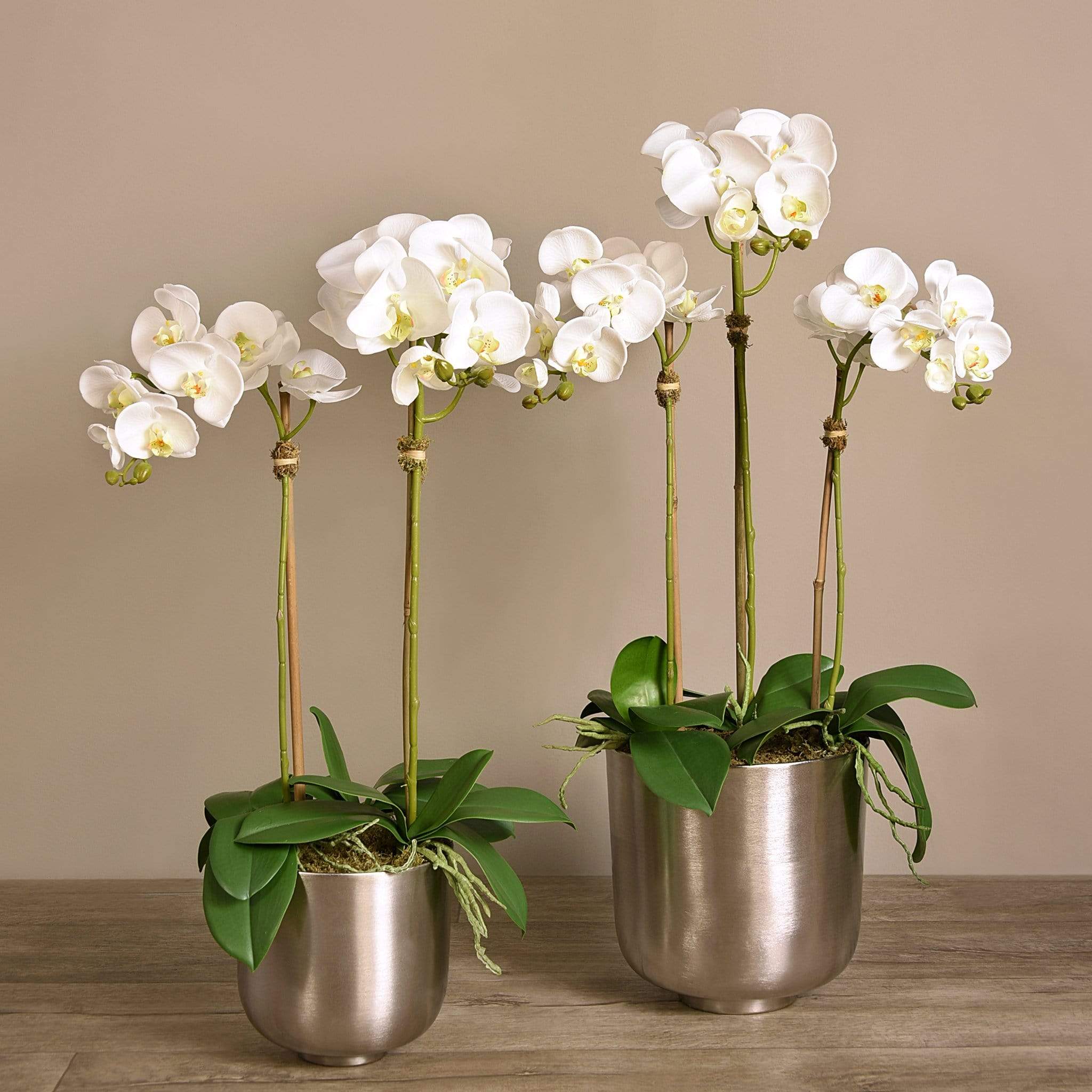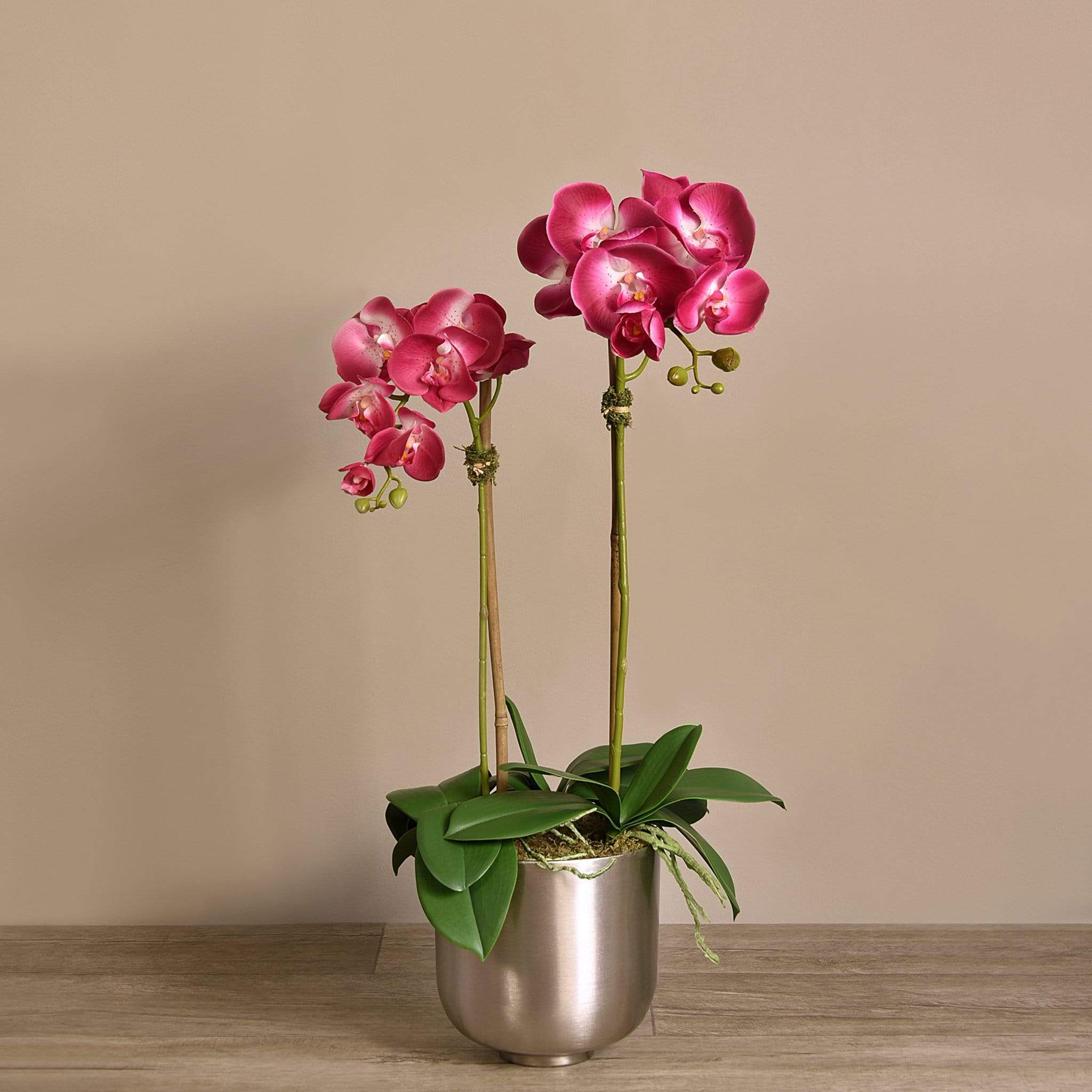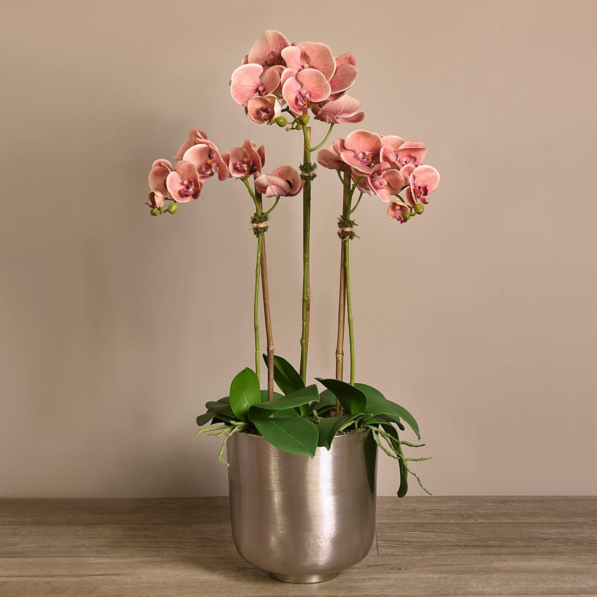 أضف لمسة من الأناقة والفخامة إلى منزلك مع هذا الترتيب الرائع من أوركيد صناعي. كل قطعة مصنوعة يدويًا على يد بائعي زهور مهرة باستخدام أقمشة حريرية عالية الجودة لتظهر بمظهر طبيعي ومقارب للواقعي. الإناء المعدني الفضي يضفي لمسة براقة تناسب الديكور العصري والكلاسيكي على حدّ سواء.