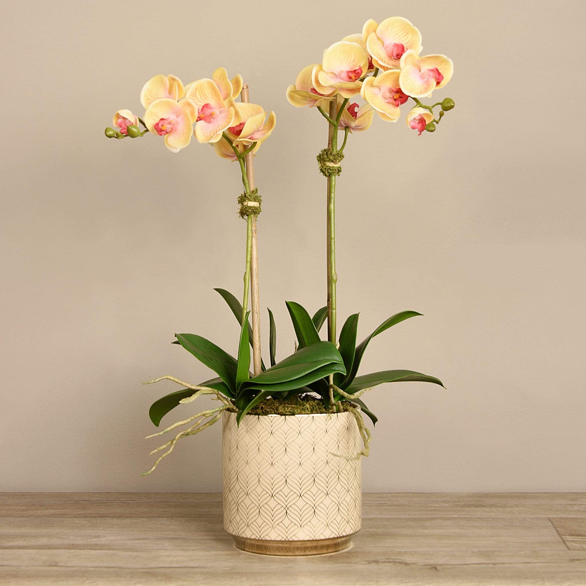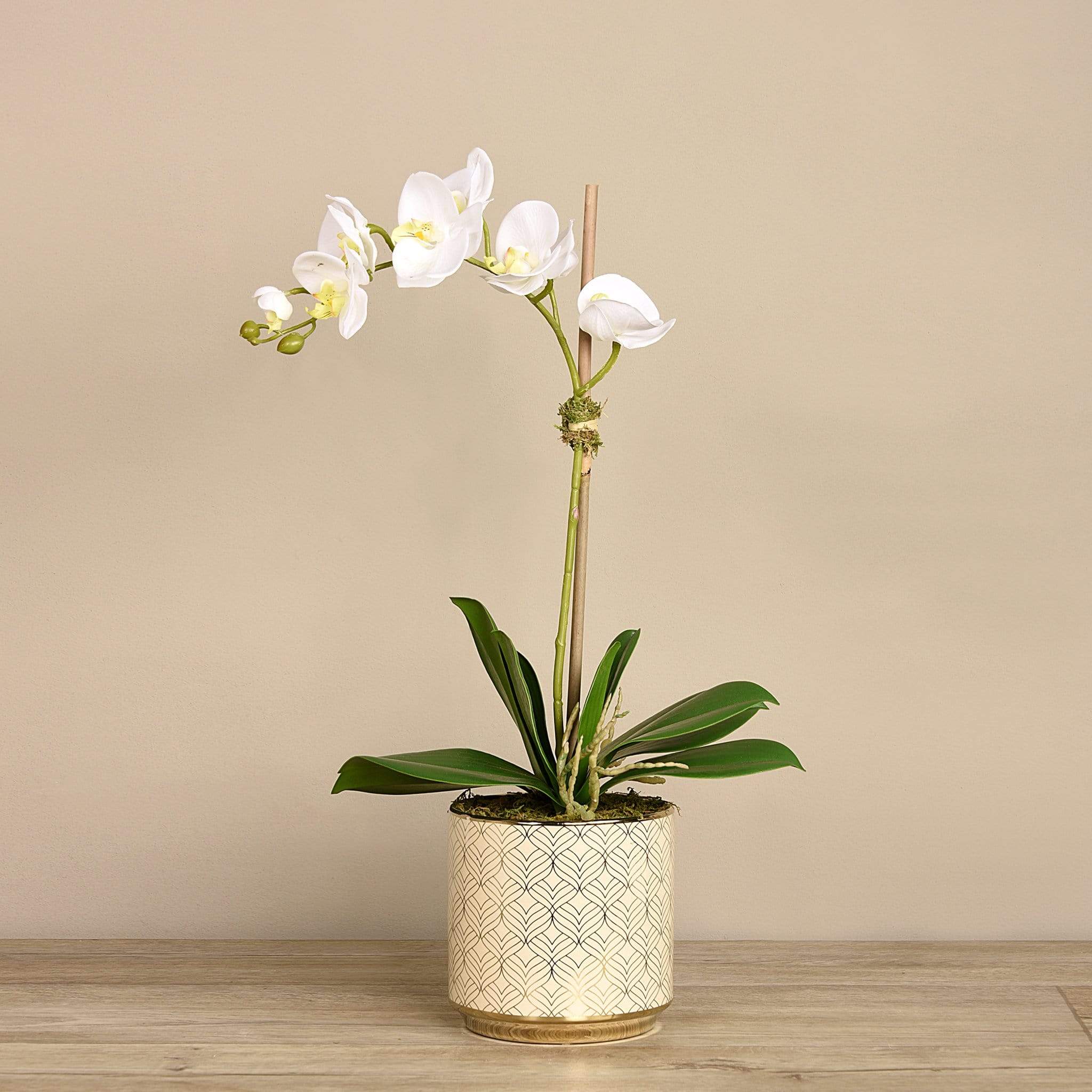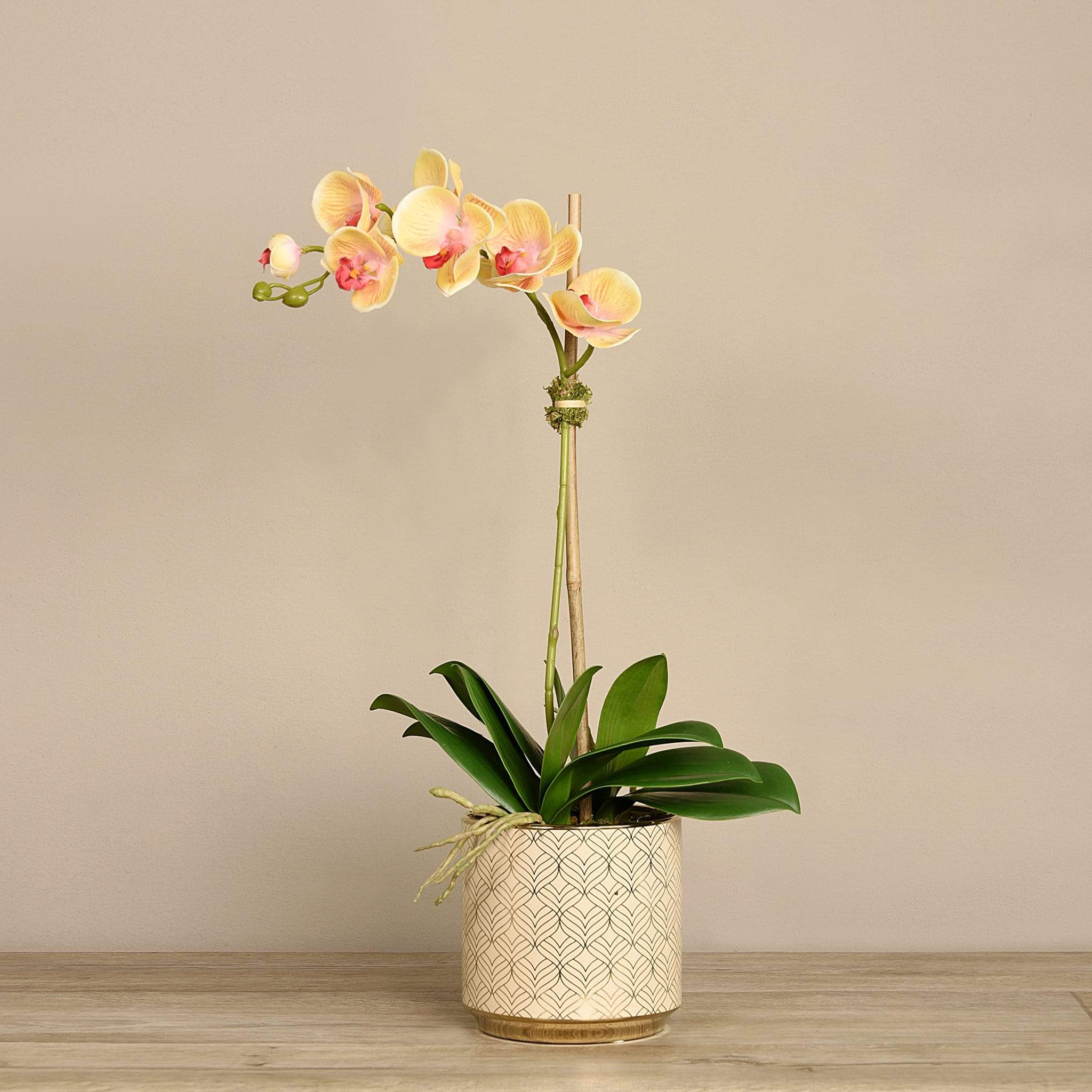 أضف لمسة أنيقة ومبهجة إلى منزلك مع هذا الترتيب من أوركيد صناعي المنظر — منسق يدويًا بواسطة فريق بائعي الزهور الداخليين لدينا. المظهر والملمس مصممان ليبدوان طبيعيين ونابضيْن بالحياة، بينما يكمل الإناء المزخرف باللونين الأبيض والذهبي بتلات الأوركيد الحيوية بشكل أنيق.