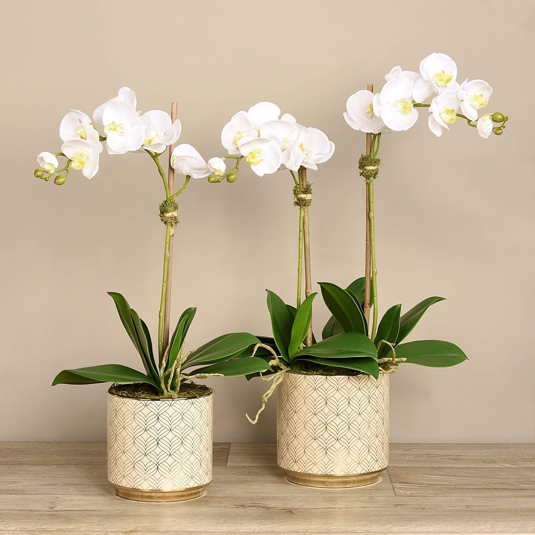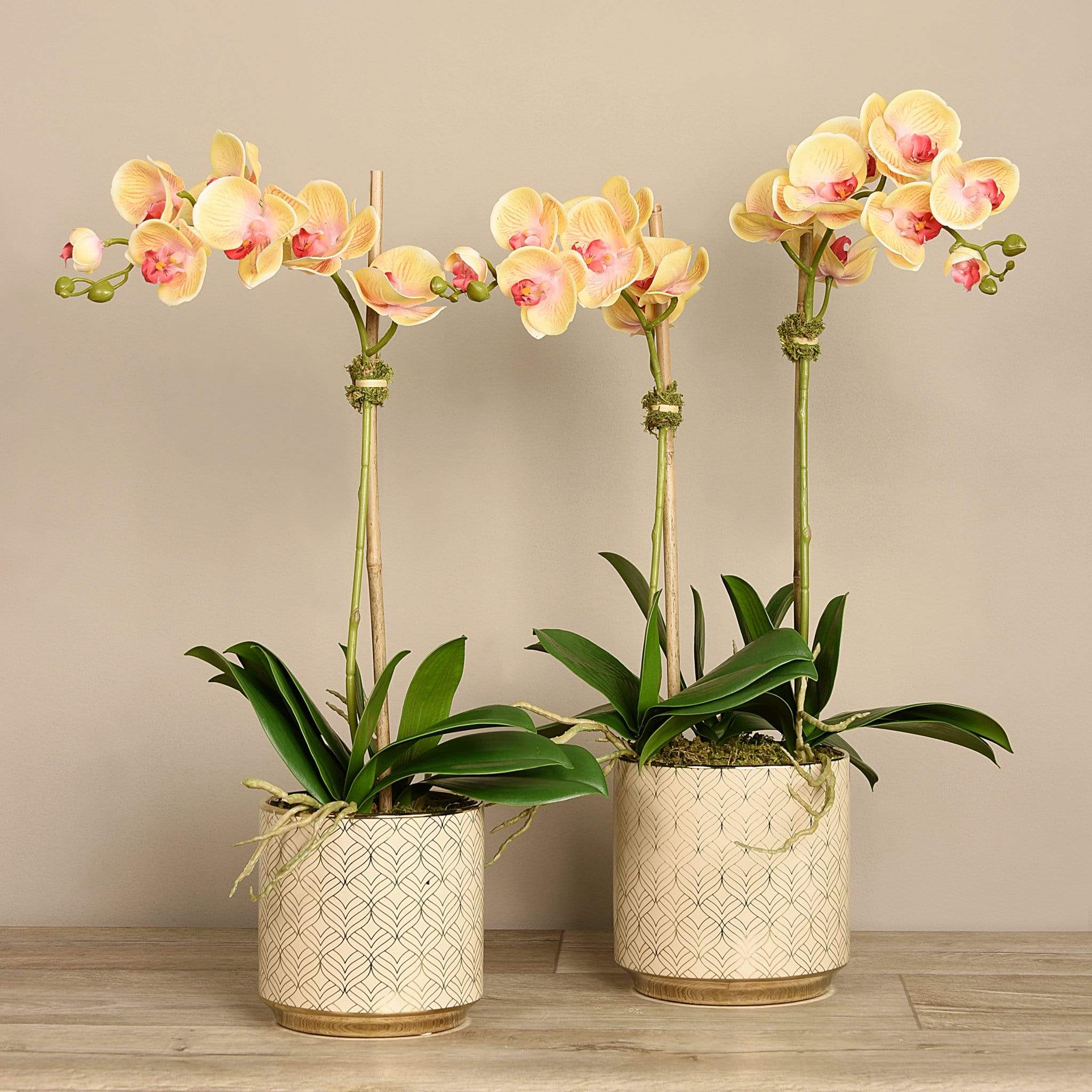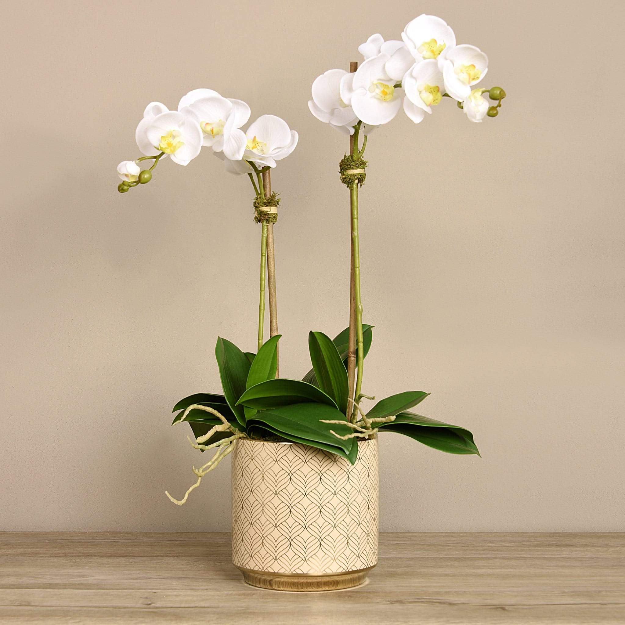 أضف لمسة أنيقة ومبهجة إلى منزلك مع هذا الترتيب من أوركيد صناعي المنظر — منسق يدويًا بواسطة فريق بائعي الزهور الداخليين لدينا. المظهر والملمس مصممان ليبدوان طبيعيين ونابضيْن بالحياة، بينما يكمل الإناء المزخرف باللونين الأبيض والذهبي بتلات الأوركيد الحيوية بشكل أنيق.