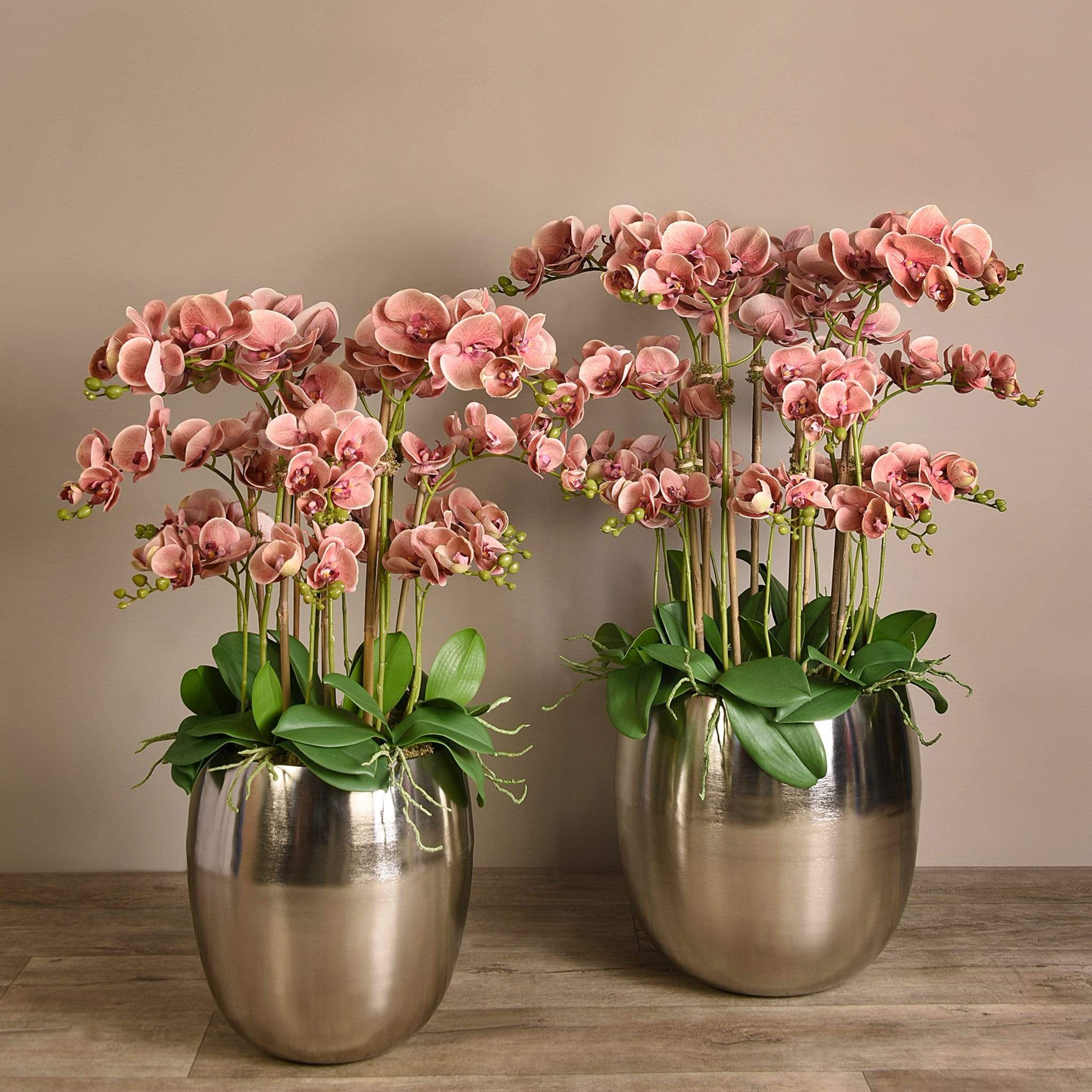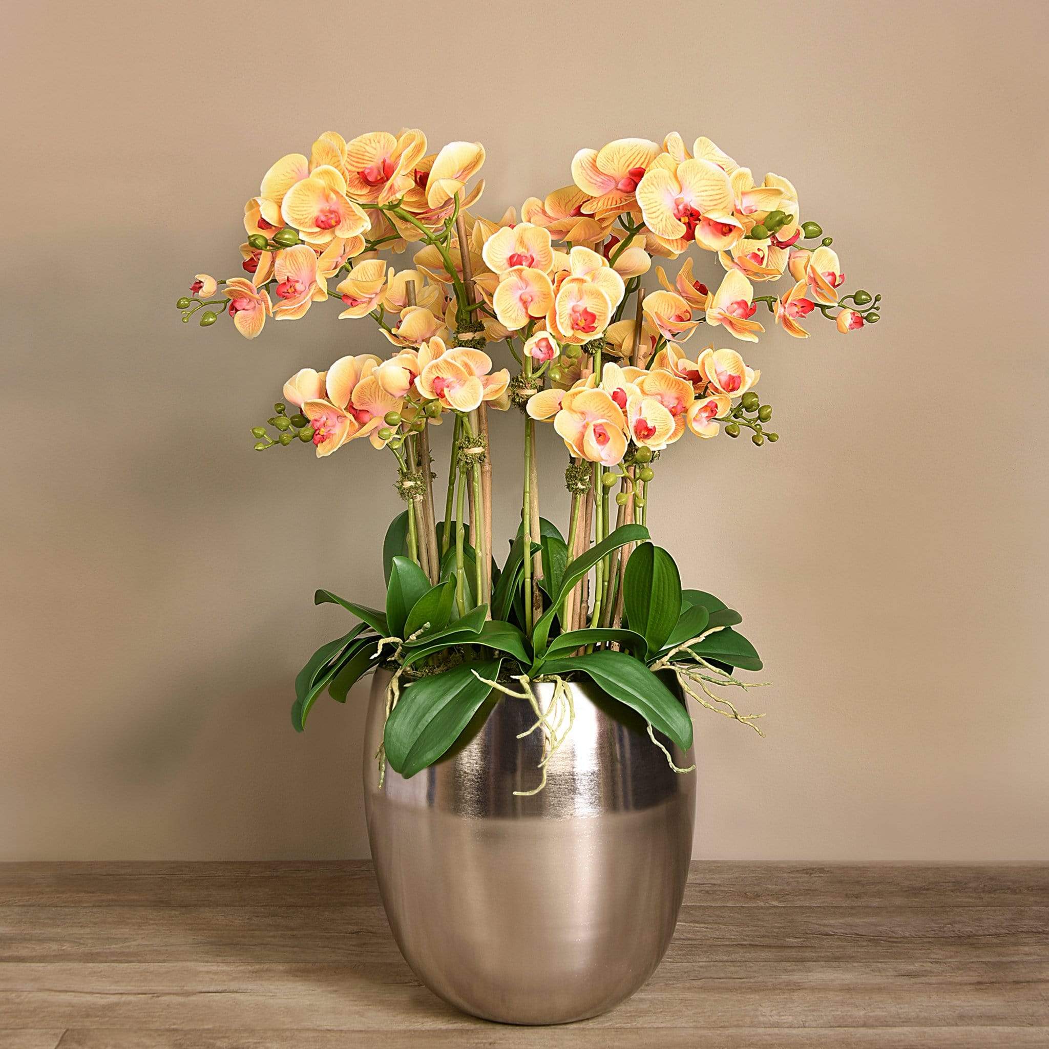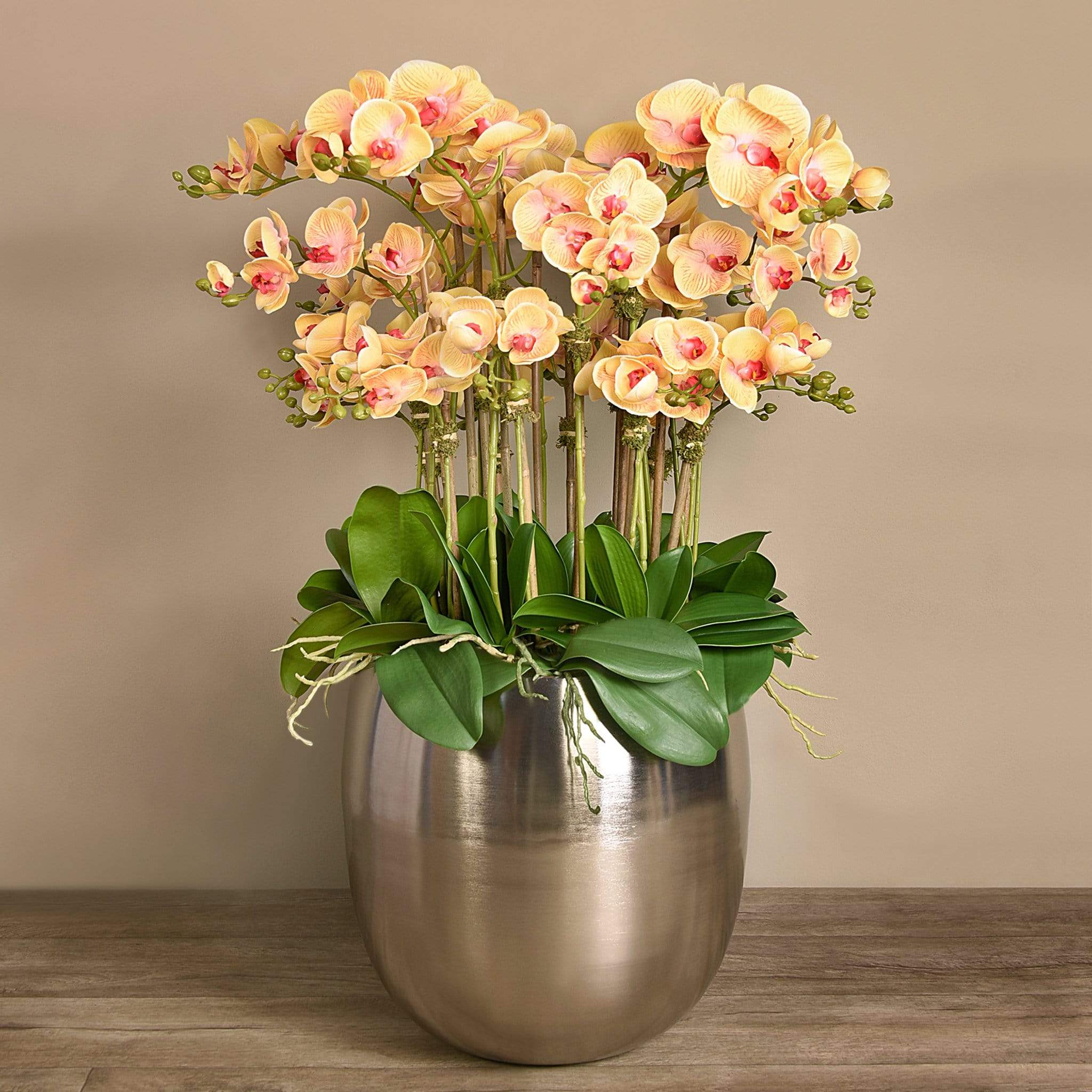 تشكيلة أوركيد ترحيبية ونابضة بالحياة بشكل لا يصدق. مصنوعة يدويًا من الحرير الناعم، تبدو هذه الأوركيد الاصطناعية حقيقية من أوراقها الخضراء السميكة إلى بتلاتها الناعمة. الإناء الفضي المعدني يضيف لمسة براقة وأنيقة لهذا الترتيب الجميل.