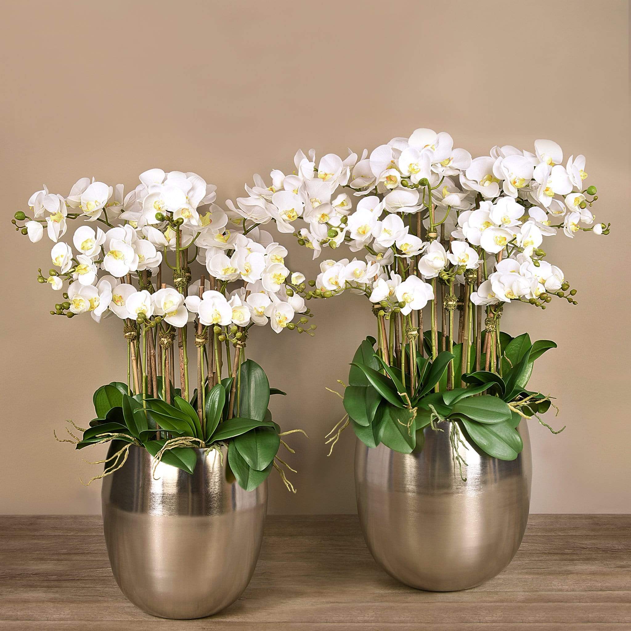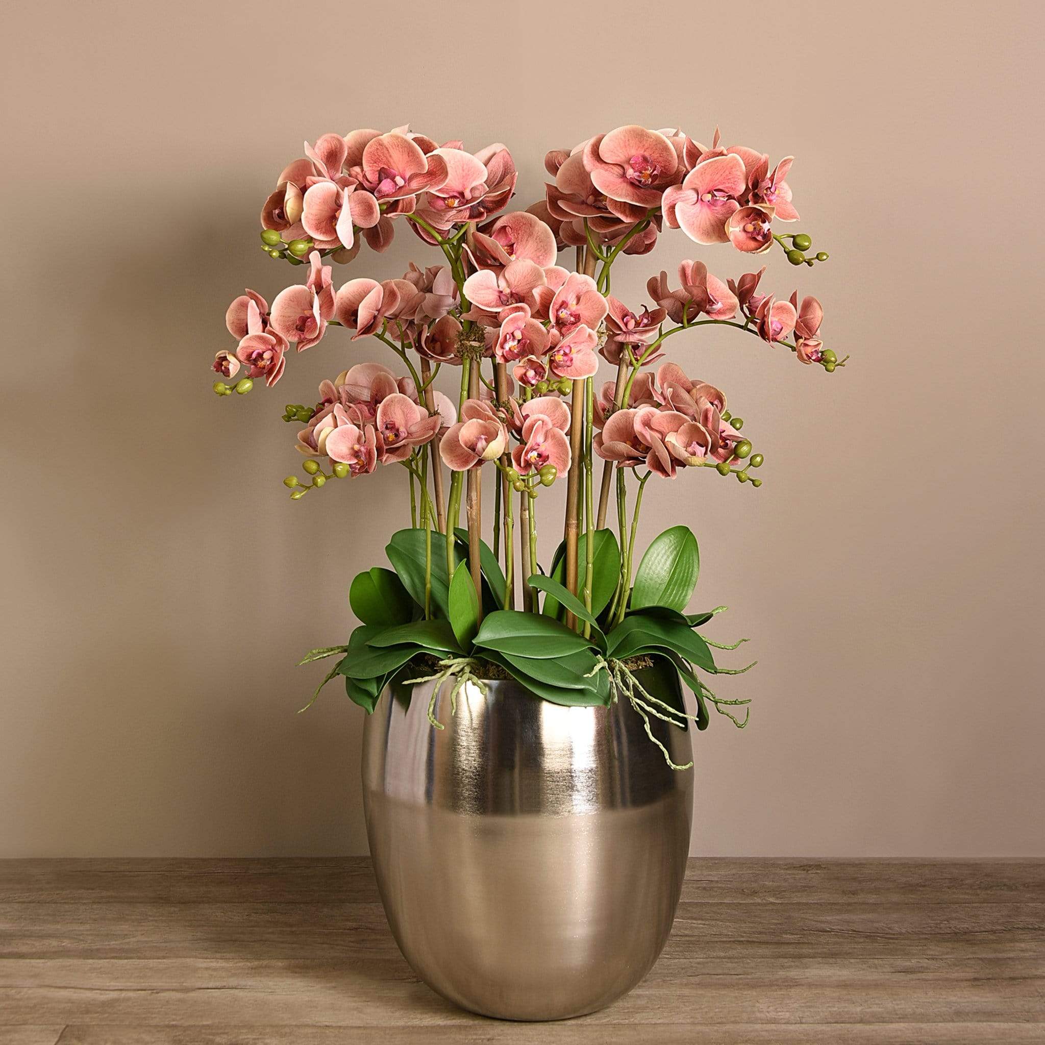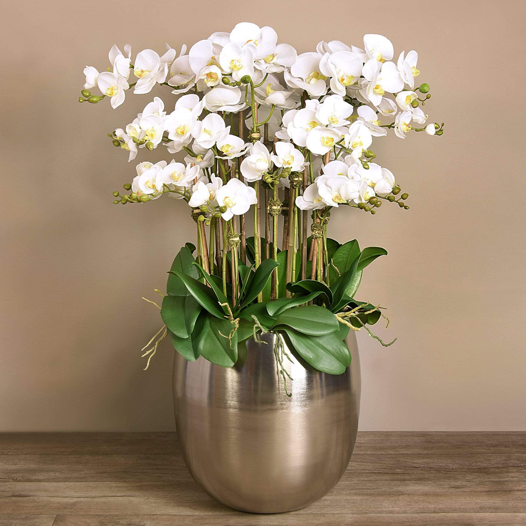 تشكيلة أوركيد ترحيبية ونابضة بالحياة بشكل لا يصدق. مصنوعة يدويًا من الحرير الناعم، تبدو هذه الأوركيد الاصطناعية حقيقية من أوراقها الخضراء السميكة إلى بتلاتها الناعمة. الإناء الفضي المعدني يضيف لمسة براقة وأنيقة لهذا الترتيب الجميل.