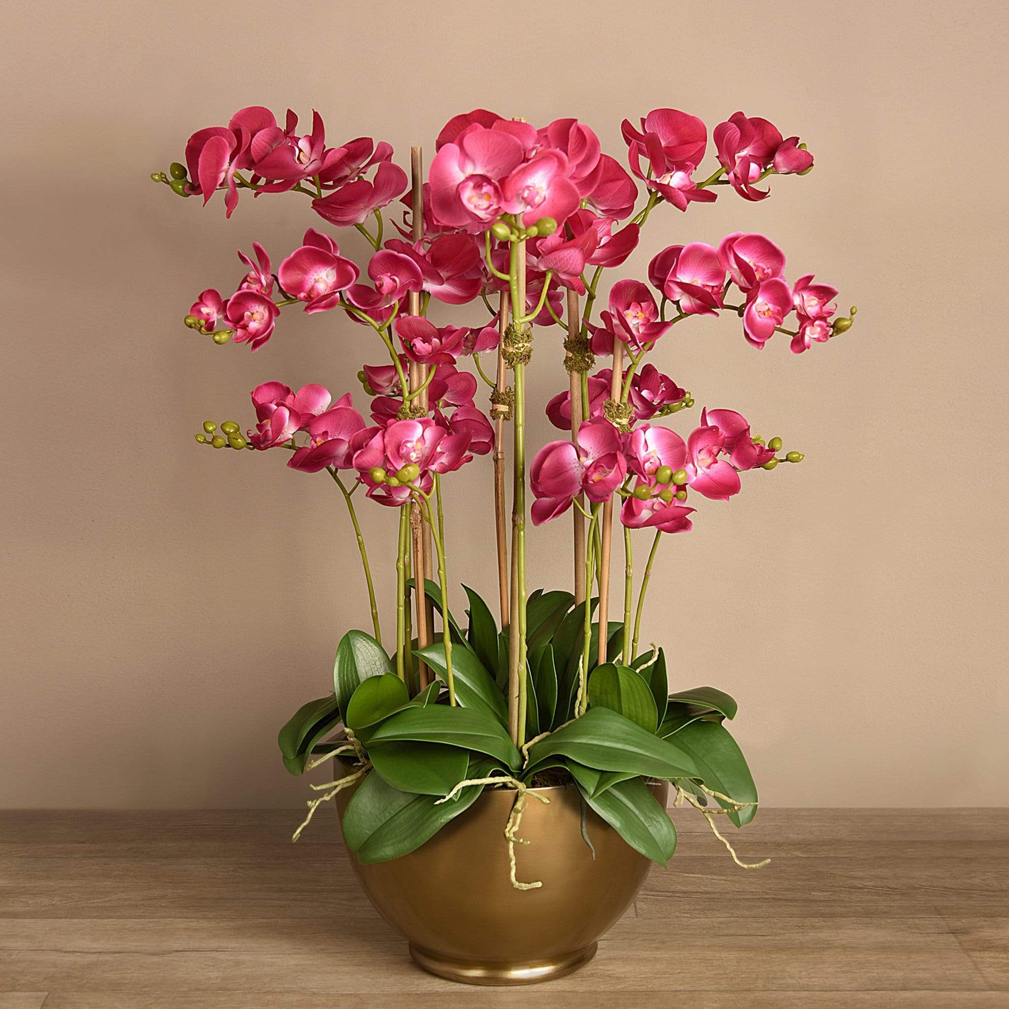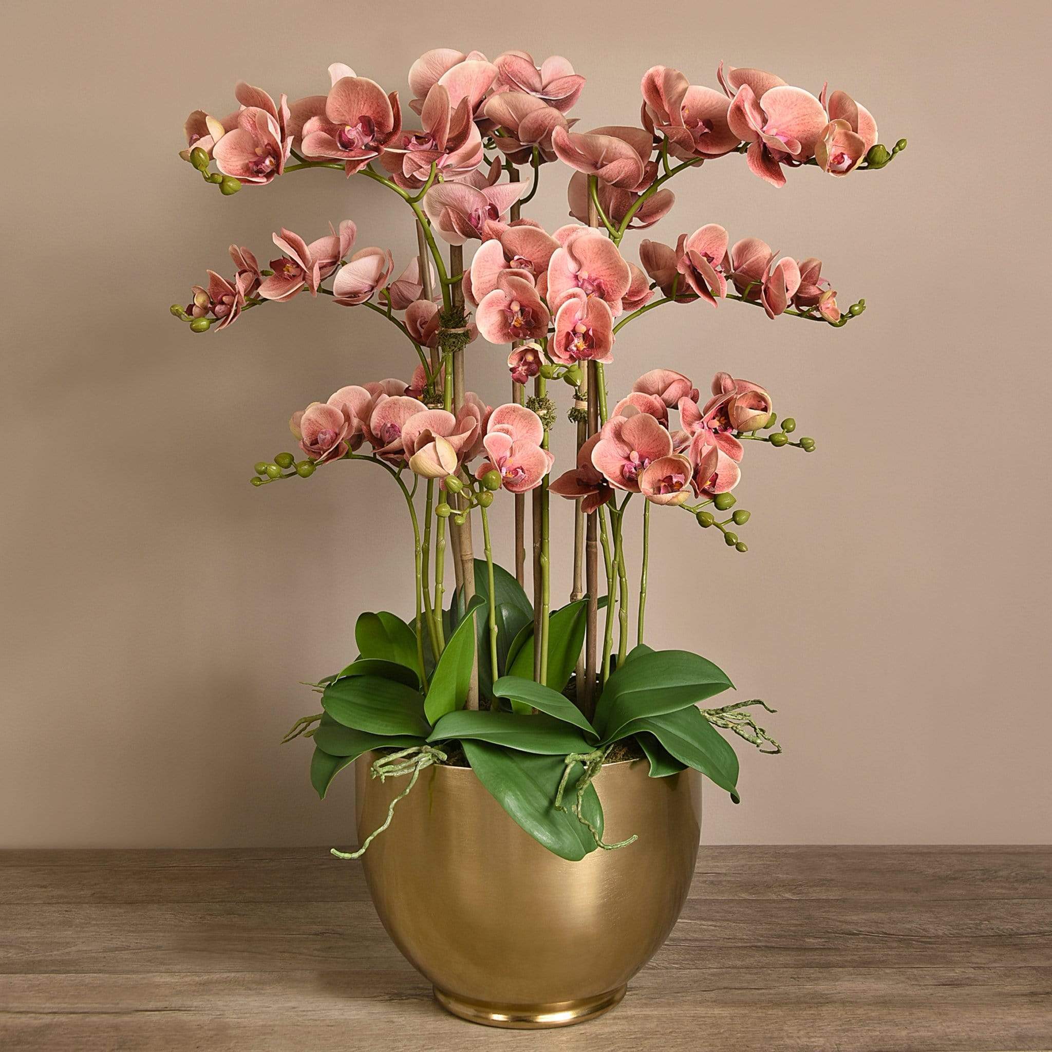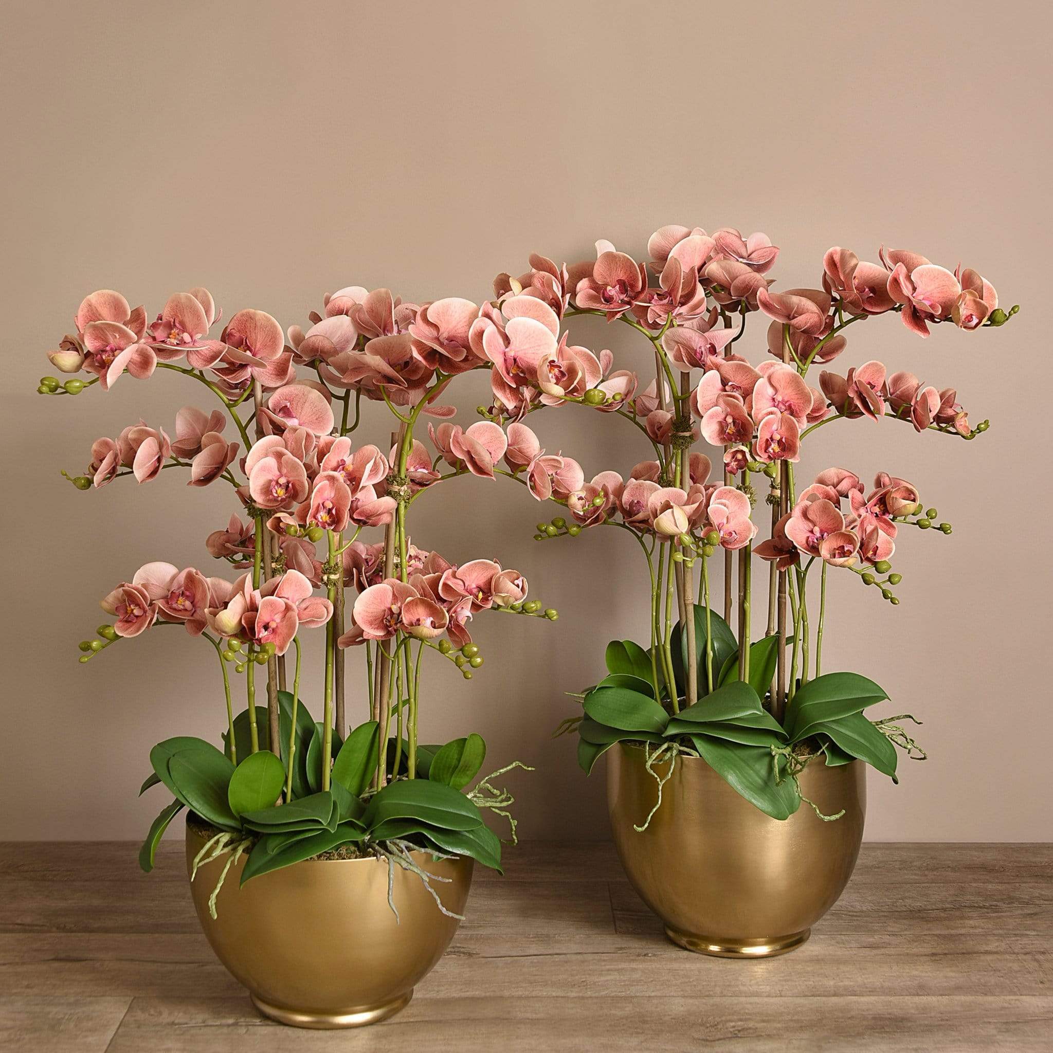 حوّل مساحتك إلى واحة أنيقة مع ترتيب أوركيد مصمم بعناية. كل قطعة مصنوعة يدويًا على يد بائعي زهور خبراء من حرير فاخر، مما يمنح الأزهار مظهرًا واقعيًا يضفي دفئًا وفخامة على أي غرفة. الوعاء الذهبي الكبير يضيف لمسة نهائية راقية ويجعل هذه التركيبة قطعة مركزية مثالية للمنزل أو المكتب.