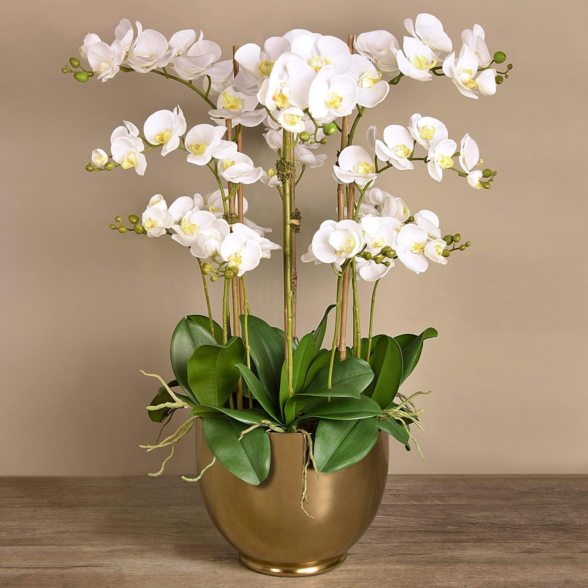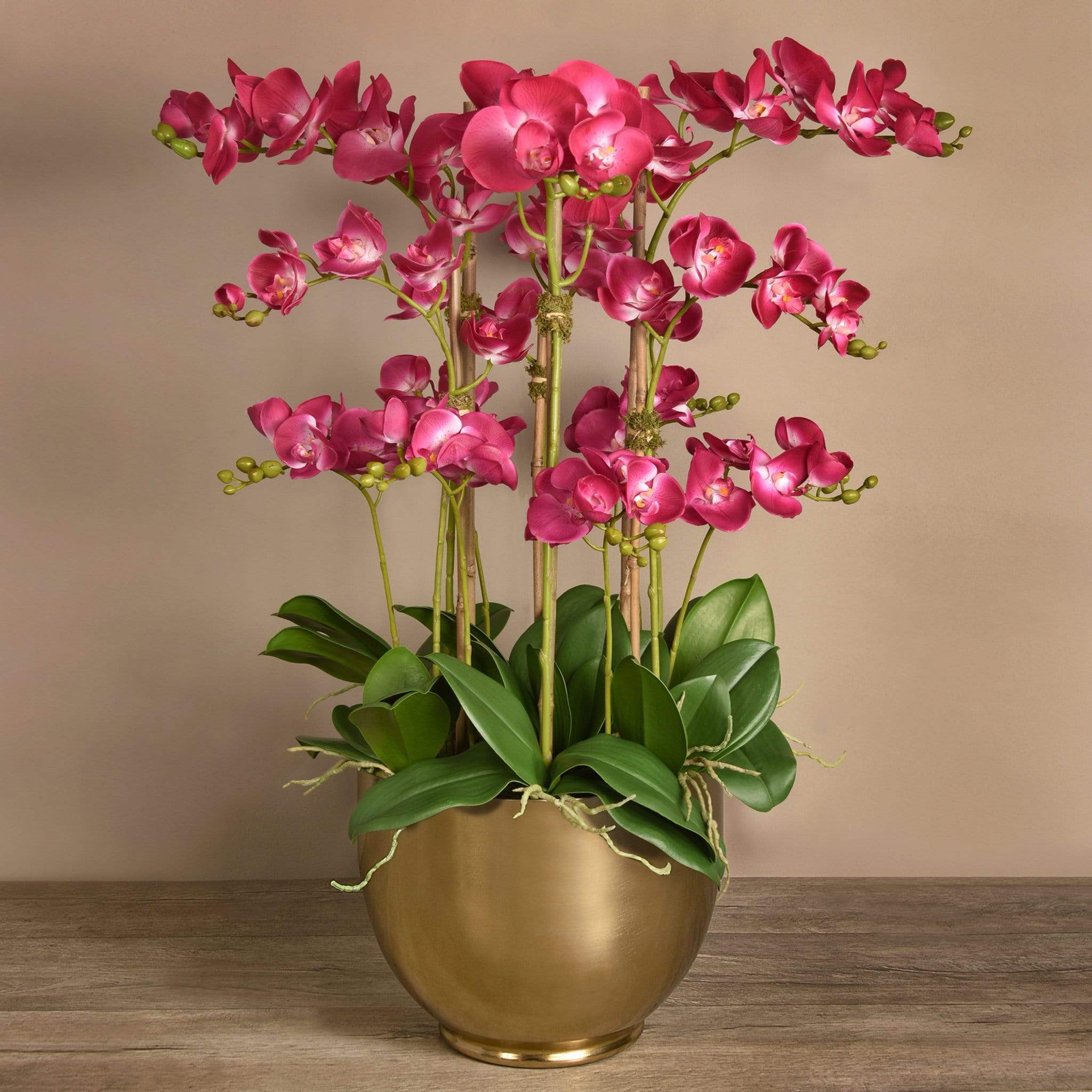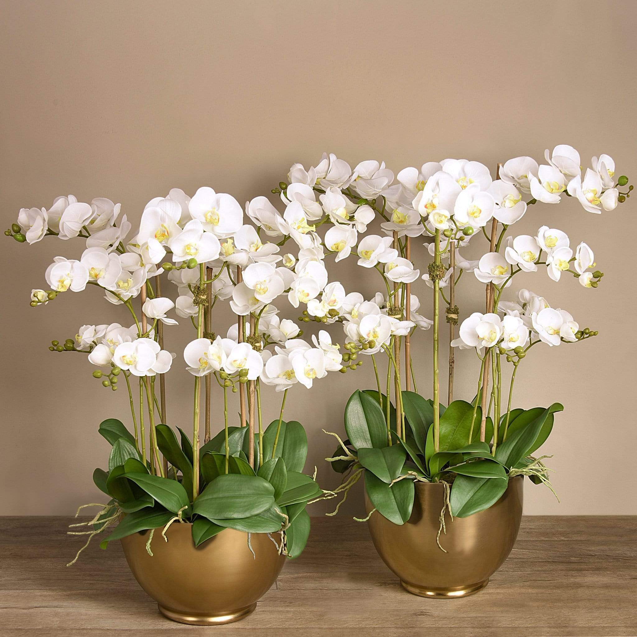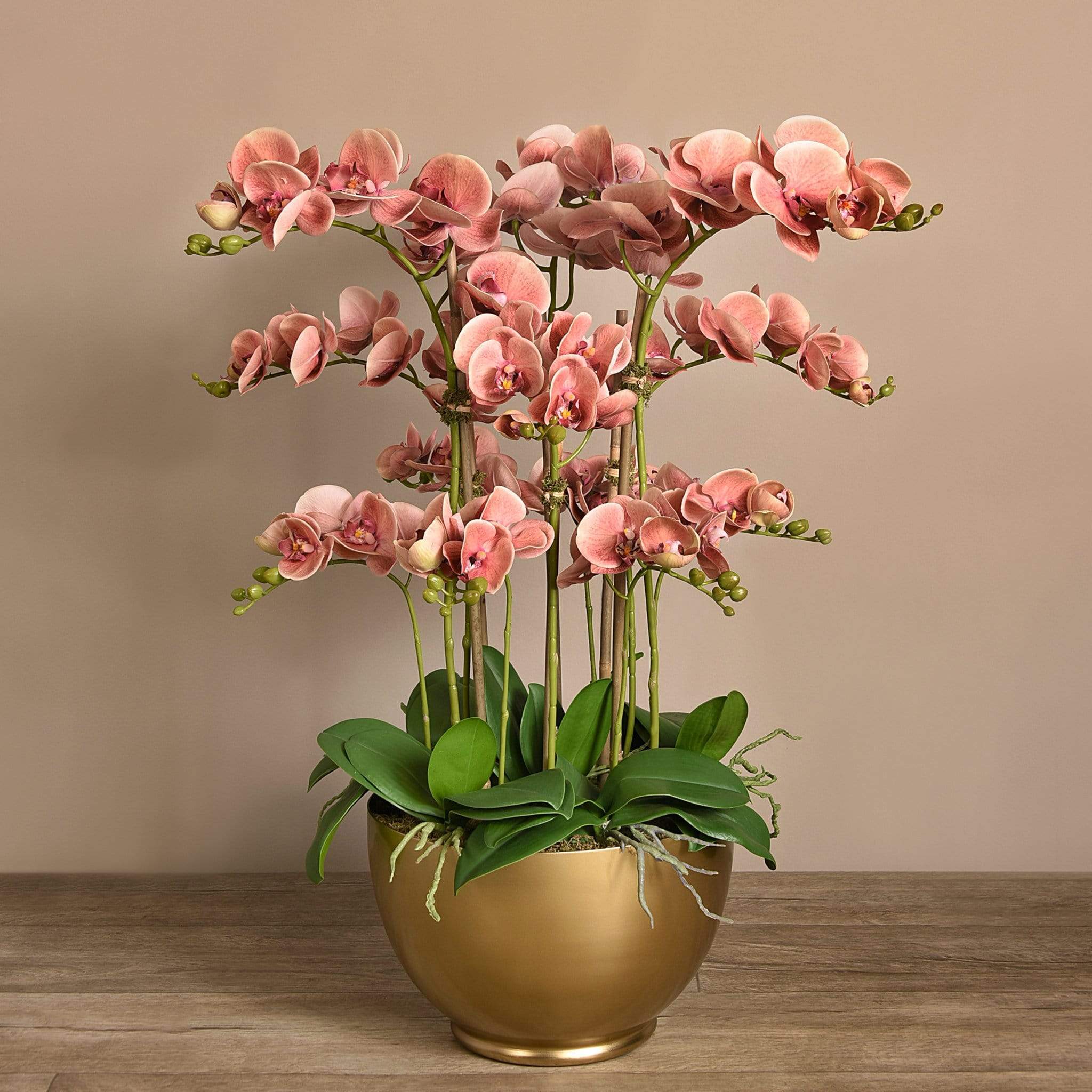 حوّل مساحتك إلى واحة أنيقة مع ترتيب أوركيد مصمم بعناية. كل قطعة مصنوعة يدويًا على يد بائعي زهور خبراء من حرير فاخر، مما يمنح الأزهار مظهرًا واقعيًا يضفي دفئًا وفخامة على أي غرفة. الوعاء الذهبي الكبير يضيف لمسة نهائية راقية ويجعل هذه التركيبة قطعة مركزية مثالية للمنزل أو المكتب.