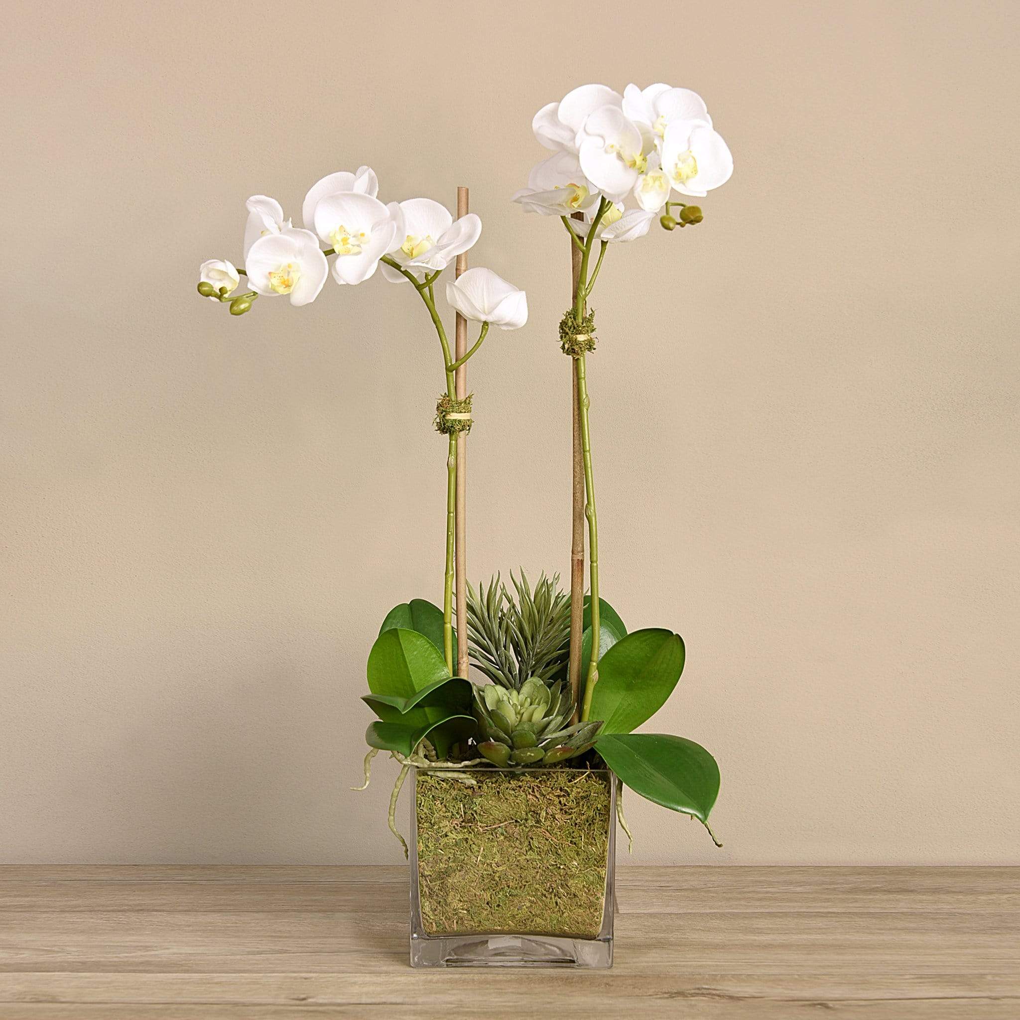 تشكيلة أنيقة تجمع بين أزهار الأوركيد الملكية ومجموعة مبهرة من النباتات الصحراوية الاصطناعية، مصممة لتسرق الأنظار وتضفي لمسة من الفخامة الطبيعية على أي مكان. أُعدت هذه التوليفة بعناية على أيدي منسقي زهور ونباتات محترفين لتبدو وتُحسّ كمظهر طبيعي تمامًا، وتُقدّم داخل أصيص مكعب أنيق يمنحها طابعًا عصريًا متناغمًا مع مختلف الديكورات.