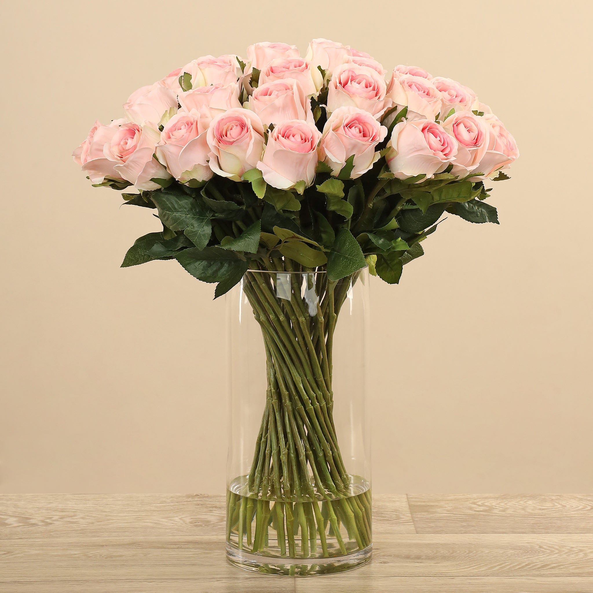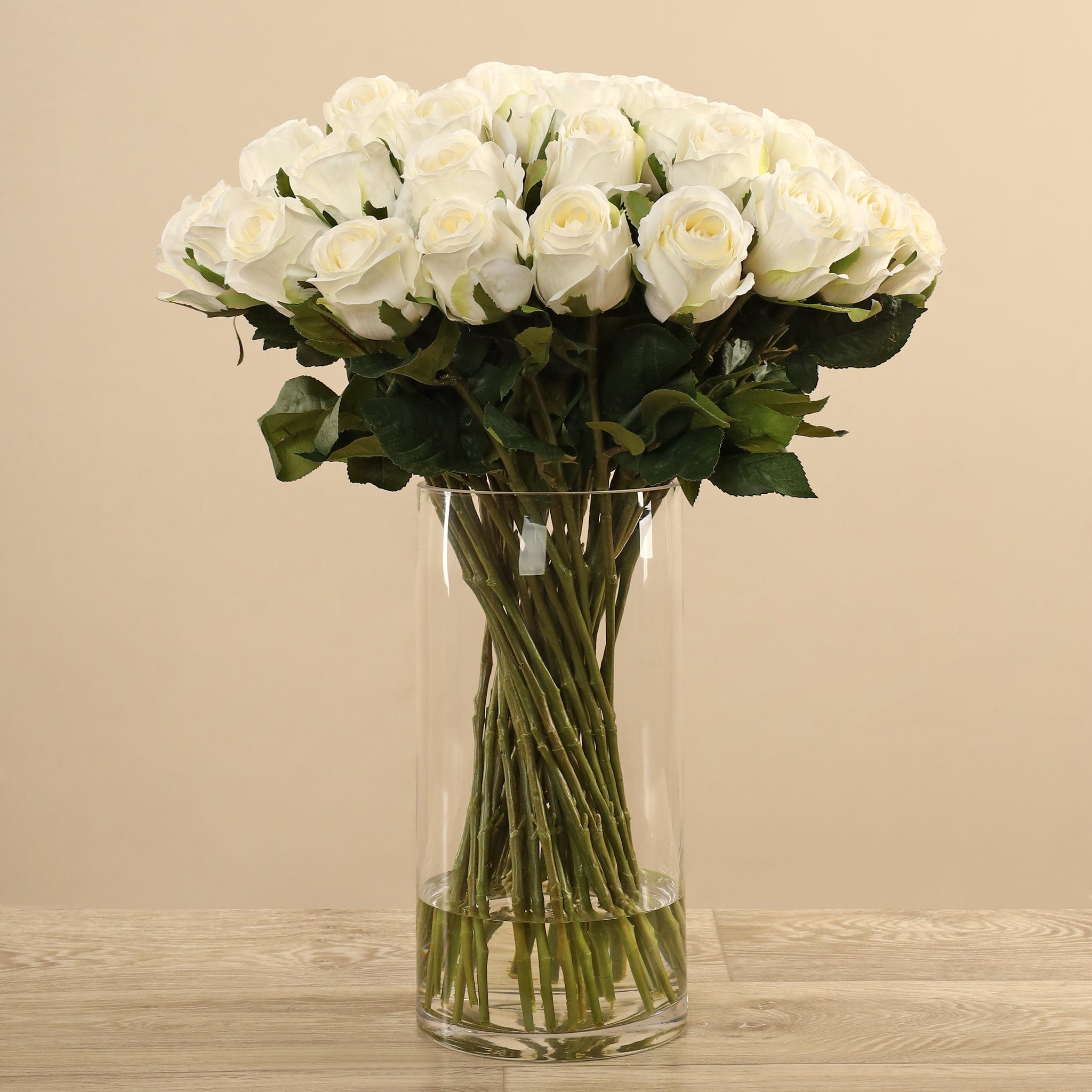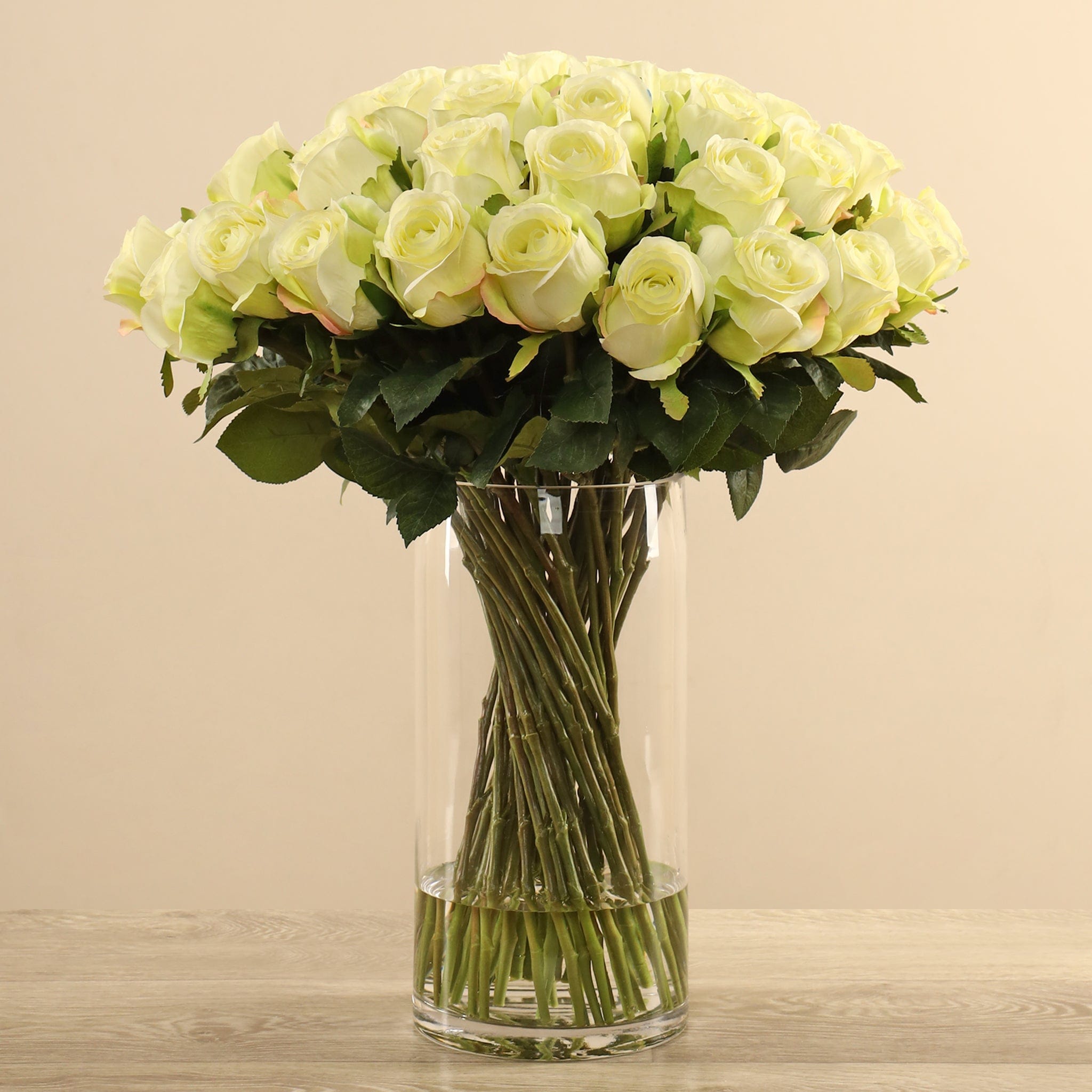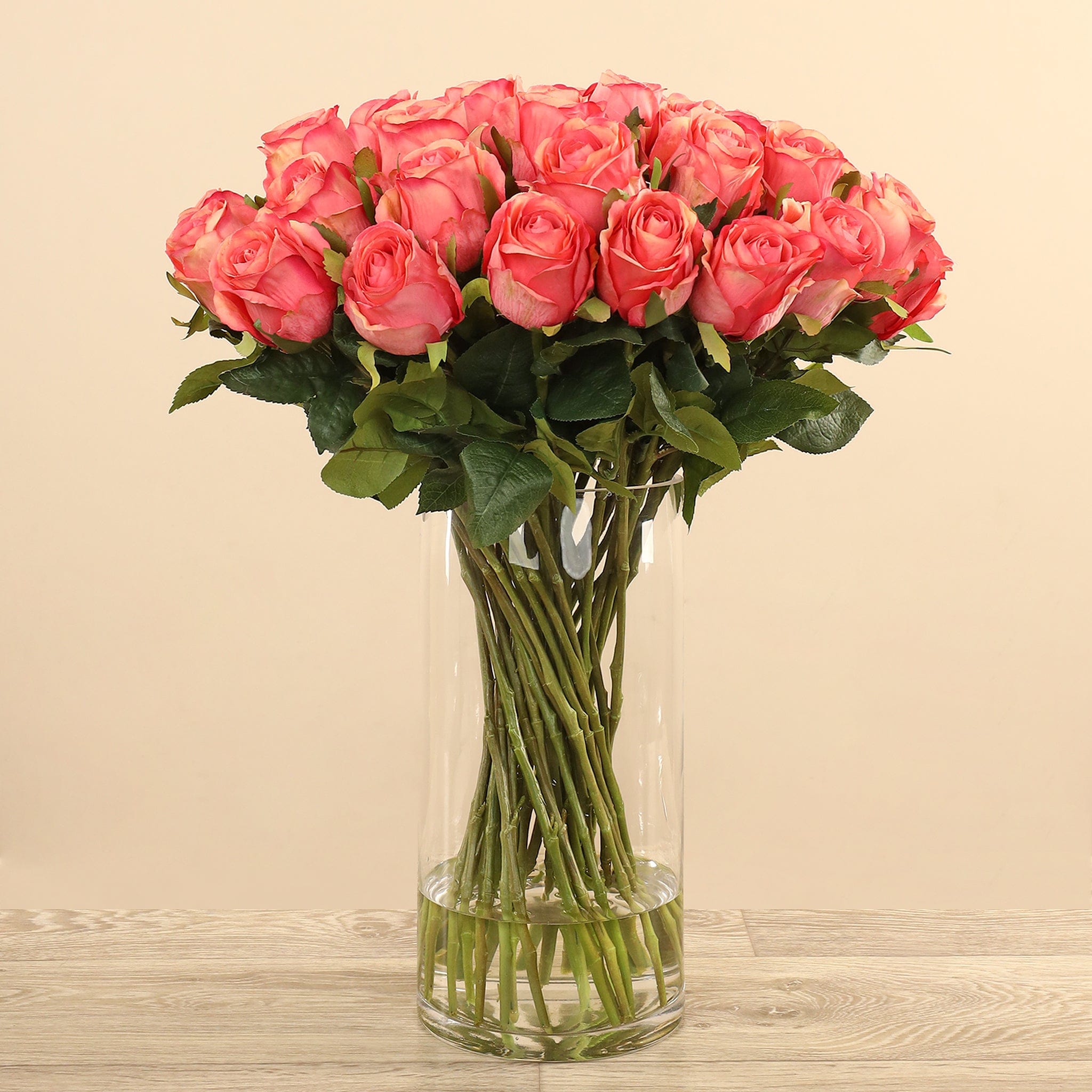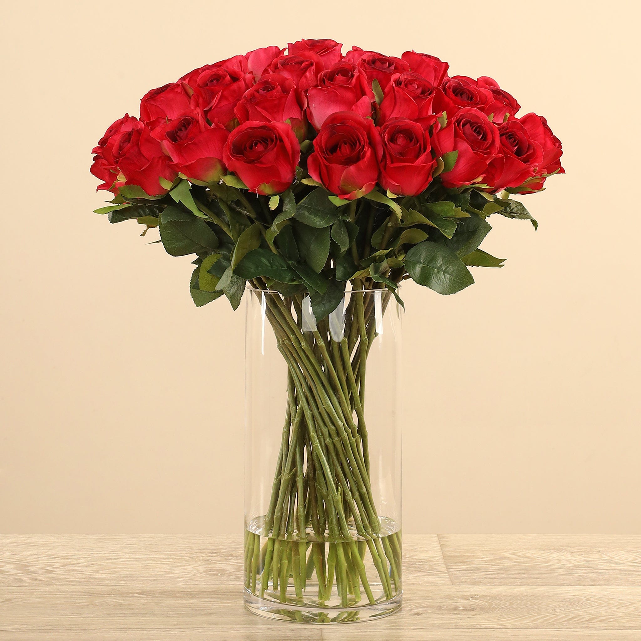 تشكيلة أنيقة من الورود الصناعية تعبّر عن الحب والرومانسية بطريقة دائمة. أزهارها نقية المظهر، وأوراقها يانعة، وسيقانها الخضراء الطويلة تمنحها إحساسًا طبيعيًا وكأنها فعلاً نبتت للتو. المزهرية الزجاجية الطويلة تكشف عن جمال الترتيب وتضفي لمسة شفافة وأنيقة تناسب أي مكان.
