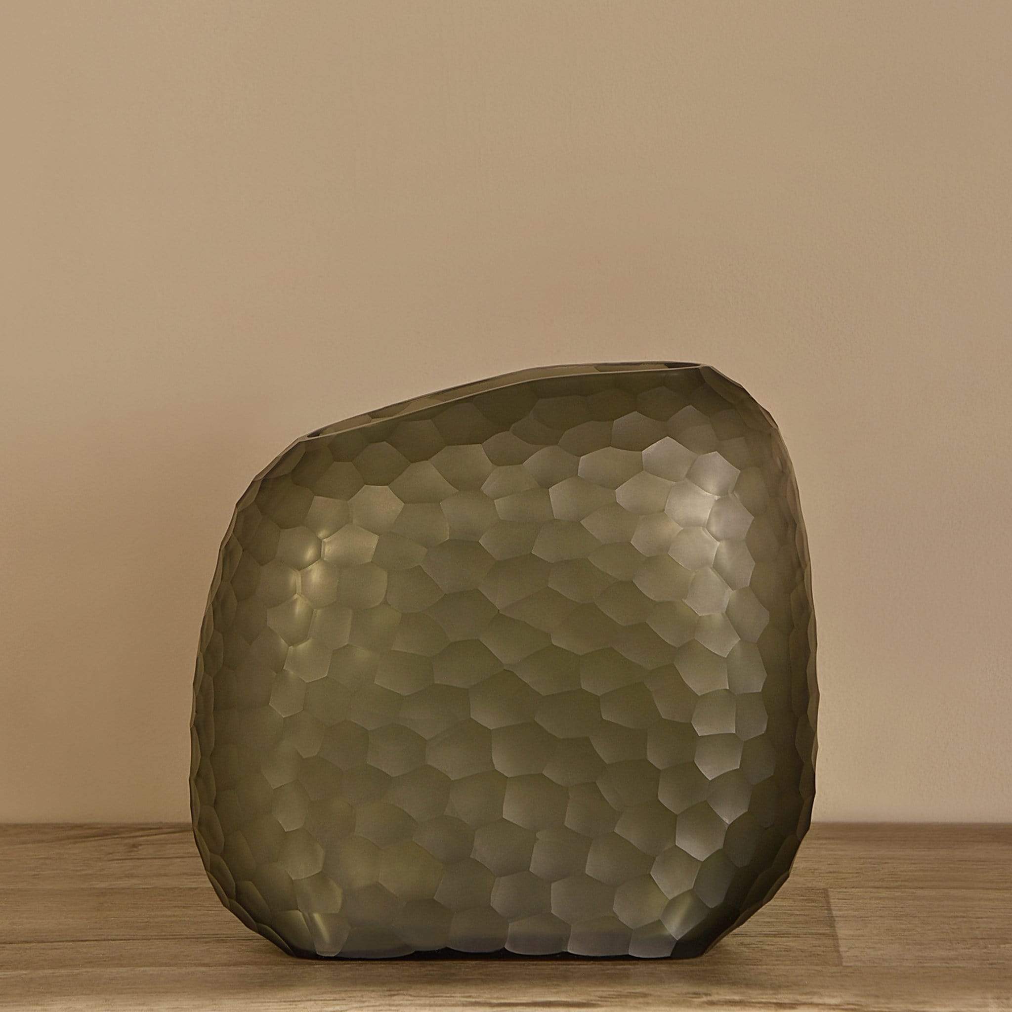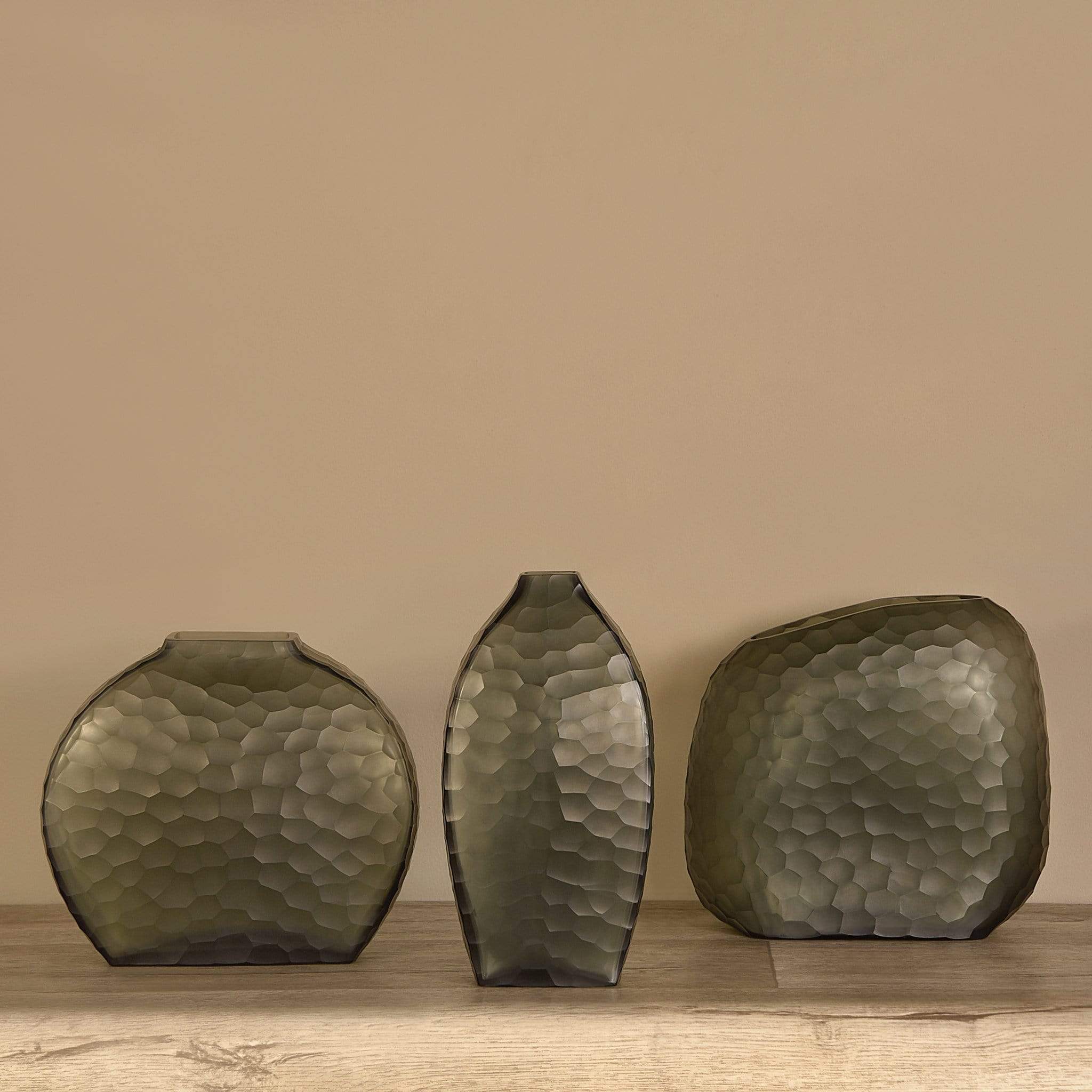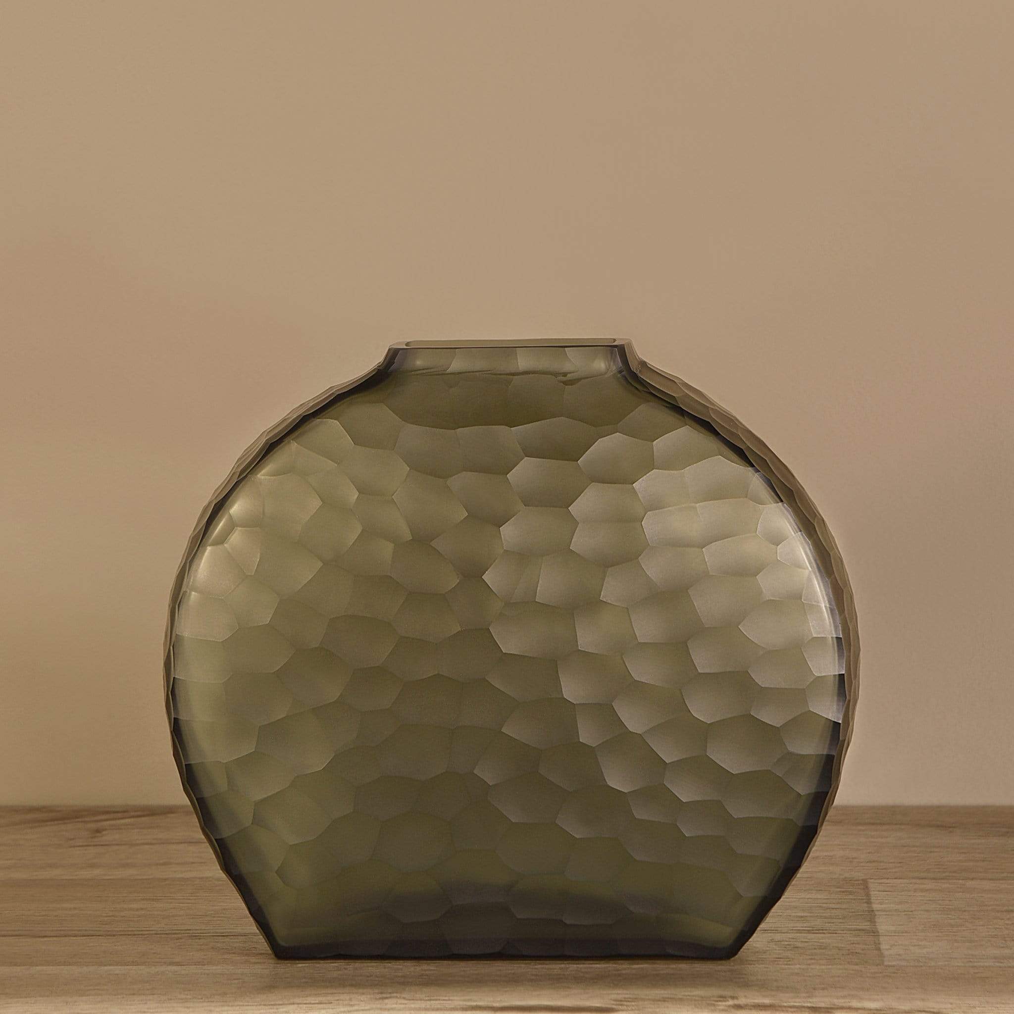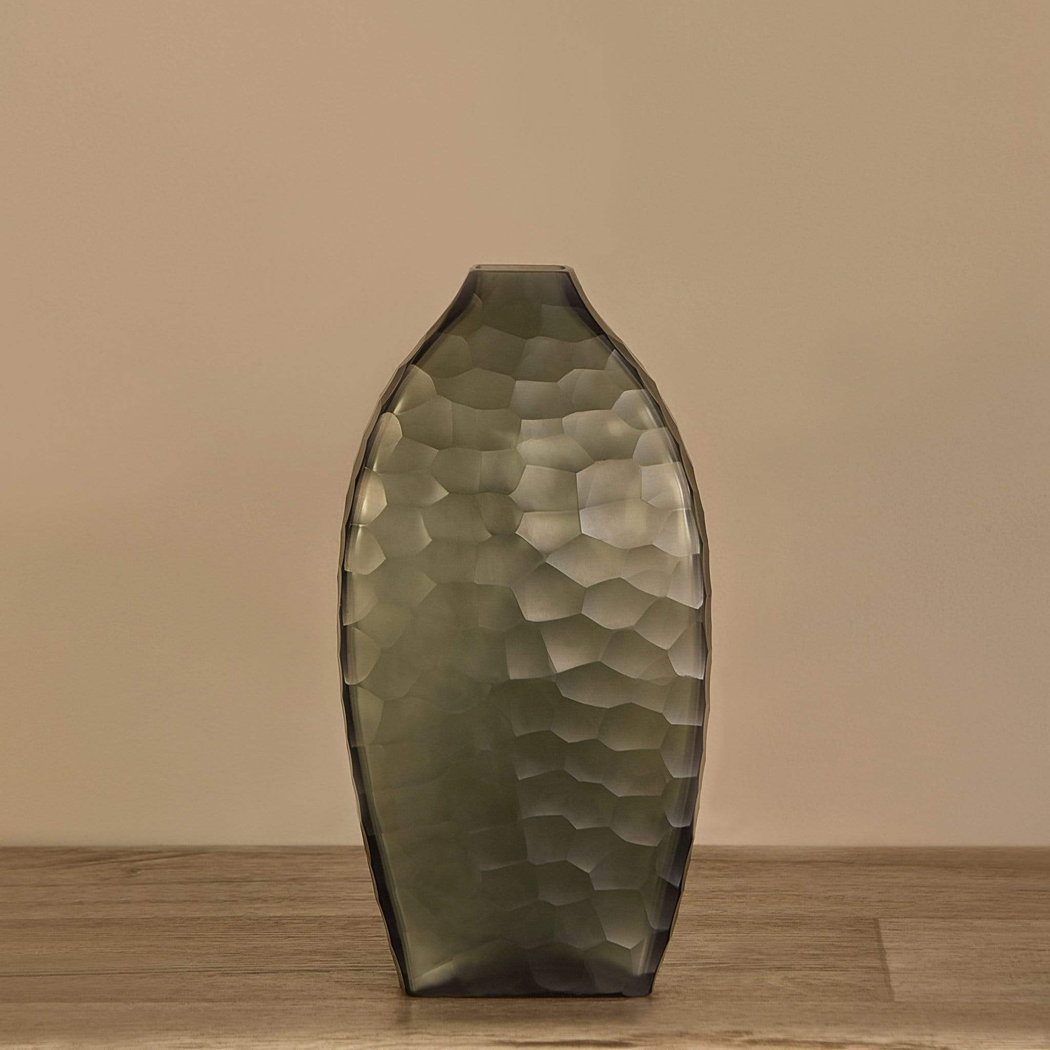 مزهرية زجاجية أنيقة بتصميم مميز ولون رمادي مدخن، تضيف لمسة أنيقة وعصرية إلى أي مساحة داخلية.
