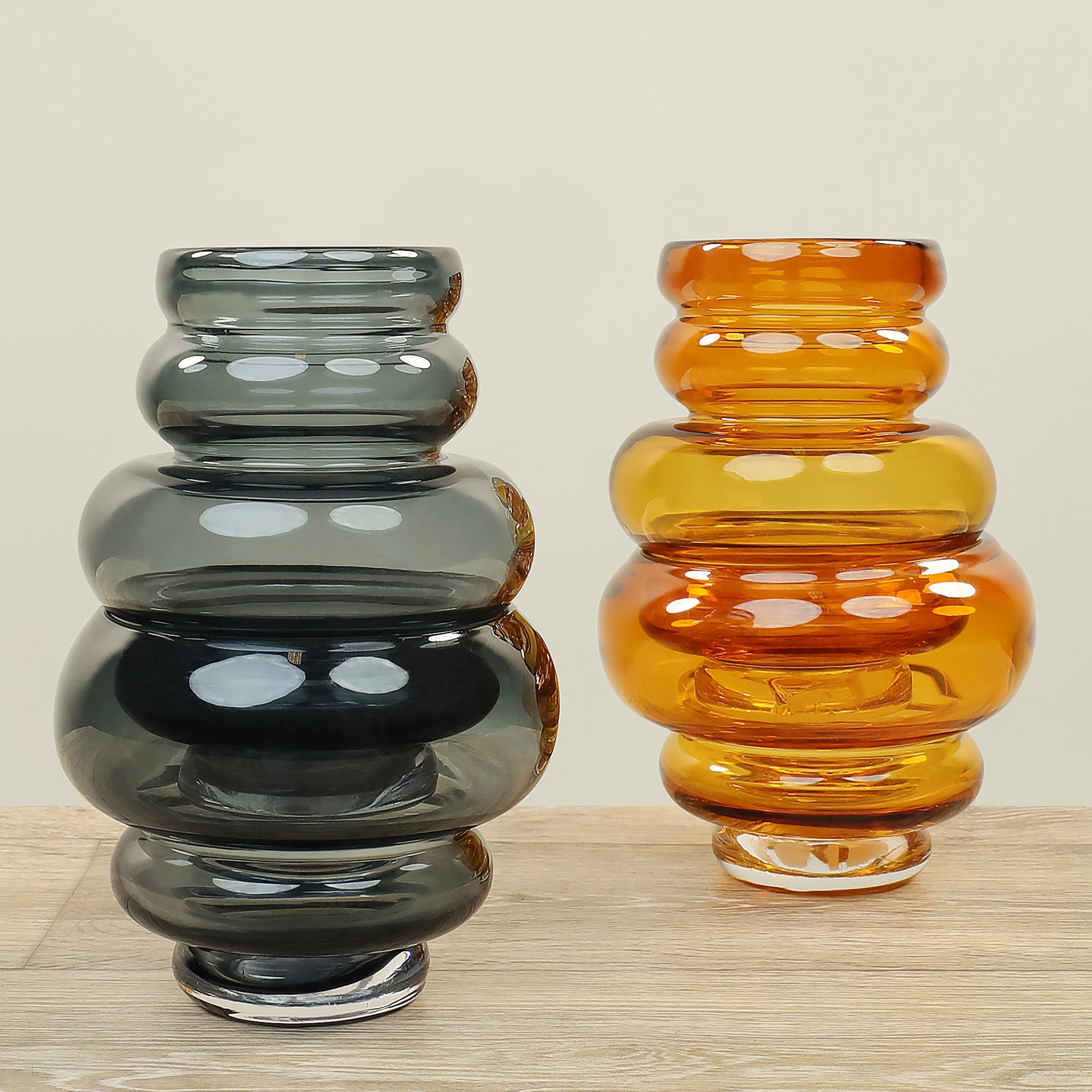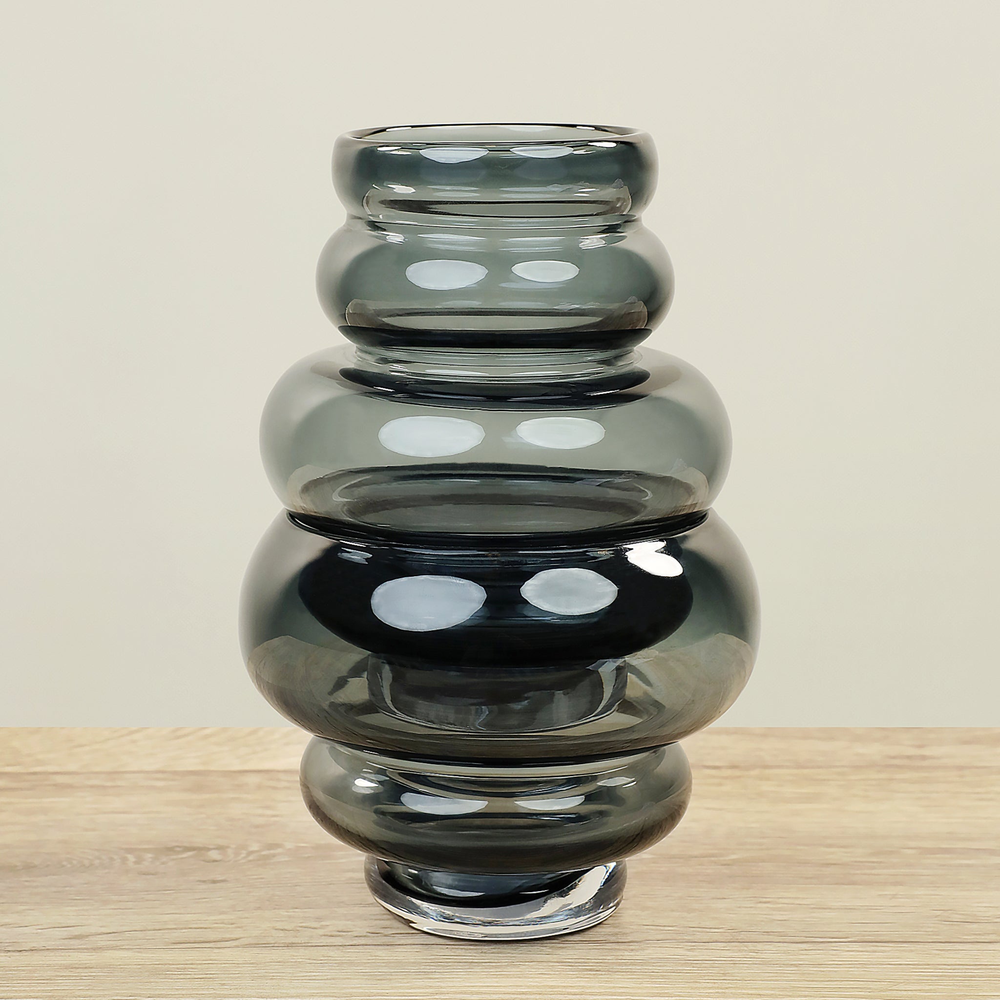 مزهرية زجاجية أنيقة ذات مظهر عصري وفاخر، تجمع بين لون رمادي أردوازي فاتح ولمسات ذهبية غامقة تضيف لمسة من الرقي والدفء إلى أي مساحة.