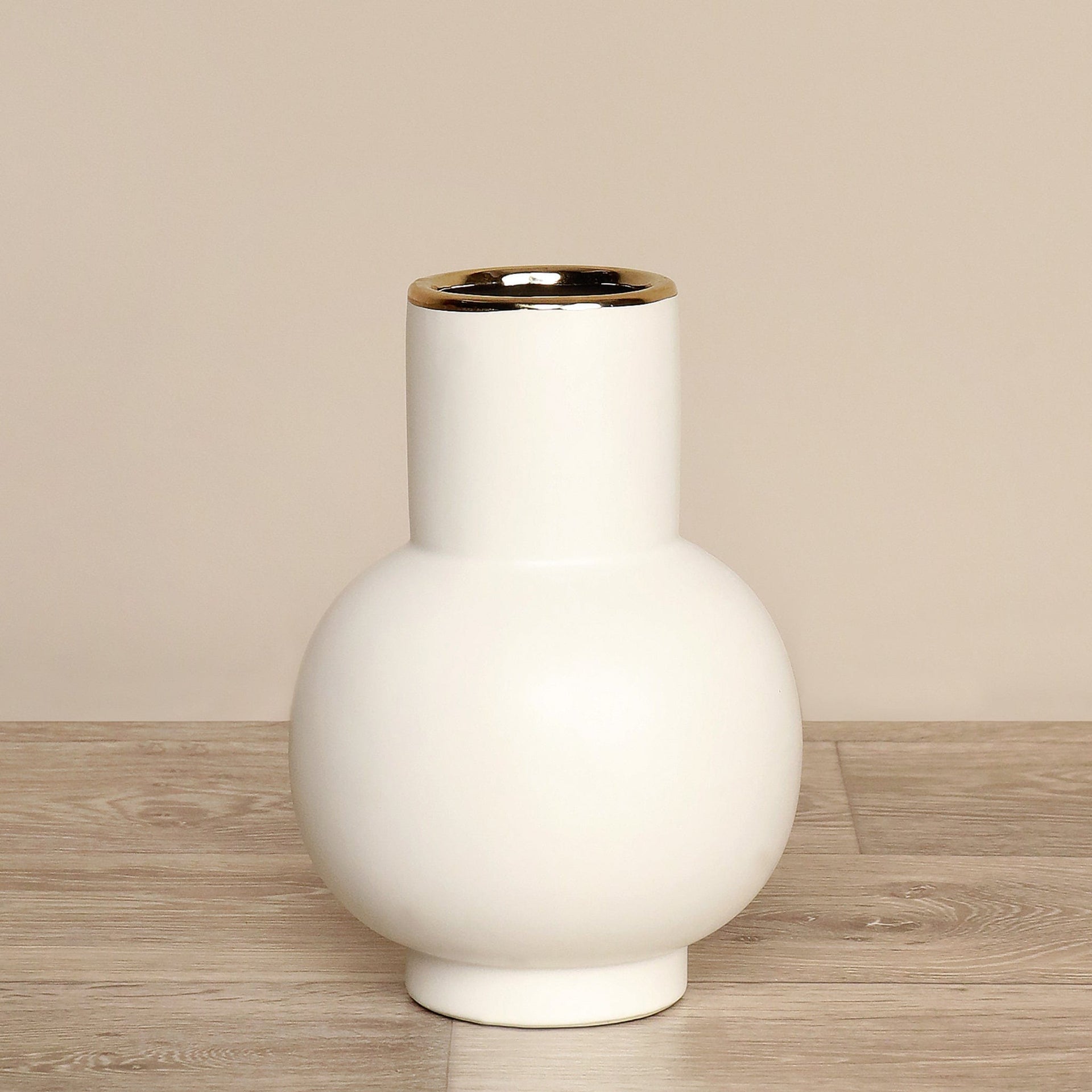 مزهرية خزفية أنيقة بتصميم بسيط ولمسة ذهبية تضيف فخامة إلى أي ركن في المنزل أو المكتب. مناسبة لترتيب زهور طبيعية أو صناعية وتعمل كقطعة ديكور مميزة بمفردها.