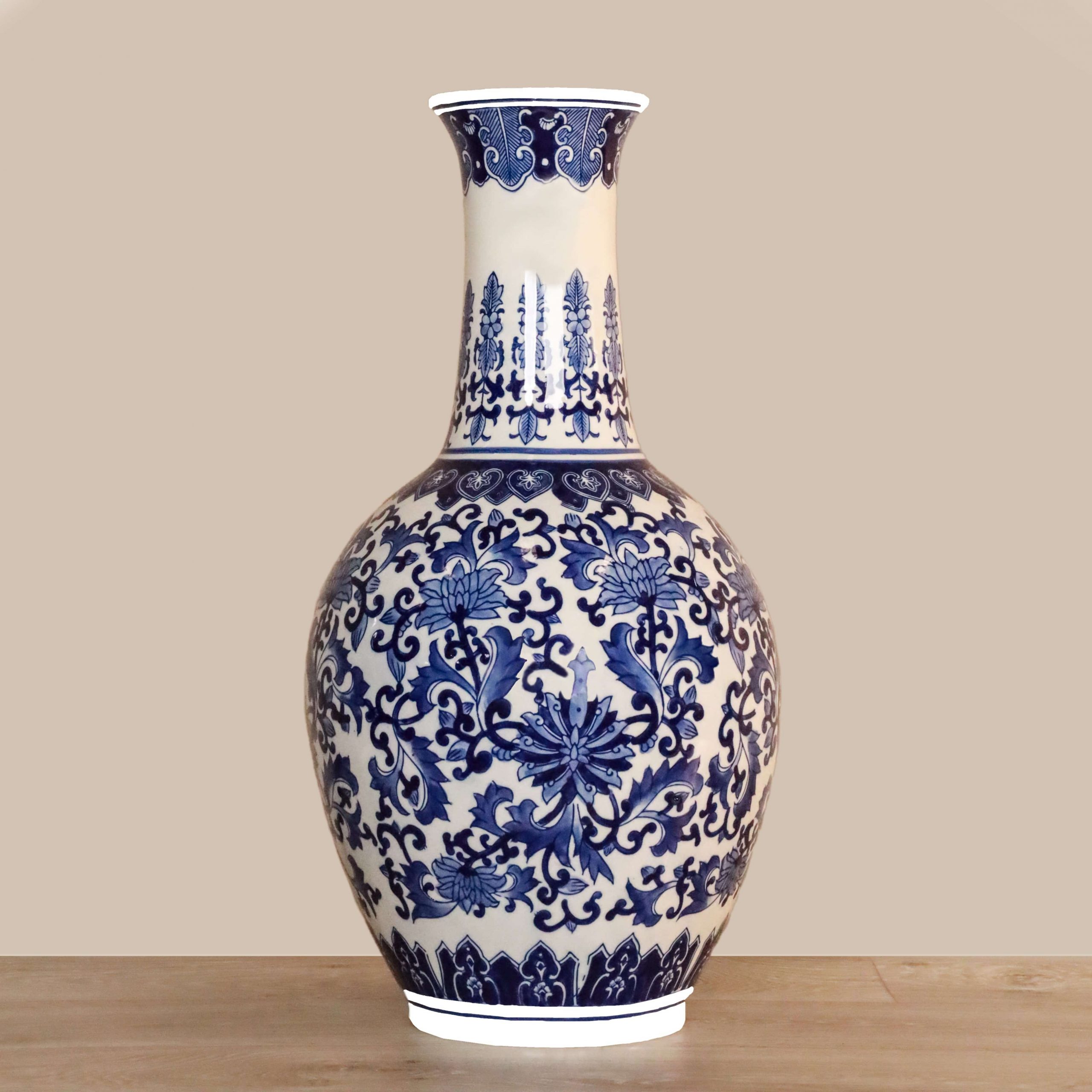 وصف أنيق وعصري يضيف لمسة من الجمال إلى منزلك أو مكتبك — مزهرية خزفية بلونين أبيض وأزرق بتصميم كلاسيكي يناسب مختلف أنماط الديكور.